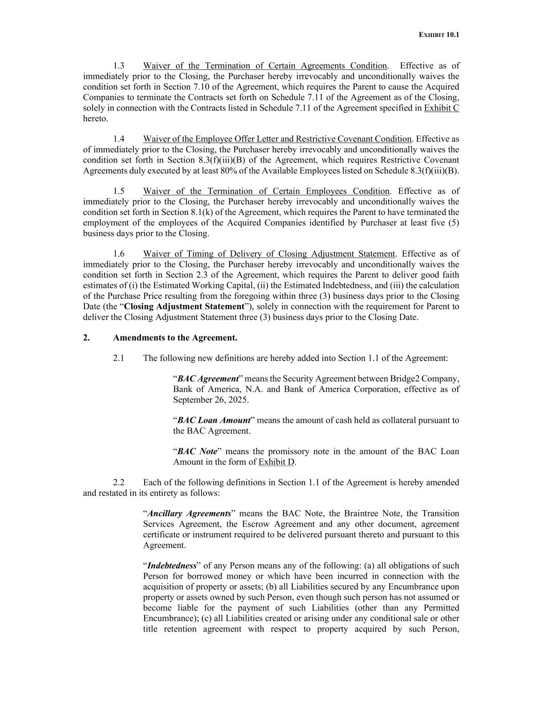 EXHIBIT 10.1 1.3 Waiver of the Termination of Certain Agreements Condition. Effective as of immediately prior to the Closing, the Purchaser hereby irrevocably and unconditionally waives the condition set forth in Section 7.10 of the Agreement, which requires the Parent to cause the Acquired Companies to terminate the Contracts set forth on Schedule 7.11 of the Agreement as of the Closing, solely in connection with the Contracts listed in Schedule 7.11 of the Agreement specified in Exhibit C hereto. 1.4 Waiver of the Employee Offer Letter and Restrictive Covenant Condition. Effective as of immediately prior to the Closing, the Purchaser hereby irrevocably and unconditionally waives the condition set forth in Section 8.3(f)(iii)(B) of the Agreement, which requires Restrictive Covenant Agreements duly executed by at least 80% of the Available Employees listed on Schedule 8.3(f)(iii)(B). 1.5 Waiver of the Termination of Certain Employees Condition. Effective as of immediately prior to the Closing, the Purchaser hereby irrevocably and unconditionally waives the condition set forth in Section 8.1(k) of the Agreement, which requires the Parent to have terminated the employment of the employees of the Acquired Companies identified by Purchaser at least five (5) business days prior to the Closing. 1.6 Waiver of Timing of Delivery of Closing Adjustment Statement. Effective as of immediately prior to the Closing, the Purchaser hereby irrevocably and unconditionally waives the condition set forth in Section 2.3 of the Agreement, which requires the Parent to deliver good faith estimates of (i) the Estimated Working Capital, (ii) the Estimated Indebtedness, and (iii) the calculation of the Purchase Price resulting from the foregoing within three (3) business days prior to the Closing Date (the “Closing Adjustment Statement”), solely in connection with the requirement for Parent to deliver the Closing Adjustment Statement three (3) business days prior to the Closing Date. 2. Amendments to the Agreement. 2.1 The following new definitions are hereby added into Section 1.1 of the Agreement: “BAC Agreement” means the Security Agreement between Bridge2 Company, Bank of America, N.A. and Bank of America Corporation, effective as of September 26, 2025. “BAC Loan Amount” means the amount of cash held as collateral pursuant to the BAC Agreement. “BAC Note” means the promissory note in the amount of the BAC Loan Amount in the form of Exhibit D. 2.2 Each of the following definitions in Section 1.1 of the Agreement is hereby amended and restated in its entirety as follows: “Ancillary Agreements” means the BAC Note, the Braintree Note, the Transition Services Agreement, the Escrow Agreement and any other document, agreement certificate or instrument required to be delivered pursuant thereto and pursuant to this Agreement. “Indebtedness” of any Person means any of the following: (a) all obligations of such Person for borrowed money or which have been incurred in connection with the acquisition of property or assets; (b) all Liabilities secured by any Encumbrance upon property or assets owned by such Person, even though such person has not assumed or become liable for the payment of such Liabilities (other than any Permitted Encumbrance); (c) all Liabilities created or arising under any conditional sale or other title retention agreement with respect to property acquired by such Person,