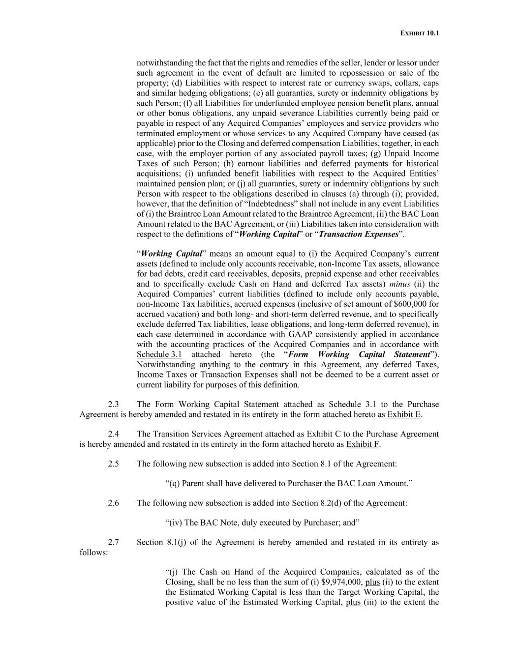 EXHIBIT 10.1 notwithstanding the fact that the rights and remedies of the seller, lender or lessor under such agreement in the event of default are limited to repossession or sale of the property; (d) Liabilities with respect to interest rate or currency swaps, collars, caps and similar hedging obligations; (e) all guaranties, surety or indemnity obligations by such Person; (f) all Liabilities for underfunded employee pension benefit plans, annual or other bonus obligations, any unpaid severance Liabilities currently being paid or payable in respect of any Acquired Companies’ employees and service providers who terminated employment or whose services to any Acquired Company have ceased (as applicable) prior to the Closing and deferred compensation Liabilities, together, in each case, with the employer portion of any associated payroll taxes; (g) Unpaid Income Taxes of such Person; (h) earnout liabilities and deferred payments for historical acquisitions; (i) unfunded benefit liabilities with respect to the Acquired Entities’ maintained pension plan; or (j) all guaranties, surety or indemnity obligations by such Person with respect to the obligations described in clauses (a) through (i); provided, however, that the definition of “Indebtedness” shall not include in any event Liabilities of (i) the Braintree Loan Amount related to the Braintree Agreement, (ii) the BAC Loan Amount related to the BAC Agreement, or (iii) Liabilities taken into consideration with respect to the definitions of “Working Capital” or “Transaction Expenses”. “Working Capital” means an amount equal to (i) the Acquired Company’s current assets (defined to include only accounts receivable, non-Income Tax assets, allowance for bad debts, credit card receivables, deposits, prepaid expense and other receivables and to specifically exclude Cash on Hand and deferred Tax assets) minus (ii) the Acquired Companies’ current liabilities (defined to include only accounts payable, non-Income Tax liabilities, accrued expenses (inclusive of set amount of $600,000 for accrued vacation) and both long- and short-term deferred revenue, and to specifically exclude deferred Tax liabilities, lease obligations, and long-term deferred revenue), in each case determined in accordance with GAAP consistently applied in accordance with the accounting practices of the Acquired Companies and in accordance with Schedule 3.1 attached hereto (the “Form Working Capital Statement”). Notwithstanding anything to the contrary in this Agreement, any deferred Taxes, Income Taxes or Transaction Expenses shall not be deemed to be a current asset or current liability for purposes of this definition. 2.3 The Form Working Capital Statement attached as Schedule 3.1 to the Purchase Agreement is hereby amended and restated in its entirety in the form attached hereto as Exhibit E. 2.4 The Transition Services Agreement attached as Exhibit C to the Purchase Agreement is hereby amended and restated in its entirety in the form attached hereto as Exhibit F. 2.5 The following new subsection is added into Section 8.1 of the Agreement: “(q) Parent shall have delivered to Purchaser the BAC Loan Amount.” 2.6 The following new subsection is added into Section 8.2(d) of the Agreement: “(iv) The BAC Note, duly executed by Purchaser; and” 2.7 Section 8.1(j) of the Agreement is hereby amended and restated in its entirety as follows: “(j) The Cash on Hand of the Acquired Companies, calculated as of the Closing, shall be no less than the sum of (i) $9,974,000, plus (ii) to the extent the Estimated Working Capital is less than the Target Working Capital, the positive value of the Estimated Working Capital, plus (iii) to the extent the