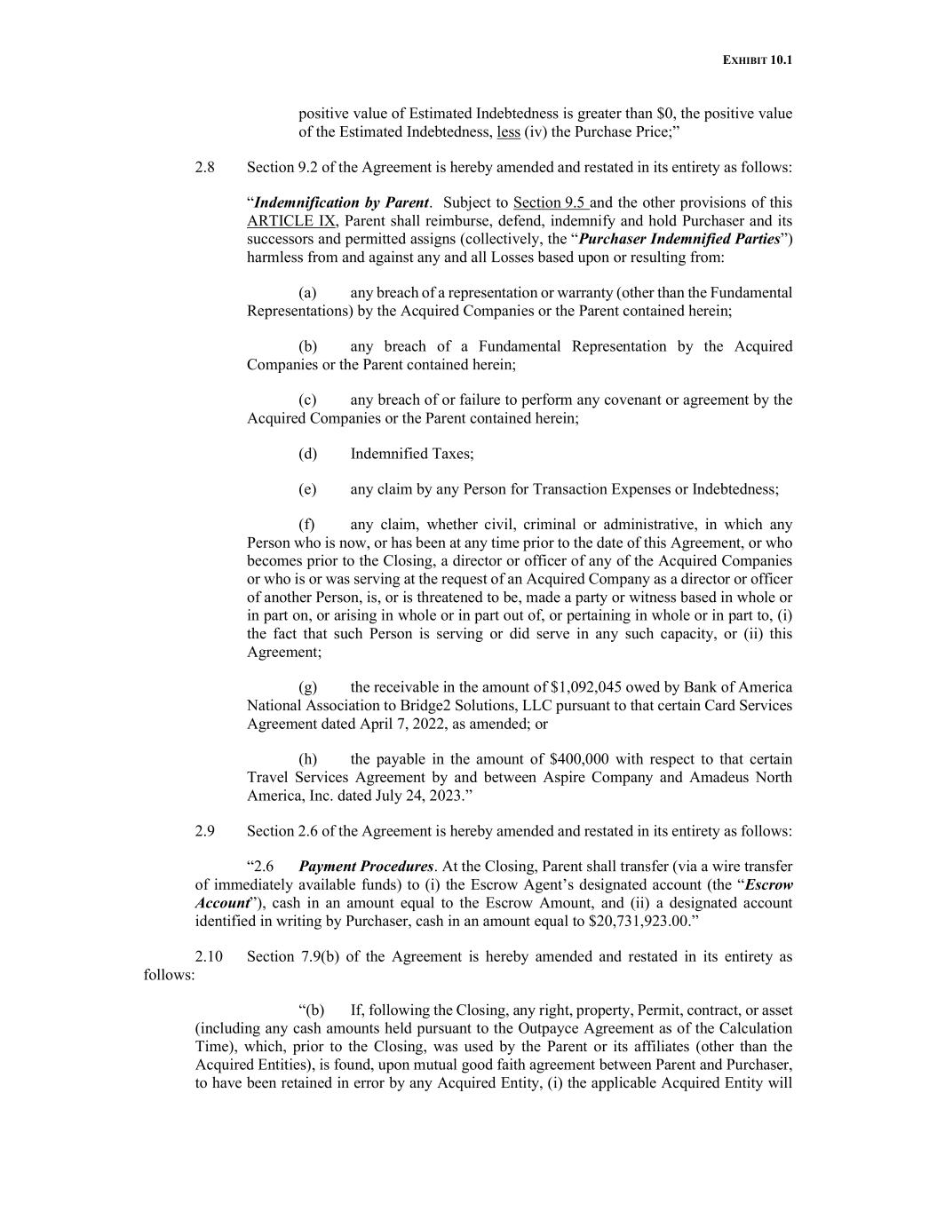 EXHIBIT 10.1 positive value of Estimated Indebtedness is greater than $0, the positive value of the Estimated Indebtedness, less (iv) the Purchase Price;” 2.8 Section 9.2 of the Agreement is hereby amended and restated in its entirety as follows: “Indemnification by Parent. Subject to Section 9.5 and the other provisions of this ARTICLE IX, Parent shall reimburse, defend, indemnify and hold Purchaser and its successors and permitted assigns (collectively, the “Purchaser Indemnified Parties”) harmless from and against any and all Losses based upon or resulting from: (a) any breach of a representation or warranty (other than the Fundamental Representations) by the Acquired Companies or the Parent contained herein; (b) any breach of a Fundamental Representation by the Acquired Companies or the Parent contained herein; (c) any breach of or failure to perform any covenant or agreement by the Acquired Companies or the Parent contained herein; (d) Indemnified Taxes; (e) any claim by any Person for Transaction Expenses or Indebtedness; (f) any claim, whether civil, criminal or administrative, in which any Person who is now, or has been at any time prior to the date of this Agreement, or who becomes prior to the Closing, a director or officer of any of the Acquired Companies or who is or was serving at the request of an Acquired Company as a director or officer of another Person, is, or is threatened to be, made a party or witness based in whole or in part on, or arising in whole or in part out of, or pertaining in whole or in part to, (i) the fact that such Person is serving or did serve in any such capacity, or (ii) this Agreement; (g) the receivable in the amount of $1,092,045 owed by Bank of America National Association to Bridge2 Solutions, LLC pursuant to that certain Card Services Agreement dated April 7, 2022, as amended; or (h) the payable in the amount of $400,000 with respect to that certain Travel Services Agreement by and between Aspire Company and Amadeus North America, Inc. dated July 24, 2023.” 2.9 Section 2.6 of the Agreement is hereby amended and restated in its entirety as follows: “2.6 Payment Procedures. At the Closing, Parent shall transfer (via a wire transfer of immediately available funds) to (i) the Escrow Agent’s designated account (the “Escrow Account”), cash in an amount equal to the Escrow Amount, and (ii) a designated account identified in writing by Purchaser, cash in an amount equal to $20,731,923.00.” 2.10 Section 7.9(b) of the Agreement is hereby amended and restated in its entirety as follows: “(b) If, following the Closing, any right, property, Permit, contract, or asset (including any cash amounts held pursuant to the Outpayce Agreement as of the Calculation Time), which, prior to the Closing, was used by the Parent or its affiliates (other than the Acquired Entities), is found, upon mutual good faith agreement between Parent and Purchaser, to have been retained in error by any Acquired Entity, (i) the applicable Acquired Entity will