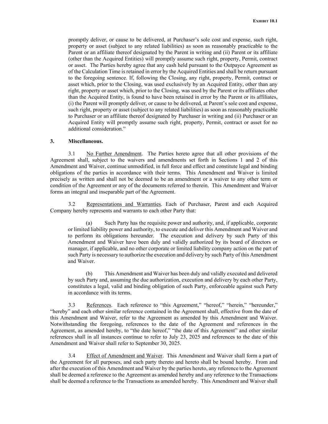 EXHIBIT 10.1 promptly deliver, or cause to be delivered, at Purchaser’s sole cost and expense, such right, property or asset (subject to any related liabilities) as soon as reasonably practicable to the Parent or an affiliate thereof designated by the Parent in writing and (ii) Parent or its affiliate (other than the Acquired Entities) will promptly assume such right, property, Permit, contract or asset. The Parties hereby agree that any cash held pursuant to the Outpayce Agreement as of the Calculation Time is retained in error by the Acquired Entities and shall be return pursuant to the foregoing sentence. If, following the Closing, any right, property, Permit, contract or asset which, prior to the Closing, was used exclusively by an Acquired Entity, other than any right, property or asset which, prior to the Closing, was used by the Parent or its affiliates other than the Acquired Entity, is found to have been retained in error by the Parent or its affiliates, (i) the Parent will promptly deliver, or cause to be delivered, at Parent’s sole cost and expense, such right, property or asset (subject to any related liabilities) as soon as reasonably practicable to Purchaser or an affiliate thereof designated by Purchaser in writing and (ii) Purchaser or an Acquired Entity will promptly assume such right, property, Permit, contract or asset for no additional consideration.” 3. Miscellaneous. 3.1 No Further Amendment. The Parties hereto agree that all other provisions of the Agreement shall, subject to the waivers and amendments set forth in Sections 1 and 2 of this Amendment and Waiver, continue unmodified, in full force and effect and constitute legal and binding obligations of the parties in accordance with their terms. This Amendment and Waiver is limited precisely as written and shall not be deemed to be an amendment or a waiver to any other term or condition of the Agreement or any of the documents referred to therein. This Amendment and Waiver forms an integral and inseparable part of the Agreement. 3.2 Representations and Warranties. Each of Purchaser, Parent and each Acquired Company hereby represents and warrants to each other Party that: (a) Such Party has the requisite power and authority, and, if applicable, corporate or limited liability power and authority, to execute and deliver this Amendment and Waiver and to perform its obligations hereunder. The execution and delivery by such Party of this Amendment and Waiver have been duly and validly authorized by its board of directors or manager, if applicable, and no other corporate or limited liability company action on the part of such Party is necessary to authorize the execution and delivery by such Party of this Amendment and Waiver. (b) This Amendment and Waiver has been duly and validly executed and delivered by such Party and, assuming the due authorization, execution and delivery by each other Party, constitutes a legal, valid and binding obligation of such Party, enforceable against such Party in accordance with its terms. 3.3 References. Each reference to “this Agreement,” “hereof,” “herein,” “hereunder,” “hereby” and each other similar reference contained in the Agreement shall, effective from the date of this Amendment and Waiver, refer to the Agreement as amended by this Amendment and Waiver. Notwithstanding the foregoing, references to the date of the Agreement and references in the Agreement, as amended hereby, to “the date hereof,” “the date of this Agreement” and other similar references shall in all instances continue to refer to July 23, 2025 and references to the date of this Amendment and Waiver shall refer to September 30, 2025. 3.4 Effect of Amendment and Waiver. This Amendment and Waiver shall form a part of the Agreement for all purposes, and each party thereto and hereto shall be bound hereby. From and after the execution of this Amendment and Waiver by the parties hereto, any reference to the Agreement shall be deemed a reference to the Agreement as amended hereby and any reference to the Transactions shall be deemed a reference to the Transactions as amended hereby. This Amendment and Waiver shall