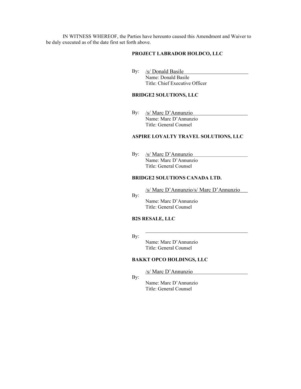 IN WITNESS WHEREOF, the Parties have hereunto caused this Amendment and Waiver to be duly executed as of the date first set forth above. PROJECT LABRADOR HOLDCO, LLC By: /s/ Donald Basile Name: Donald Basile Title: Chief Executive Officer BRIDGE2 SOLUTIONS, LLC By: /s/ Marc D’Annunzio Name: Marc D’Annunzio Title: General Counsel ASPIRE LOYALTY TRAVEL SOLUTIONS, LLC By: /s/ Marc D’Annunzio Name: Marc D’Annunzio Title: General Counsel BRIDGE2 SOLUTIONS CANADA LTD. By: /s/ Marc D’Annunzio/s/ Marc D’Annunzio Name: Marc D’Annunzio Title: General Counsel B2S RESALE, LLC By: Name: Marc D’Annunzio Title: General Counsel BAKKT OPCO HOLDINGS, LLC By: /s/ Marc D’Annunzio Name: Marc D’Annunzio Title: General Counsel