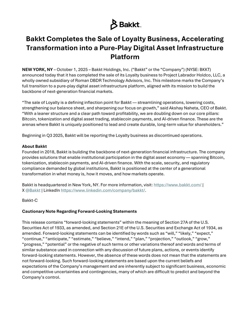 Bakkt Completes the Sale of Loyalty Business, Accelerating Transformation into a Pure-Play Digital Asset Infrastructure Platform NEW YORK, NY – October 1, 2025 – Bakkt Holdings, Inc. (“Bakkt” or the “Company”) (NYSE: BKKT) announced today that it has completed the sale of its Loyalty business to Project Labrador Holdco, LLC, a wholly owned subsidiary of Roman DBDR Technology Advisors, Inc. This milestone marks the Company’s full transition to a pure-play digital asset infrastructure platform, aligned with its mission to build the backbone of next-generation financial markets. “The sale of Loyalty is a defining inflection point for Bakkt — streamlining operations, lowering costs, strengthening our balance sheet, and sharpening our focus on growth,” said Akshay Naheta, CEO of Bakkt. “With a leaner structure and a clear path toward profitability, we are doubling down on our core pillars: Bitcoin, tokenization and digital asset trading, stablecoin payments, and AI-driven finance. These are the arenas where Bakkt is uniquely positioned to lead and create durable, long-term value for shareholders.” Beginning in Q3 2025, Bakkt will be reporting the Loyalty business as discontinued operations. About Bakkt Founded in 2018, Bakkt is building the backbone of next-generation financial infrastructure. The company provides solutions that enable institutional participation in the digital asset economy — spanning Bitcoin, tokenization, stablecoin payments, and AI-driven finance. With the scale, security, and regulatory compliance demanded by global institutions, Bakkt is positioned at the center of a generational transformation in what money is, how it moves, and how markets operate. Bakkt is headquartered in New York, NY. For more information, visit: https://www.bakkt.com/ | X @Bakkt | LinkedIn https://www.linkedin.com/company/bakkt/. Bakkt-C Cautionary Note Regarding Forward-Looking Statements This release contains “forward-looking statements” within the meaning of Section 27A of the U.S. Securities Act of 1933, as amended, and Section 21E of the U.S. Securities and Exchange Act of 1934, as amended. Forward-looking statements can be identified by words such as “will,” “likely,” “expect,” “continue,” “anticipate,” “estimate,” “believe,” “intend,” “plan,” “projection,” “outlook,” “grow,” “progress,” “potential” or the negative of such terms or other variations thereof and words and terms of similar substance used in connection with any discussion of future plans, actions, or events identify forward-looking statements. However, the absence of these words does not mean that the statements are not forward-looking. Such forward-looking statements are based upon the current beliefs and expectations of the Company’s management and are inherently subject to significant business, economic and competitive uncertainties and contingencies, many of which are difficult to predict and beyond the Company’s control.
