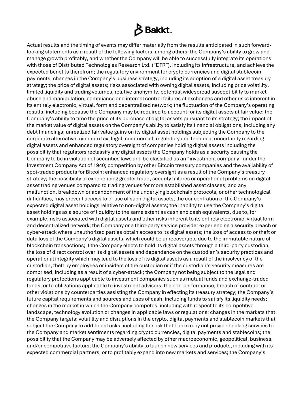 ability to execute its growth strategies, including identifying and executing acquisitions and divestitures and the Company’s initiatives to add new clients; the Company’s ability to reach definitive agreements with its expected commercial counterparties; the Company’s failure to comply with extensive government regulations, oversight, licensure and appraisals; uncertain and evolving regulatory regime governing blockchain technologies, stablecoins, digital payments and crypto; the Company’s ability to establish and maintain effective internal controls and procedures; the exposure to any liability, protracted and costly litigation or reputational damage relating to the Company’s data security; the impact of any goodwill or other intangible assets impairments on the Company’s operating results; the Company’s ability to maintain the listing of its securities on the New York Stock Exchange; and other risks and uncertainties indicated in the Company’s filings with the SEC, including its most recent Annual Report on Form 10-K for the year ended December 31, 2024 and its most recent quarterly report on Form 10-Q for the quarter ended June 30, 2025, and the risks regarding the Company’s adoption of its Treasury Strategy set forth on in Exhibit 99.1 to its Current Report on Form 8-K, dated as of the date hereof. You are cautioned not to place undue reliance on such forward-looking statements. Such forward-looking statements relate only to events as of the date on which such statements are made and are based on information available to us as of the date of this release. For investor and media inquiries, please contact: Investor Relations Yujia Zhai Orange Group yujia@orangegroupadvisors.com Media Luna PR Gregor@lunapr.io Laura@lunapr.io Source: Bakkt Holdings, Inc.