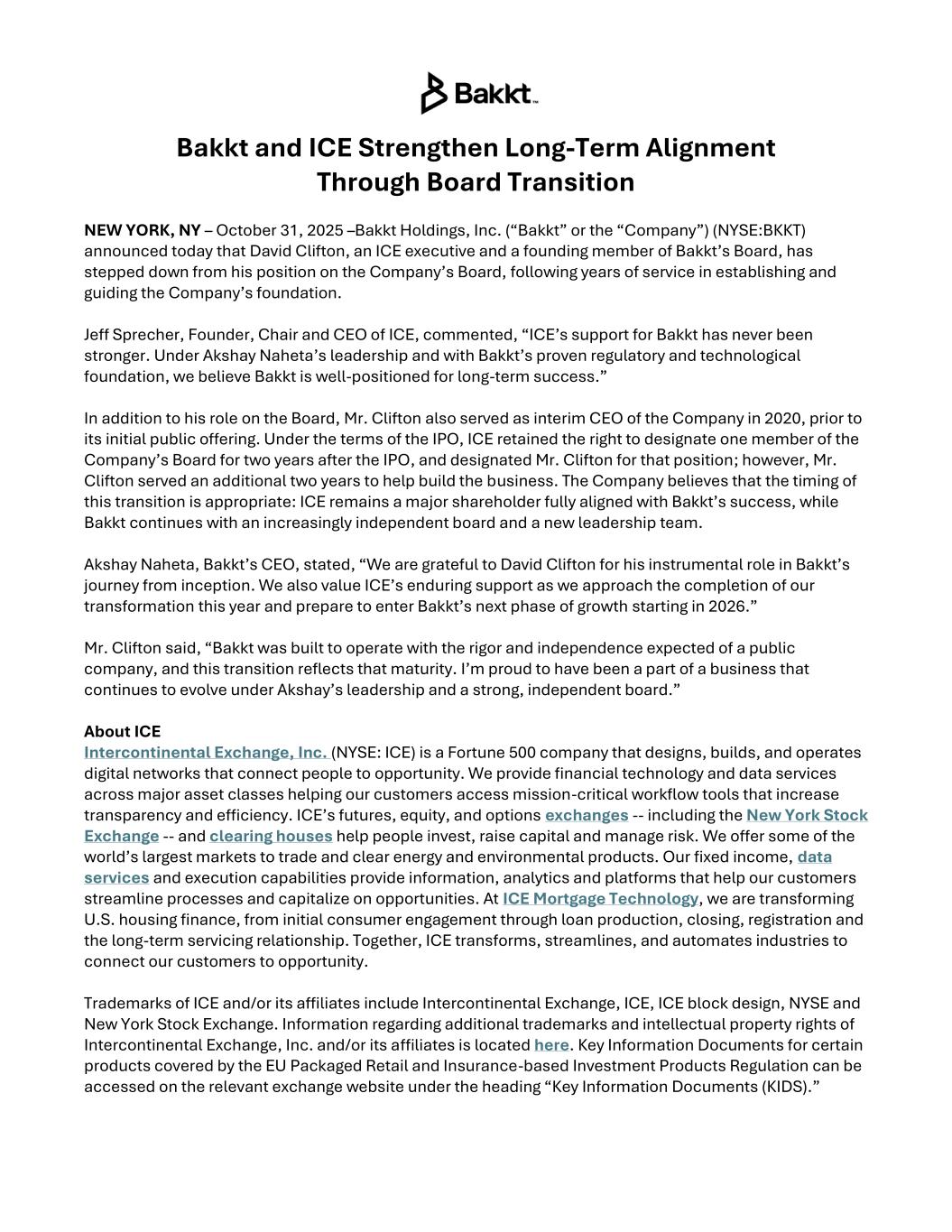 Bakkt and ICE Strengthen Long-Term Alignment Through Board Transition NEW YORK, NY – October 31, 2025 –Bakkt Holdings, Inc. (“Bakkt” or the “Company”) (NYSE:BKKT) announced today that David Clifton, an ICE executive and a founding member of Bakkt’s Board, has stepped down from his position on the Company’s Board, following years of service in establishing and guiding the Company’s foundation. Jeff Sprecher, Founder, Chair and CEO of ICE, commented, “ICE’s support for Bakkt has never been stronger. Under Akshay Naheta’s leadership and with Bakkt’s proven regulatory and technological foundation, we believe Bakkt is well-positioned for long-term success.” In addition to his role on the Board, Mr. Clifton also served as interim CEO of the Company in 2020, prior to its initial public offering. Under the terms of the IPO, ICE retained the right to designate one member of the Company’s Board for two years after the IPO, and designated Mr. Clifton for that position; however, Mr. Clifton served an additional two years to help build the business. The Company believes that the timing of this transition is appropriate: ICE remains a major shareholder fully aligned with Bakkt’s success, while Bakkt continues with an increasingly independent board and a new leadership team. Akshay Naheta, Bakkt’s CEO, stated, “We are grateful to David Clifton for his instrumental role in Bakkt’s journey from inception. We also value ICE’s enduring support as we approach the completion of our transformation this year and prepare to enter Bakkt’s next phase of growth starting in 2026.” Mr. Clifton said, “Bakkt was built to operate with the rigor and independence expected of a public company, and this transition reflects that maturity. I’m proud to have been a part of a business that continues to evolve under Akshay’s leadership and a strong, independent board.” About ICE Intercontinental Exchange, Inc. (NYSE: ICE) is a Fortune 500 company that designs, builds, and operates digital networks that connect people to opportunity. We provide financial technology and data services across major asset classes helping our customers access mission-critical workflow tools that increase transparency and efficiency. ICE’s futures, equity, and options exchanges -- including the New York Stock Exchange -- and clearing houses help people invest, raise capital and manage risk. We offer some of the world’s largest markets to trade and clear energy and environmental products. Our fixed income, data services and execution capabilities provide information, analytics and platforms that help our customers streamline processes and capitalize on opportunities. At ICE Mortgage Technology, we are transforming U.S. housing finance, from initial consumer engagement through loan production, closing, registration and the long-term servicing relationship. Together, ICE transforms, streamlines, and automates industries to connect our customers to opportunity. Trademarks of ICE and/or its affiliates include Intercontinental Exchange, ICE, ICE block design, NYSE and New York Stock Exchange. Information regarding additional trademarks and intellectual property rights of Intercontinental Exchange, Inc. and/or its affiliates is located here. Key Information Documents for certain products covered by the EU Packaged Retail and Insurance-based Investment Products Regulation can be accessed on the relevant exchange website under the heading “Key Information Documents (KIDS).”