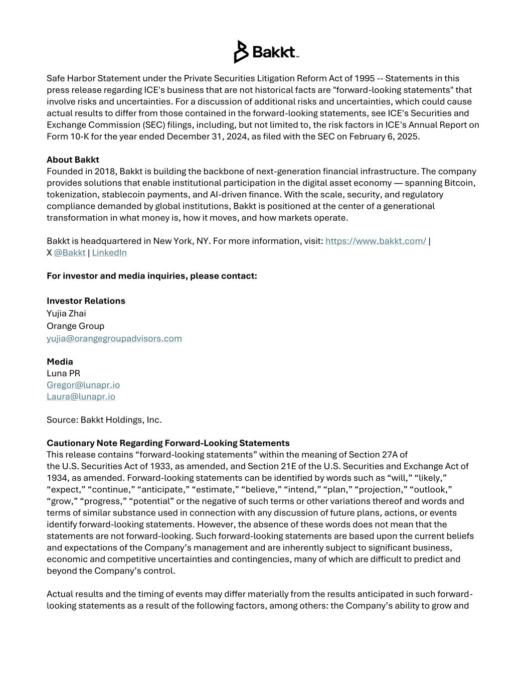 Safe Harbor Statement under the Private Securities Litigation Reform Act of 1995 -- Statements in this press release regarding ICE's business that are not historical facts are "forward-looking statements" that involve risks and uncertainties. For a discussion of additional risks and uncertainties, which could cause actual results to differ from those contained in the forward-looking statements, see ICE's Securities and Exchange Commission (SEC) filings, including, but not limited to, the risk factors in ICE's Annual Report on Form 10-K for the year ended December 31, 2024, as filed with the SEC on February 6, 2025. About Bakkt Founded in 2018, Bakkt is building the backbone of next-generation financial infrastructure. The company provides solutions that enable institutional participation in the digital asset economy — spanning Bitcoin, tokenization, stablecoin payments, and AI-driven finance. With the scale, security, and regulatory compliance demanded by global institutions, Bakkt is positioned at the center of a generational transformation in what money is, how it moves, and how markets operate. Bakkt is headquartered in New York, NY. For more information, visit: https://www.bakkt.com/ | X @Bakkt | LinkedIn For investor and media inquiries, please contact: Investor Relations Yujia Zhai Orange Group yujia@orangegroupadvisors.com Media Luna PR Gregor@lunapr.io Laura@lunapr.io Source: Bakkt Holdings, Inc. Cautionary Note Regarding Forward-Looking Statements This release contains “forward-looking statements” within the meaning of Section 27A of the U.S. Securities Act of 1933, as amended, and Section 21E of the U.S. Securities and Exchange Act of 1934, as amended. Forward-looking statements can be identified by words such as “will,” “likely,” “expect,” “continue,” “anticipate,” “estimate,” “believe,” “intend,” “plan,” “projection,” “outlook,” “grow,” “progress,” “potential” or the negative of such terms or other variations thereof and words and terms of similar substance used in connection with any discussion of future plans, actions, or events identify forward-looking statements. However, the absence of these words does not mean that the statements are not forward-looking. Such forward-looking statements are based upon the current beliefs and expectations of the Company’s management and are inherently subject to significant business, economic and competitive uncertainties and contingencies, many of which are difficult to predict and beyond the Company’s control. Actual results and the timing of events may differ materially from the results anticipated in such forward- looking statements as a result of the following factors, among others: the Company’s ability to grow and