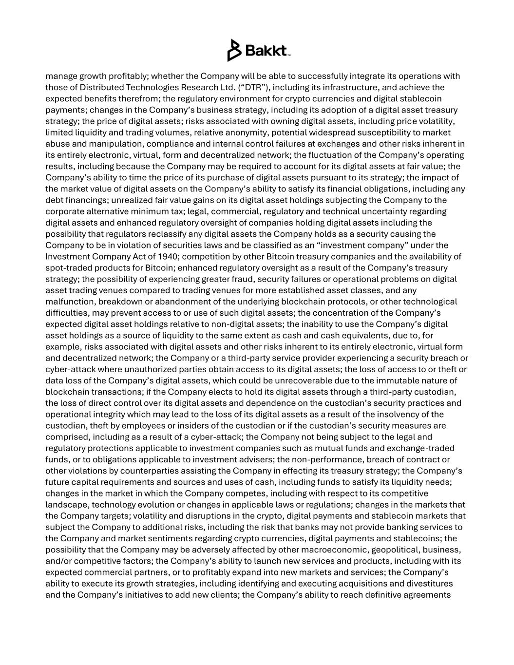 manage growth profitably; whether the Company will be able to successfully integrate its operations with those of Distributed Technologies Research Ltd. (“DTR”), including its infrastructure, and achieve the expected benefits therefrom; the regulatory environment for crypto currencies and digital stablecoin payments; changes in the Company’s business strategy, including its adoption of a digital asset treasury strategy; the price of digital assets; risks associated with owning digital assets, including price volatility, limited liquidity and trading volumes, relative anonymity, potential widespread susceptibility to market abuse and manipulation, compliance and internal control failures at exchanges and other risks inherent in its entirely electronic, virtual, form and decentralized network; the fluctuation of the Company’s operating results, including because the Company may be required to account for its digital assets at fair value; the Company’s ability to time the price of its purchase of digital assets pursuant to its strategy; the impact of the market value of digital assets on the Company’s ability to satisfy its financial obligations, including any debt financings; unrealized fair value gains on its digital asset holdings subjecting the Company to the corporate alternative minimum tax; legal, commercial, regulatory and technical uncertainty regarding digital assets and enhanced regulatory oversight of companies holding digital assets including the possibility that regulators reclassify any digital assets the Company holds as a security causing the Company to be in violation of securities laws and be classified as an “investment company” under the Investment Company Act of 1940; competition by other Bitcoin treasury companies and the availability of spot-traded products for Bitcoin; enhanced regulatory oversight as a result of the Company’s treasury strategy; the possibility of experiencing greater fraud, security failures or operational problems on digital asset trading venues compared to trading venues for more established asset classes, and any malfunction, breakdown or abandonment of the underlying blockchain protocols, or other technological difficulties, may prevent access to or use of such digital assets; the concentration of the Company’s expected digital asset holdings relative to non-digital assets; the inability to use the Company’s digital asset holdings as a source of liquidity to the same extent as cash and cash equivalents, due to, for example, risks associated with digital assets and other risks inherent to its entirely electronic, virtual form and decentralized network; the Company or a third-party service provider experiencing a security breach or cyber-attack where unauthorized parties obtain access to its digital assets; the loss of access to or theft or data loss of the Company’s digital assets, which could be unrecoverable due to the immutable nature of blockchain transactions; if the Company elects to hold its digital assets through a third-party custodian, the loss of direct control over its digital assets and dependence on the custodian’s security practices and operational integrity which may lead to the loss of its digital assets as a result of the insolvency of the custodian, theft by employees or insiders of the custodian or if the custodian’s security measures are comprised, including as a result of a cyber-attack; the Company not being subject to the legal and regulatory protections applicable to investment companies such as mutual funds and exchange-traded funds, or to obligations applicable to investment advisers; the non-performance, breach of contract or other violations by counterparties assisting the Company in effecting its treasury strategy; the Company’s future capital requirements and sources and uses of cash, including funds to satisfy its liquidity needs; changes in the market in which the Company competes, including with respect to its competitive landscape, technology evolution or changes in applicable laws or regulations; changes in the markets that the Company targets; volatility and disruptions in the crypto, digital payments and stablecoin markets that subject the Company to additional risks, including the risk that banks may not provide banking services to the Company and market sentiments regarding crypto currencies, digital payments and stablecoins; the possibility that the Company may be adversely affected by other macroeconomic, geopolitical, business, and/or competitive factors; the Company’s ability to launch new services and products, including with its expected commercial partners, or to profitably expand into new markets and services; the Company’s ability to execute its growth strategies, including identifying and executing acquisitions and divestitures and the Company’s initiatives to add new clients; the Company’s ability to reach definitive agreements