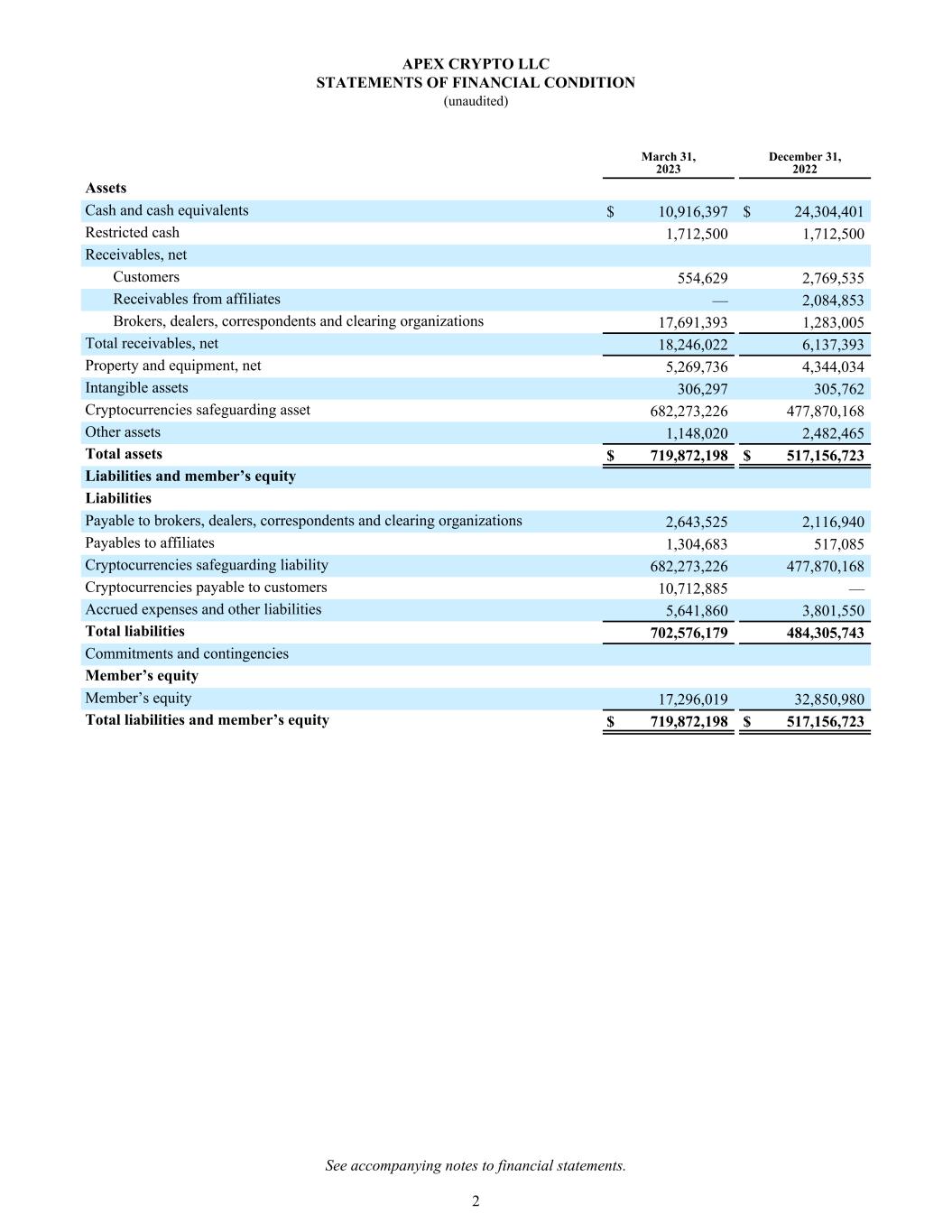 March 31, 2023 December 31, 2022 Assets Cash and cash equivalents $ 10,916,397 $ 24,304,401 Restricted cash 1,712,500 1,712,500 Receivables, net Customers 554,629 2,769,535 Receivables from affiliates — 2,084,853 Brokers, dealers, correspondents and clearing organizations 17,691,393 1,283,005 Total receivables, net 18,246,022 6,137,393 Property and equipment, net 5,269,736 4,344,034 Intangible assets 306,297 305,762 Cryptocurrencies safeguarding asset 682,273,226 477,870,168 Other assets 1,148,020 2,482,465 Total assets $ 719,872,198 $ 517,156,723 Liabilities and member’s equity Liabilities Payable to brokers, dealers, correspondents and clearing organizations 2,643,525 2,116,940 Payables to affiliates 1,304,683 517,085 Cryptocurrencies safeguarding liability 682,273,226 477,870,168 Cryptocurrencies payable to customers 10,712,885 — Accrued expenses and other liabilities 5,641,860 3,801,550 Total liabilities 702,576,179 484,305,743 Commitments and contingencies Member’s equity Member’s equity 17,296,019 32,850,980 Total liabilities and member’s equity $ 719,872,198 $ 517,156,723 APEX CRYPTO LLC STATEMENTS OF FINANCIAL CONDITION (unaudited) See accompanying notes to financial statements. 2