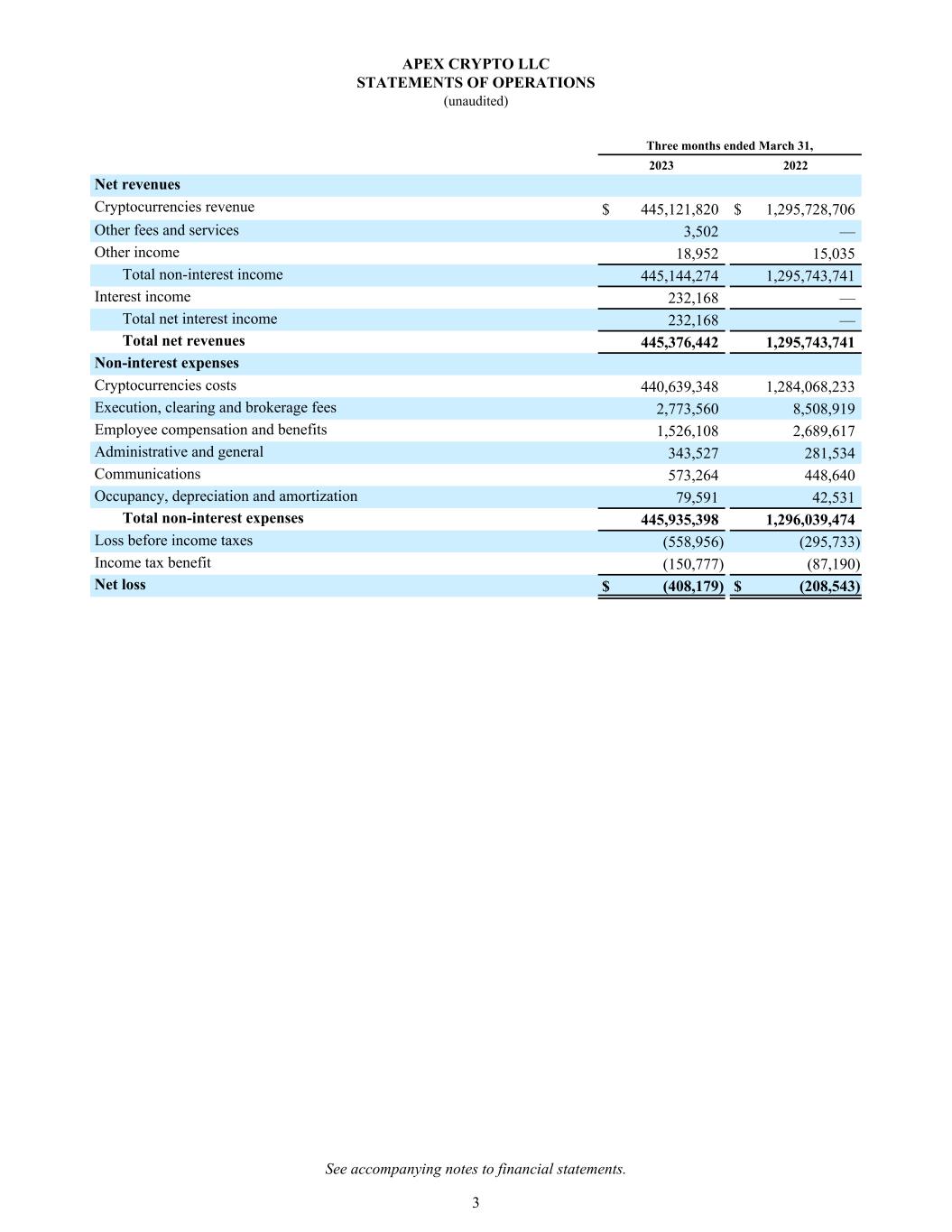 Three months ended March 31, 2023 2022 Net revenues Cryptocurrencies revenue $ 445,121,820 $ 1,295,728,706 Other fees and services 3,502 — Other income 18,952 15,035 Total non-interest income 445,144,274 1,295,743,741 Interest income 232,168 — Total net interest income 232,168 — Total net revenues 445,376,442 1,295,743,741 Non-interest expenses Cryptocurrencies costs 440,639,348 1,284,068,233 Execution, clearing and brokerage fees 2,773,560 8,508,919 Employee compensation and benefits 1,526,108 2,689,617 Administrative and general 343,527 281,534 Communications 573,264 448,640 Occupancy, depreciation and amortization 79,591 42,531 Total non-interest expenses 445,935,398 1,296,039,474 Loss before income taxes (558,956) (295,733) Income tax benefit (150,777) (87,190) Net loss $ (408,179) $ (208,543) APEX CRYPTO LLC STATEMENTS OF OPERATIONS (unaudited) See accompanying notes to financial statements. 3