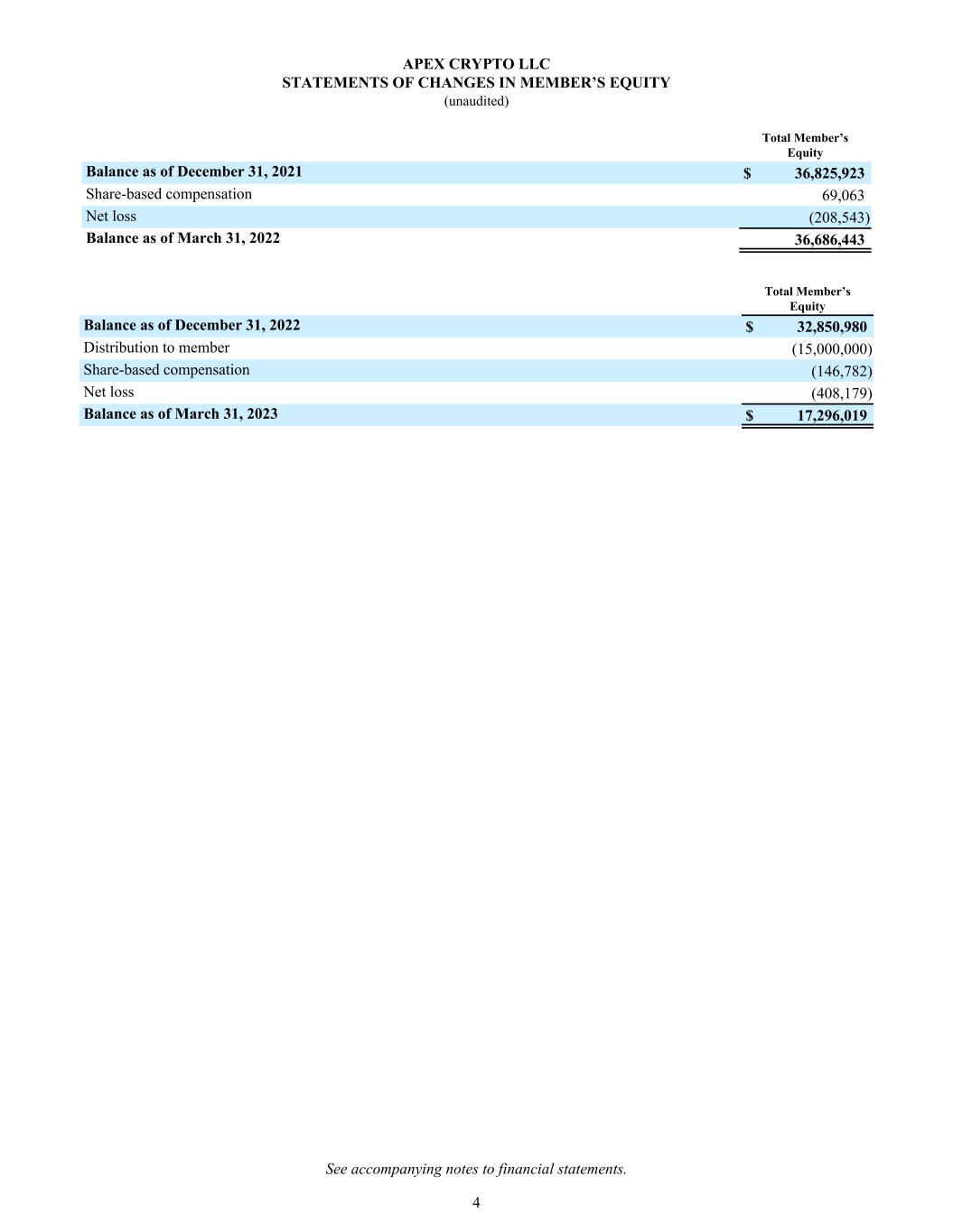 Total Member’s Equity Balance as of December 31, 2021 $ 36,825,923 Share-based compensation 69,063 Net loss (208,543) Balance as of March 31, 2022 36,686,443 Total Member’s Equity Balance as of December 31, 2022 $ 32,850,980 Distribution to member (15,000,000) Share-based compensation (146,782) Net loss (408,179) Balance as of March 31, 2023 $ 17,296,019 APEX CRYPTO LLC STATEMENTS OF CHANGES IN MEMBER’S EQUITY (unaudited) See accompanying notes to financial statements. 4