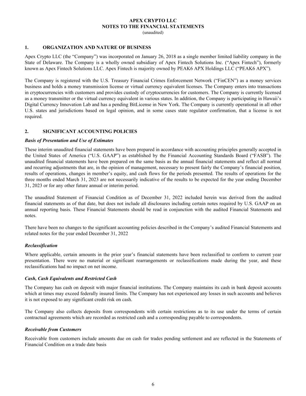 1. ORGANIZATION AND NATURE OF BUSINESS Apex Crypto LLC (the “Company”) was incorporated on January 26, 2018 as a single member limited liability company in the State of Delaware. The Company is a wholly owned subsidiary of Apex Fintech Solutions Inc. (“Apex Fintech”), formerly known as Apex Fintech Solutions LLC. Apex Fintech is majority owned by PEAK6 APX Holdings LLC (“PEAK6 APX”). The Company is registered with the U.S. Treasury Financial Crimes Enforcement Network (“FinCEN”) as a money services business and holds a money transmission license or virtual currency equivalent licenses. The Company enters into transactions in cryptocurrencies with customers and provides custody of cryptocurrencies for customers. The Company is currently licensed as a money transmitter or the virtual currency equivalent in various states. In addition, the Company is participating in Hawaii’s Digital Currency Innovation Lab and has a pending BitLicense in New York. The Company is currently operational in all other U.S. states and jurisdictions based on legal opinion, and in some cases state regulator confirmation, that a license is not required. 2. SIGNIFICANT ACCOUNTING POLICIES Basis of Presentation and Use of Estimates These interim unaudited financial statements have been prepared in accordance with accounting principles generally accepted in the United States of America (“U.S. GAAP”) as established by the Financial Accounting Standards Board (“FASB”). The unaudited financial statements have been prepared on the same basis as the annual financial statements and reflect all normal and recurring adjustments that are, in the opinion of management, necessary to present fairly the Company’s financial position, results of operations, changes in member’s equity, and cash flows for the periods presented. The results of operations for the three months ended March 31, 2023 are not necessarily indicative of the results to be expected for the year ending December 31, 2023 or for any other future annual or interim period. The unaudited Statement of Financial Condition as of December 31, 2022 included herein was derived from the audited financial statements as of that date, but does not include all disclosures including certain notes required by U.S. GAAP on an annual reporting basis. These Financial Statements should be read in conjunction with the audited Financial Statements and notes. There have been no changes to the significant accounting policies described in the Company’s audited Financial Statements and related notes for the year ended December 31, 2022 Reclassification Where applicable, certain amounts in the prior year’s financial statements have been reclassified to conform to current year presentation. There were no material or significant rearrangements or reclassifications made during the year, and these reclassifications had no impact on net income. Cash, Cash Equivalents and Restricted Cash The Company has cash on deposit with major financial institutions. The Company maintains its cash in bank deposit accounts which at times may exceed federally insured limits. The Company has not experienced any losses in such accounts and believes it is not exposed to any significant credit risk on cash. The Company also collects deposits from correspondents with certain restrictions as to its use under the terms of certain contractual agreements which are recorded as restricted cash and a corresponding payable to correspondents. Receivable from Customers Receivable from customers include amounts due on cash for trades pending settlement and are reflected in the Statements of Financial Condition on a trade date basis APEX CRYPTO LLC NOTES TO THE FINANCIAL STATEMENTS (unaudited) 6