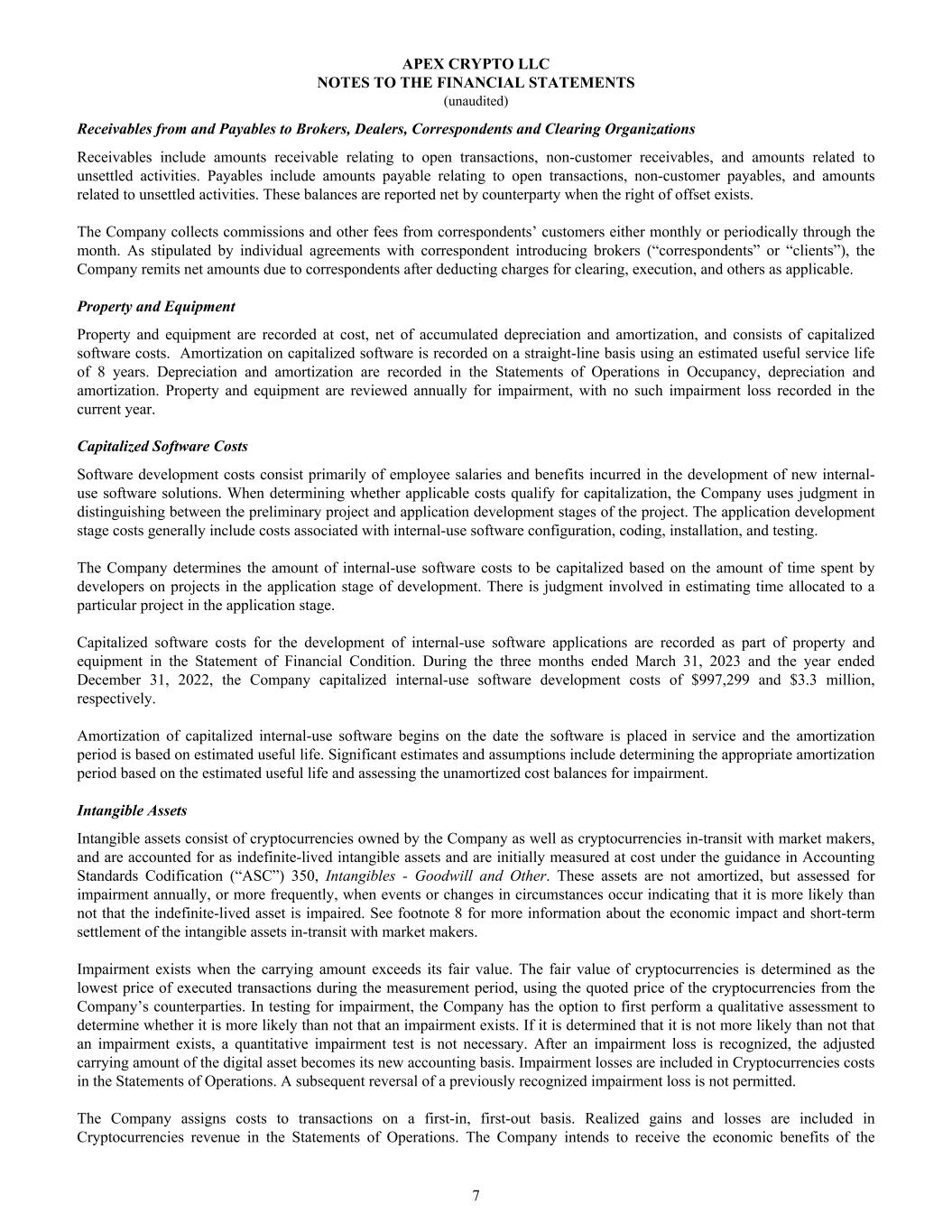 Receivables from and Payables to Brokers, Dealers, Correspondents and Clearing Organizations Receivables include amounts receivable relating to open transactions, non-customer receivables, and amounts related to unsettled activities. Payables include amounts payable relating to open transactions, non-customer payables, and amounts related to unsettled activities. These balances are reported net by counterparty when the right of offset exists. The Company collects commissions and other fees from correspondents’ customers either monthly or periodically through the month. As stipulated by individual agreements with correspondent introducing brokers (“correspondents” or “clients”), the Company remits net amounts due to correspondents after deducting charges for clearing, execution, and others as applicable. Property and Equipment Property and equipment are recorded at cost, net of accumulated depreciation and amortization, and consists of capitalized software costs. Amortization on capitalized software is recorded on a straight-line basis using an estimated useful service life of 8 years. Depreciation and amortization are recorded in the Statements of Operations in Occupancy, depreciation and amortization. Property and equipment are reviewed annually for impairment, with no such impairment loss recorded in the current year. Capitalized Software Costs Software development costs consist primarily of employee salaries and benefits incurred in the development of new internal- use software solutions. When determining whether applicable costs qualify for capitalization, the Company uses judgment in distinguishing between the preliminary project and application development stages of the project. The application development stage costs generally include costs associated with internal-use software configuration, coding, installation, and testing. The Company determines the amount of internal-use software costs to be capitalized based on the amount of time spent by developers on projects in the application stage of development. There is judgment involved in estimating time allocated to a particular project in the application stage. Capitalized software costs for the development of internal-use software applications are recorded as part of property and equipment in the Statement of Financial Condition. During the three months ended March 31, 2023 and the year ended December 31, 2022, the Company capitalized internal-use software development costs of $997,299 and $3.3 million, respectively. Amortization of capitalized internal-use software begins on the date the software is placed in service and the amortization period is based on estimated useful life. Significant estimates and assumptions include determining the appropriate amortization period based on the estimated useful life and assessing the unamortized cost balances for impairment. Intangible Assets Intangible assets consist of cryptocurrencies owned by the Company as well as cryptocurrencies in-transit with market makers, and are accounted for as indefinite-lived intangible assets and are initially measured at cost under the guidance in Accounting Standards Codification (“ASC”) 350, Intangibles - Goodwill and Other. These assets are not amortized, but assessed for impairment annually, or more frequently, when events or changes in circumstances occur indicating that it is more likely than not that the indefinite-lived asset is impaired. See footnote 8 for more information about the economic impact and short-term settlement of the intangible assets in-transit with market makers. Impairment exists when the carrying amount exceeds its fair value. The fair value of cryptocurrencies is determined as the lowest price of executed transactions during the measurement period, using the quoted price of the cryptocurrencies from the Company’s counterparties. In testing for impairment, the Company has the option to first perform a qualitative assessment to determine whether it is more likely than not that an impairment exists. If it is determined that it is not more likely than not that an impairment exists, a quantitative impairment test is not necessary. After an impairment loss is recognized, the adjusted carrying amount of the digital asset becomes its new accounting basis. Impairment losses are included in Cryptocurrencies costs in the Statements of Operations. A subsequent reversal of a previously recognized impairment loss is not permitted. The Company assigns costs to transactions on a first-in, first-out basis. Realized gains and losses are included in Cryptocurrencies revenue in the Statements of Operations. The Company intends to receive the economic benefits of the APEX CRYPTO LLC NOTES TO THE FINANCIAL STATEMENTS (unaudited) 7