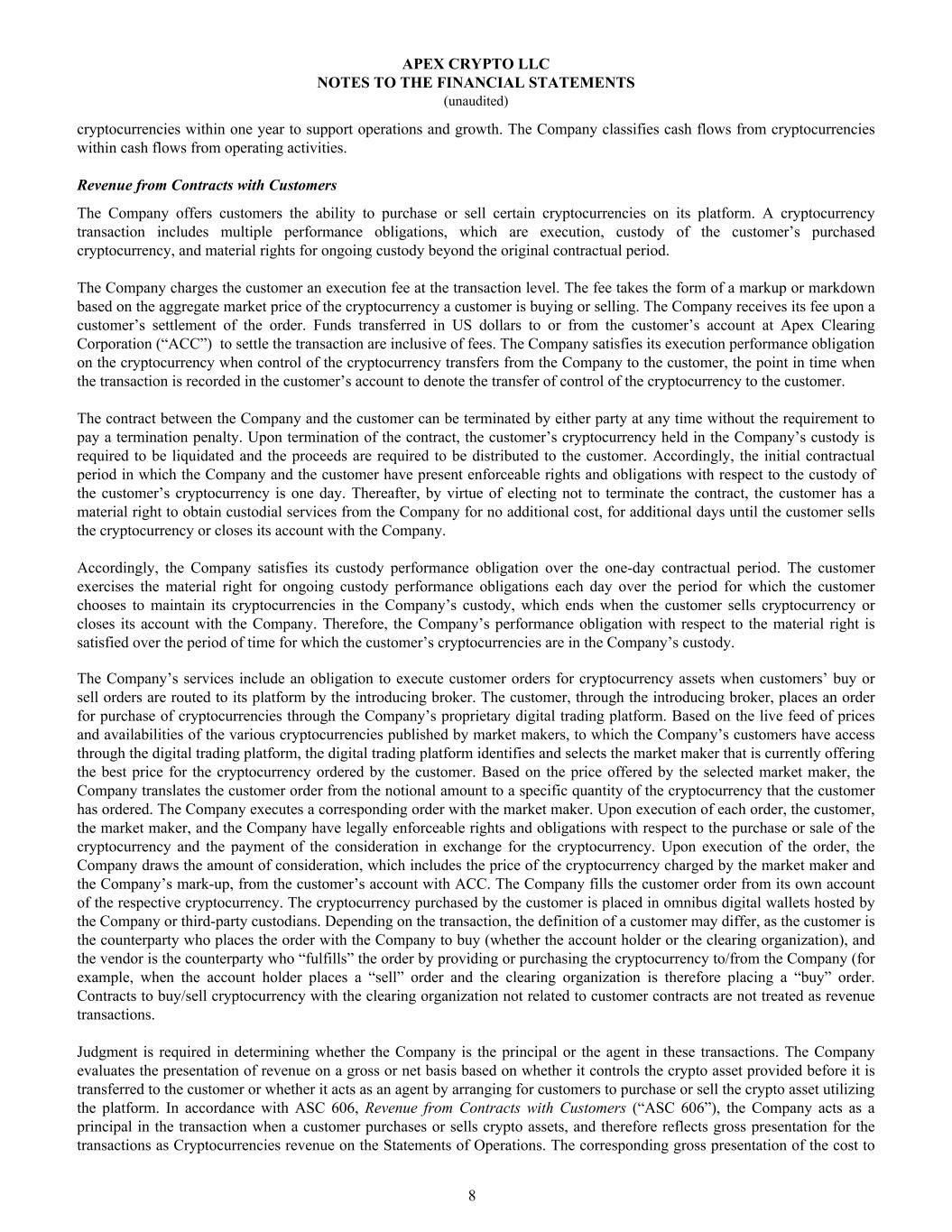 cryptocurrencies within one year to support operations and growth. The Company classifies cash flows from cryptocurrencies within cash flows from operating activities. Revenue from Contracts with Customers The Company offers customers the ability to purchase or sell certain cryptocurrencies on its platform. A cryptocurrency transaction includes multiple performance obligations, which are execution, custody of the customer’s purchased cryptocurrency, and material rights for ongoing custody beyond the original contractual period. The Company charges the customer an execution fee at the transaction level. The fee takes the form of a markup or markdown based on the aggregate market price of the cryptocurrency a customer is buying or selling. The Company receives its fee upon a customer’s settlement of the order. Funds transferred in US dollars to or from the customer’s account at Apex Clearing Corporation (“ACC”) to settle the transaction are inclusive of fees. The Company satisfies its execution performance obligation on the cryptocurrency when control of the cryptocurrency transfers from the Company to the customer, the point in time when the transaction is recorded in the customer’s account to denote the transfer of control of the cryptocurrency to the customer. The contract between the Company and the customer can be terminated by either party at any time without the requirement to pay a termination penalty. Upon termination of the contract, the customer’s cryptocurrency held in the Company’s custody is required to be liquidated and the proceeds are required to be distributed to the customer. Accordingly, the initial contractual period in which the Company and the customer have present enforceable rights and obligations with respect to the custody of the customer’s cryptocurrency is one day. Thereafter, by virtue of electing not to terminate the contract, the customer has a material right to obtain custodial services from the Company for no additional cost, for additional days until the customer sells the cryptocurrency or closes its account with the Company. Accordingly, the Company satisfies its custody performance obligation over the one-day contractual period. The customer exercises the material right for ongoing custody performance obligations each day over the period for which the customer chooses to maintain its cryptocurrencies in the Company’s custody, which ends when the customer sells cryptocurrency or closes its account with the Company. Therefore, the Company’s performance obligation with respect to the material right is satisfied over the period of time for which the customer’s cryptocurrencies are in the Company’s custody. The Company’s services include an obligation to execute customer orders for cryptocurrency assets when customers’ buy or sell orders are routed to its platform by the introducing broker. The customer, through the introducing broker, places an order for purchase of cryptocurrencies through the Company’s proprietary digital trading platform. Based on the live feed of prices and availabilities of the various cryptocurrencies published by market makers, to which the Company’s customers have access through the digital trading platform, the digital trading platform identifies and selects the market maker that is currently offering the best price for the cryptocurrency ordered by the customer. Based on the price offered by the selected market maker, the Company translates the customer order from the notional amount to a specific quantity of the cryptocurrency that the customer has ordered. The Company executes a corresponding order with the market maker. Upon execution of each order, the customer, the market maker, and the Company have legally enforceable rights and obligations with respect to the purchase or sale of the cryptocurrency and the payment of the consideration in exchange for the cryptocurrency. Upon execution of the order, the Company draws the amount of consideration, which includes the price of the cryptocurrency charged by the market maker and the Company’s mark-up, from the customer’s account with ACC. The Company fills the customer order from its own account of the respective cryptocurrency. The cryptocurrency purchased by the customer is placed in omnibus digital wallets hosted by the Company or third-party custodians. Depending on the transaction, the definition of a customer may differ, as the customer is the counterparty who places the order with the Company to buy (whether the account holder or the clearing organization), and the vendor is the counterparty who “fulfills” the order by providing or purchasing the cryptocurrency to/from the Company (for example, when the account holder places a “sell” order and the clearing organization is therefore placing a “buy” order. Contracts to buy/sell cryptocurrency with the clearing organization not related to customer contracts are not treated as revenue transactions. Judgment is required in determining whether the Company is the principal or the agent in these transactions. The Company evaluates the presentation of revenue on a gross or net basis based on whether it controls the crypto asset provided before it is transferred to the customer or whether it acts as an agent by arranging for customers to purchase or sell the crypto asset utilizing the platform. In accordance with ASC 606, Revenue from Contracts with Customers (“ASC 606”), the Company acts as a principal in the transaction when a customer purchases or sells crypto assets, and therefore reflects gross presentation for the transactions as Cryptocurrencies revenue on the Statements of Operations. The corresponding gross presentation of the cost to APEX CRYPTO LLC NOTES TO THE FINANCIAL STATEMENTS (unaudited) 8