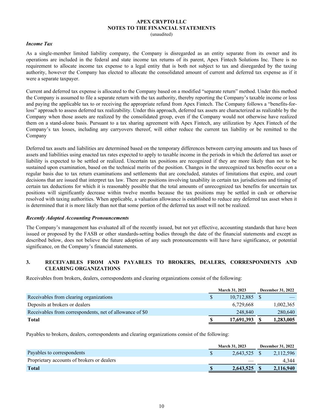 Income Tax As a single-member limited liability company, the Company is disregarded as an entity separate from its owner and its operations are included in the federal and state income tax returns of its parent, Apex Fintech Solutions Inc. There is no requirement to allocate income tax expense to a legal entity that is both not subject to tax and disregarded by the taxing authority, however the Company has elected to allocate the consolidated amount of current and deferred tax expense as if it were a separate taxpayer. Current and deferred tax expense is allocated to the Company based on a modified “separate return” method. Under this method the Company is assumed to file a separate return with the tax authority, thereby reporting the Company’s taxable income or loss and paying the applicable tax to or receiving the appropriate refund from Apex Fintech. The Company follows a “benefits-for- loss” approach to assess deferred tax realizability. Under this approach, deferred tax assets are characterized as realizable by the Company when those assets are realized by the consolidated group, even if the Company would not otherwise have realized them on a stand-alone basis. Pursuant to a tax sharing agreement with Apex Fintech, any utilization by Apex Fintech of the Company’s tax losses, including any carryovers thereof, will either reduce the current tax liability or be remitted to the Company Deferred tax assets and liabilities are determined based on the temporary differences between carrying amounts and tax bases of assets and liabilities using enacted tax rates expected to apply to taxable income in the periods in which the deferred tax asset or liability is expected to be settled or realized. Uncertain tax positions are recognized if they are more likely than not to be sustained upon examination, based on the technical merits of the position. Changes in the unrecognized tax benefits occur on a regular basis due to tax return examinations and settlements that are concluded, statutes of limitations that expire, and court decisions that are issued that interpret tax law. There are positions involving taxability in certain tax jurisdictions and timing of certain tax deductions for which it is reasonably possible that the total amounts of unrecognized tax benefits for uncertain tax positions will significantly decrease within twelve months because the tax positions may be settled in cash or otherwise resolved with taxing authorities. When applicable, a valuation allowance is established to reduce any deferred tax asset when it is determined that it is more likely than not that some portion of the deferred tax asset will not be realized. Recently Adopted Accounting Pronouncements The Company’s management has evaluated all of the recently issued, but not yet effective, accounting standards that have been issued or proposed by the FASB or other standards-setting bodies through the date of the financial statements and except as described below, does not believe the future adoption of any such pronouncements will have have significance, or potential significance, on the Company’s financial statements. 3. RECEIVABLES FROM AND PAYABLES TO BROKERS, DEALERS, CORRESPONDENTS AND CLEARING ORGANIZATIONS Receivables from brokers, dealers, correspondents and clearing organizations consist of the following: March 31, 2023 December 31, 2022 Receivables from clearing organizations $ 10,712,885 $ — Deposits at brokers or dealers 6,729,668 1,002,365 Receivables from correspondents, net of allowance of $0 248,840 280,640 Total $ 17,691,393 $ 1,283,005 Payables to brokers, dealers, correspondents and clearing organizations consist of the following: March 31, 2023 December 31, 2022 Payables to correspondents $ 2,643,525 $ 2,112,596 Proprietary accounts of brokers or dealers — 4,344 Total $ 2,643,525 $ 2,116,940 APEX CRYPTO LLC NOTES TO THE FINANCIAL STATEMENTS (unaudited) 10