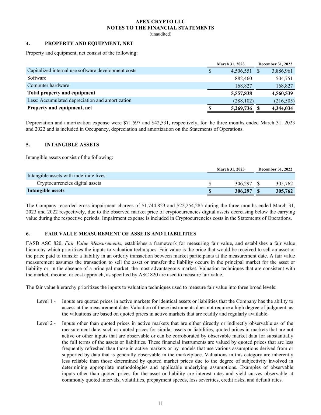 4. PROPERTY AND EQUIPMENT, NET Property and equipment, net consist of the following: March 31, 2023 December 31, 2022 Capitalized internal use software development costs $ 4,506,551 $ 3,886,961 Software 882,460 504,751 Computer hardware 168,827 168,827 Total property and equipment 5,557,838 4,560,539 Less: Accumulated depreciation and amortization (288,102) (216,505) Property and equipment, net $ 5,269,736 $ 4,344,034 Depreciation and amortization expense were $71,597 and $42,531, respectively, for the three months ended March 31, 2023 and 2022 and is included in Occupancy, depreciation and amortization on the Statements of Operations. 5. INTANGIBLE ASSETS Intangible assets consist of the following: March 31, 2023 December 31, 2022 Intangible assets with indefinite lives: Cryptocurrencies digital assets $ 306,297 $ 305,762 Intangible assets $ 306,297 $ 305,762 The Company recorded gross impairment charges of $1,744,823 and $22,254,285 during the three months ended March 31, 2023 and 2022 respectively, due to the observed market price of cryptocurrencies digital assets decreasing below the carrying value during the respective periods. Impairment expense is included in Cryptocurrencies costs in the Statements of Operations. 6. FAIR VALUE MEASUREMENT OF ASSETS AND LIABILITIES FASB ASC 820, Fair Value Measurements, establishes a framework for measuring fair value, and establishes a fair value hierarchy which prioritizes the inputs to valuation techniques. Fair value is the price that would be received to sell an asset or the price paid to transfer a liability in an orderly transaction between market participants at the measurement date. A fair value measurement assumes the transaction to sell the asset or transfer the liability occurs in the principal market for the asset or liability or, in the absence of a principal market, the most advantageous market. Valuation techniques that are consistent with the market, income, or cost approach, as specified by ASC 820 are used to measure fair value. The fair value hierarchy prioritizes the inputs to valuation techniques used to measure fair value into three broad levels: Level 1 - Inputs are quoted prices in active markets for identical assets or liabilities that the Company has the ability to access at the measurement date. Valuation of these instruments does not require a high degree of judgment, as the valuations are based on quoted prices in active markets that are readily and regularly available. Level 2 - Inputs other than quoted prices in active markets that are either directly or indirectly observable as of the measurement date, such as quoted prices for similar assets or liabilities, quoted prices in markets that are not active or other inputs that are observable or can be corroborated by observable market data for substantially the full terms of the assets or liabilities. These financial instruments are valued by quoted prices that are less frequently refreshed than those in active markets or by models that use various assumptions derived from or supported by data that is generally observable in the marketplace. Valuations in this category are inherently less reliable than those determined by quoted market prices due to the degree of subjectivity involved in determining appropriate methodologies and applicable underlying assumptions. Examples of observable inputs other than quoted prices for the asset or liability are interest rates and yield curves observable at commonly quoted intervals, volatilities, prepayment speeds, loss severities, credit risks, and default rates. APEX CRYPTO LLC NOTES TO THE FINANCIAL STATEMENTS (unaudited) 11
