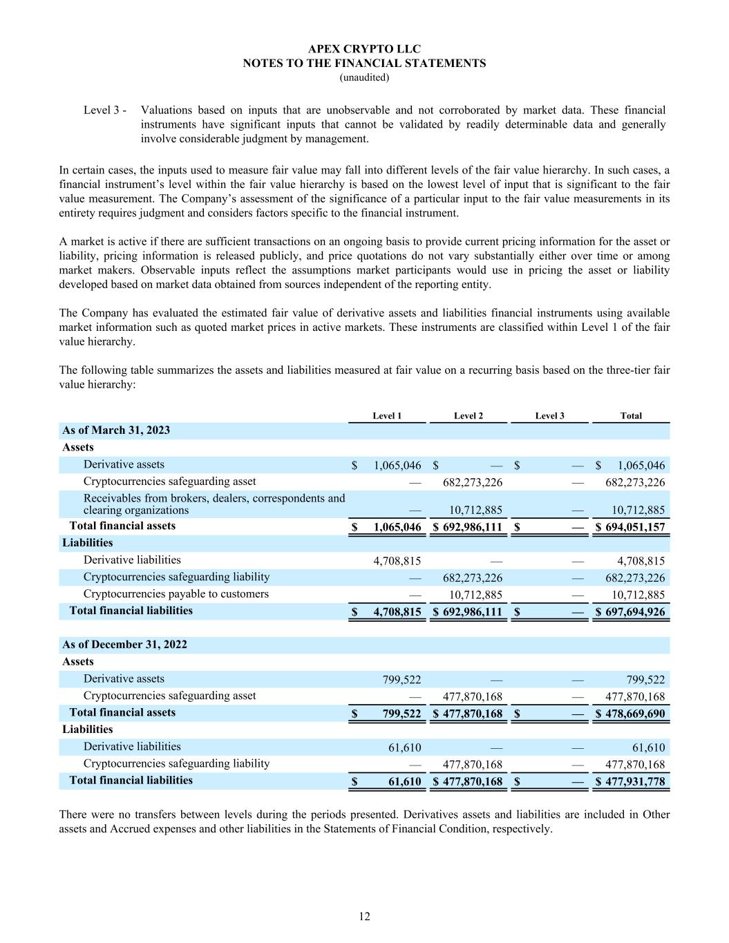Level 3 - Valuations based on inputs that are unobservable and not corroborated by market data. These financial instruments have significant inputs that cannot be validated by readily determinable data and generally involve considerable judgment by management. In certain cases, the inputs used to measure fair value may fall into different levels of the fair value hierarchy. In such cases, a financial instrument’s level within the fair value hierarchy is based on the lowest level of input that is significant to the fair value measurement. The Company’s assessment of the significance of a particular input to the fair value measurements in its entirety requires judgment and considers factors specific to the financial instrument. A market is active if there are sufficient transactions on an ongoing basis to provide current pricing information for the asset or liability, pricing information is released publicly, and price quotations do not vary substantially either over time or among market makers. Observable inputs reflect the assumptions market participants would use in pricing the asset or liability developed based on market data obtained from sources independent of the reporting entity. The Company has evaluated the estimated fair value of derivative assets and liabilities financial instruments using available market information such as quoted market prices in active markets. These instruments are classified within Level 1 of the fair value hierarchy. The following table summarizes the assets and liabilities measured at fair value on a recurring basis based on the three-tier fair value hierarchy: Level 1 Level 2 Level 3 Total As of March 31, 2023 Assets Derivative assets $ 1,065,046 $ — $ — $ 1,065,046 Cryptocurrencies safeguarding asset — 682,273,226 — 682,273,226 Receivables from brokers, dealers, correspondents and clearing organizations — 10,712,885 — 10,712,885 Total financial assets $ 1,065,046 $ 692,986,111 $ — $ 694,051,157 Liabilities Derivative liabilities 4,708,815 — — 4,708,815 Cryptocurrencies safeguarding liability — 682,273,226 — 682,273,226 Cryptocurrencies payable to customers — 10,712,885 — 10,712,885 Total financial liabilities $ 4,708,815 $ 692,986,111 $ — $ 697,694,926 As of December 31, 2022 Assets Derivative assets 799,522 — — 799,522 Cryptocurrencies safeguarding asset — 477,870,168 — 477,870,168 Total financial assets $ 799,522 $ 477,870,168 $ — $ 478,669,690 Liabilities Derivative liabilities 61,610 — — 61,610 Cryptocurrencies safeguarding liability — 477,870,168 — 477,870,168 Total financial liabilities $ 61,610 $ 477,870,168 $ — $ 477,931,778 There were no transfers between levels during the periods presented. Derivatives assets and liabilities are included in Other assets and Accrued expenses and other liabilities in the Statements of Financial Condition, respectively. APEX CRYPTO LLC NOTES TO THE FINANCIAL STATEMENTS (unaudited) 12