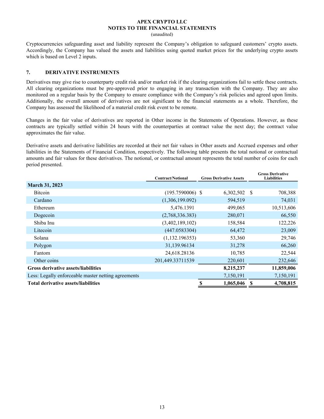 Cryptocurrencies safeguarding asset and liability represent the Company’s obligation to safeguard customers’ crypto assets. Accordingly, the Company has valued the assets and liabilities using quoted market prices for the underlying crypto assets which is based on Level 2 inputs. 7. DERIVATIVE INSTRUMENTS Derivatives may give rise to counterparty credit risk and/or market risk if the clearing organizations fail to settle these contracts. All clearing organizations must be pre-approved prior to engaging in any transaction with the Company. They are also monitored on a regular basis by the Company to ensure compliance with the Company’s risk policies and agreed upon limits. Additionally, the overall amount of derivatives are not significant to the financial statements as a whole. Therefore, the Company has assessed the likelihood of a material credit risk event to be remote. Changes in the fair value of derivatives are reported in Other income in the Statements of Operations. However, as these contracts are typically settled within 24 hours with the counterparties at contract value the next day; the contract value approximates the fair value. Derivative assets and derivative liabilities are recorded at their net fair values in Other assets and Accrued expenses and other liabilities in the Statements of Financial Condition, respectively. The following table presents the total notional or contractual amounts and fair values for these derivatives. The notional, or contractual amount represents the total number of coins for each period presented. March 31, 2023 Bitcoin (195.7590006) $ 6,302,502 $ 708,388 Cardano (1,306,199.092) 594,519 74,031 Ethereum 5,476.1391 499,065 10,513,606 Dogecoin (2,768,336.383) 280,071 66,550 Shiba Inu (3,402,189,102) 158,584 122,226 Litecoin (447.0583304) 64,472 23,009 Solana (1,132.196353) 53,360 29,746 Polygon 31,139.96134 31,278 66,260 Fantom 24,618.28136 10,785 22,544 Other coins 201,449.33711539 220,601 232,646 Gross derivative assets/liabilities 8,215,237 11,859,006 Less: Legally enforceable master netting agreements 7,150,191 7,150,191 Total derivative assets/liabilities $ 1,065,046 $ 4,708,815 Contract/Notional Gross Derivative Assets Gross Derivative Liabilities APEX CRYPTO LLC NOTES TO THE FINANCIAL STATEMENTS (unaudited) 13
