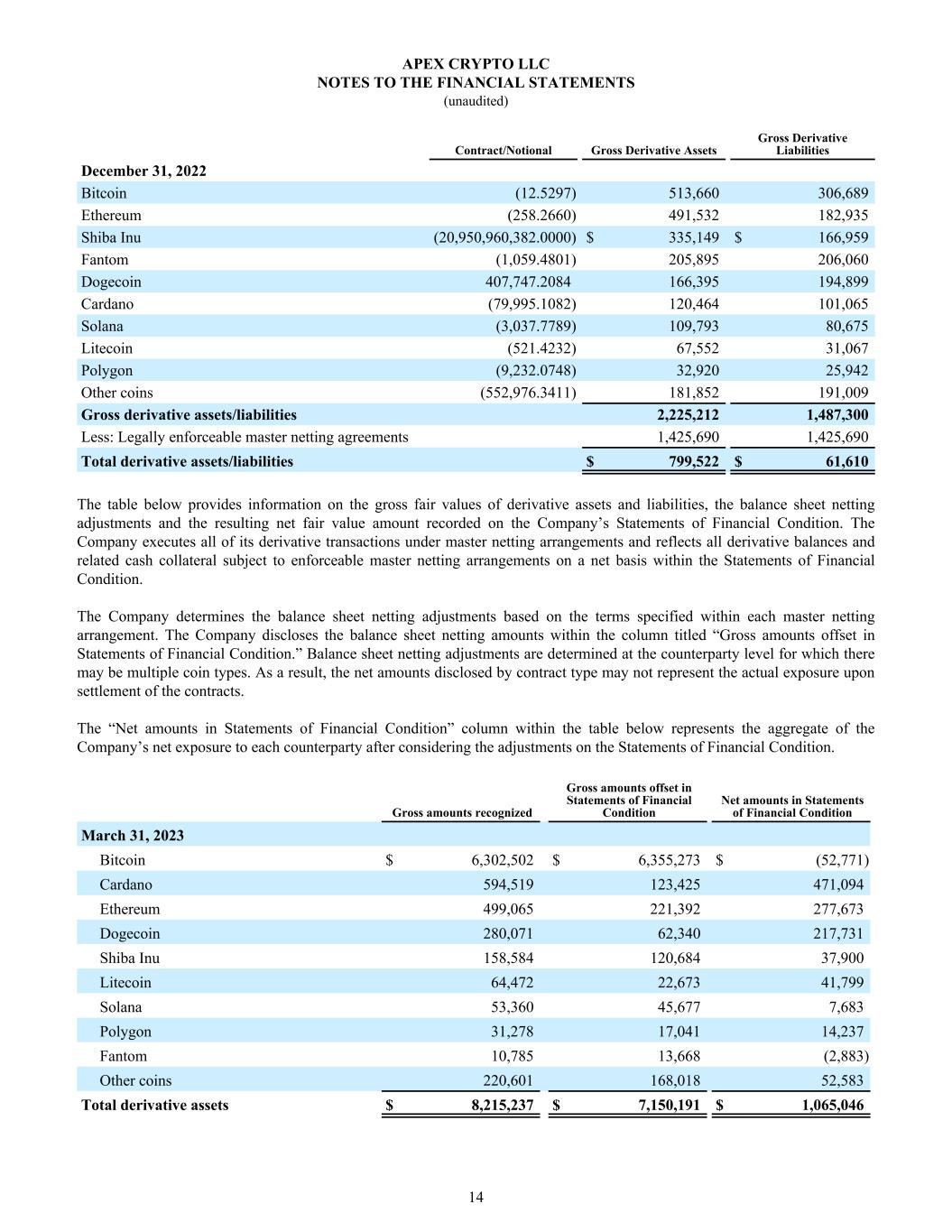 December 31, 2022 Bitcoin (12.5297) 513,660 306,689 Ethereum (258.2660) 491,532 182,935 Shiba Inu (20,950,960,382.0000) $ 335,149 $ 166,959 Fantom (1,059.4801) 205,895 206,060 Dogecoin 407,747.2084 166,395 194,899 Cardano (79,995.1082) 120,464 101,065 Solana (3,037.7789) 109,793 80,675 Litecoin (521.4232) 67,552 31,067 Polygon (9,232.0748) 32,920 25,942 Other coins (552,976.3411) 181,852 191,009 Gross derivative assets/liabilities 2,225,212 1,487,300 Less: Legally enforceable master netting agreements 1,425,690 1,425,690 Total derivative assets/liabilities $ 799,522 $ 61,610 Contract/Notional Gross Derivative Assets Gross Derivative Liabilities The table below provides information on the gross fair values of derivative assets and liabilities, the balance sheet netting adjustments and the resulting net fair value amount recorded on the Company’s Statements of Financial Condition. The Company executes all of its derivative transactions under master netting arrangements and reflects all derivative balances and related cash collateral subject to enforceable master netting arrangements on a net basis within the Statements of Financial Condition. The Company determines the balance sheet netting adjustments based on the terms specified within each master netting arrangement. The Company discloses the balance sheet netting amounts within the column titled “Gross amounts offset in Statements of Financial Condition.” Balance sheet netting adjustments are determined at the counterparty level for which there may be multiple coin types. As a result, the net amounts disclosed by contract type may not represent the actual exposure upon settlement of the contracts. The “Net amounts in Statements of Financial Condition” column within the table below represents the aggregate of the Company’s net exposure to each counterparty after considering the adjustments on the Statements of Financial Condition. March 31, 2023 Bitcoin $ 6,302,502 $ 6,355,273 $ (52,771) Cardano 594,519 123,425 471,094 Ethereum 499,065 221,392 277,673 Dogecoin 280,071 62,340 217,731 Shiba Inu 158,584 120,684 37,900 Litecoin 64,472 22,673 41,799 Solana 53,360 45,677 7,683 Polygon 31,278 17,041 14,237 Fantom 10,785 13,668 (2,883) Other coins 220,601 168,018 52,583 Total derivative assets $ 8,215,237 $ 7,150,191 $ 1,065,046 Gross amounts recognized Gross amounts offset in Statements of Financial Condition Net amounts in Statements of Financial Condition APEX CRYPTO LLC NOTES TO THE FINANCIAL STATEMENTS (unaudited) 14