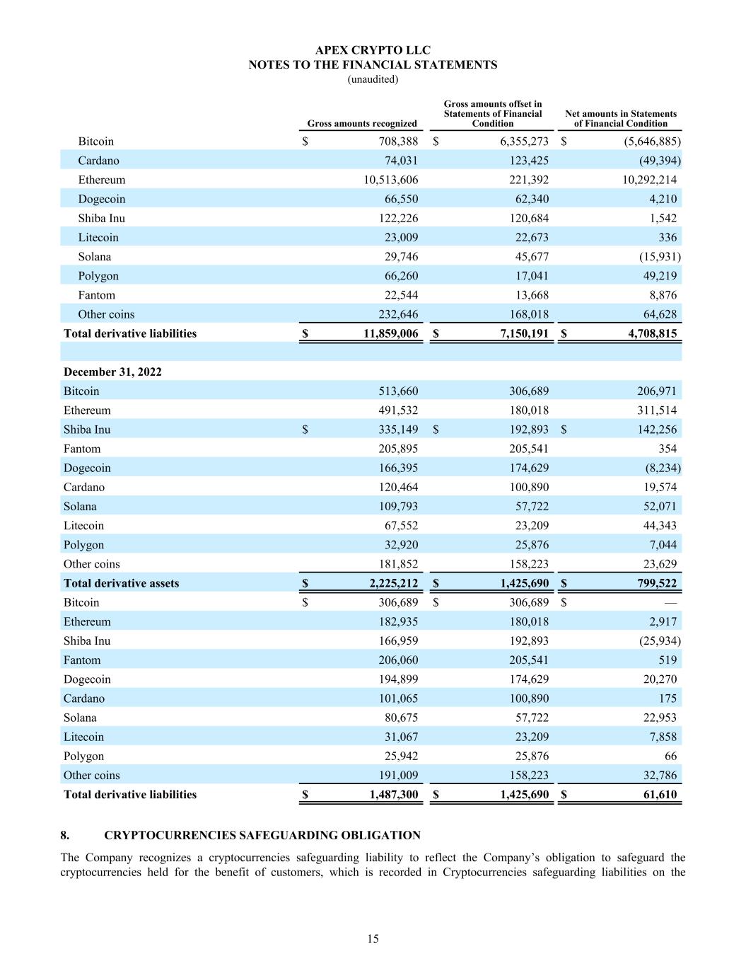 Bitcoin $ 708,388 $ 6,355,273 $ (5,646,885) Cardano 74,031 123,425 (49,394) Ethereum 10,513,606 221,392 10,292,214 Dogecoin 66,550 62,340 4,210 Shiba Inu 122,226 120,684 1,542 Litecoin 23,009 22,673 336 Solana 29,746 45,677 (15,931) Polygon 66,260 17,041 49,219 Fantom 22,544 13,668 8,876 Other coins 232,646 168,018 64,628 Total derivative liabilities $ 11,859,006 $ 7,150,191 $ 4,708,815 December 31, 2022 Bitcoin 513,660 306,689 206,971 Ethereum 491,532 180,018 311,514 Shiba Inu $ 335,149 $ 192,893 $ 142,256 Fantom 205,895 205,541 354 Dogecoin 166,395 174,629 (8,234) Cardano 120,464 100,890 19,574 Solana 109,793 57,722 52,071 Litecoin 67,552 23,209 44,343 Polygon 32,920 25,876 7,044 Other coins 181,852 158,223 23,629 Total derivative assets $ 2,225,212 $ 1,425,690 $ 799,522 Bitcoin $ 306,689 $ 306,689 $ — Ethereum 182,935 180,018 2,917 Shiba Inu 166,959 192,893 (25,934) Fantom 206,060 205,541 519 Dogecoin 194,899 174,629 20,270 Cardano 101,065 100,890 175 Solana 80,675 57,722 22,953 Litecoin 31,067 23,209 7,858 Polygon 25,942 25,876 66 Other coins 191,009 158,223 32,786 Total derivative liabilities $ 1,487,300 $ 1,425,690 $ 61,610 Gross amounts recognized Gross amounts offset in Statements of Financial Condition Net amounts in Statements of Financial Condition 8. CRYPTOCURRENCIES SAFEGUARDING OBLIGATION The Company recognizes a cryptocurrencies safeguarding liability to reflect the Company’s obligation to safeguard the cryptocurrencies held for the benefit of customers, which is recorded in Cryptocurrencies safeguarding liabilities on the APEX CRYPTO LLC NOTES TO THE FINANCIAL STATEMENTS (unaudited) 15