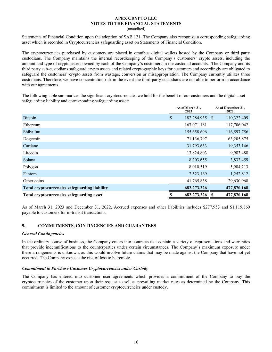 Statements of Financial Condition upon the adoption of SAB 121. The Company also recognize a corresponding safeguarding asset which is recorded in Cryptocurrencies safeguarding asset on Statements of Financial Condition. The cryptocurrencies purchased by customers are placed in omnibus digital wallets hosted by the Company or third party custodians. The Company maintains the internal recordkeeping of the Company’s customers’ crypto assets, including the amount and type of crypto assets owned by each of the Company’s customers in the custodial accounts. The Company and its third party sub-custodians safeguard crypto assets and related cryptographic keys for customers and accordingly are obligated to safeguard the customers’ crypto assets from wastage, conversion or misappropriation. The Company currently utilizes three custodians. Therefore, we have concentration risk in the event the third-party custodians are not able to perform in accordance with our agreements. The following table summarizes the significant cryptocurrencies we hold for the benefit of our customers and the digital asset safeguarding liability and corresponding safeguarding asset: As of March 31, 2023 As of December 31, 2022 Bitcoin $ 182,284,935 $ 110,322,409 Ethereum 167,071,181 117,706,042 Shiba Inu 155,658,696 116,597,756 Dogecoin 71,136,797 63,205,875 Cardano 31,793,633 19,353,146 Litecoin 13,824,803 9,983,488 Solana 8,203,655 3,833,459 Polygon 8,010,519 5,984,213 Fantom 2,523,169 1,252,812 Other coins 41,765,838 29,630,968 Total cryptocurrencies safeguarding liability 682,273,226 477,870,168 Total cryptocurrencies safeguarding asset $ 682,273,226 $ 477,870,168 As of March 31, 2023 and December 31, 2022, Accrued expenses and other liabilities includes $277,953 and $1,119,869 payable to customers for in-transit transactions. 9. COMMITMENTS, CONTINGENCIES AND GUARANTEES General Contingencies In the ordinary course of business, the Company enters into contracts that contain a variety of representations and warranties that provide indemnifications to the counterparties under certain circumstances. The Company’s maximum exposure under these arrangements is unknown, as this would involve future claims that may be made against the Company that have not yet occurred. The Company expects the risk of loss to be remote. Commitment to Purchase Customer Cryptocurrencies under Custody The Company has entered into customer user agreements which provides a commitment of the Company to buy the cryptocurrencies of the customer upon their request to sell at prevailing market rates as determined by the Company. This commitment is limited to the amount of customer cryptocurrencies under custody. APEX CRYPTO LLC NOTES TO THE FINANCIAL STATEMENTS (unaudited) 16