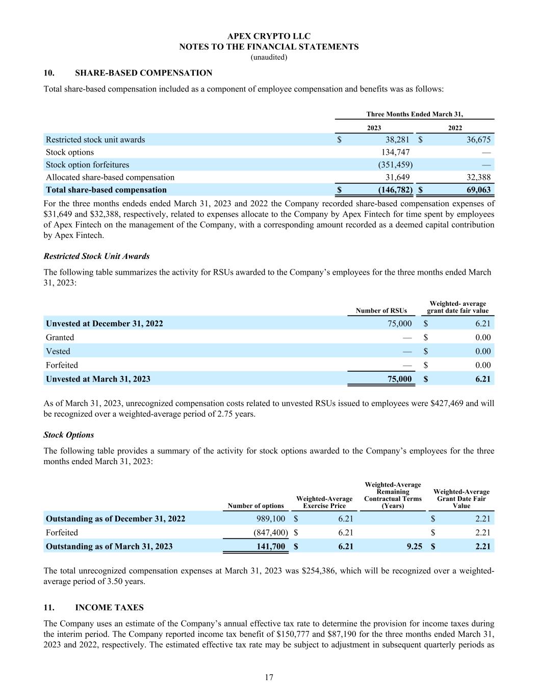 10. SHARE-BASED COMPENSATION Total share-based compensation included as a component of employee compensation and benefits was as follows: Three Months Ended March 31, 2023 2022 Restricted stock unit awards $ 38,281 $ 36,675 Stock options 134,747 — Stock option forfeitures (351,459) — Allocated share-based compensation 31,649 32,388 Total share-based compensation $ (146,782) $ 69,063 For the three months endeds ended March 31, 2023 and 2022 the Company recorded share-based compensation expenses of $31,649 and $32,388, respectively, related to expenses allocate to the Company by Apex Fintech for time spent by employees of Apex Fintech on the management of the Company, with a corresponding amount recorded as a deemed capital contribution by Apex Fintech. Restricted Stock Unit Awards The following table summarizes the activity for RSUs awarded to the Company’s employees for the three months ended March 31, 2023: Number of RSUs Weighted- average grant date fair value Unvested at December 31, 2022 75,000 $ 6.21 Granted — $ 0.00 Vested — $ 0.00 Forfeited — $ 0.00 Unvested at March 31, 2023 75,000 $ 6.21 As of March 31, 2023, unrecognized compensation costs related to unvested RSUs issued to employees were $427,469 and will be recognized over a weighted-average period of 2.75 years. Stock Options The following table provides a summary of the activity for stock options awarded to the Company’s employees for the three months ended March 31, 2023: Number of options Weighted-Average Exercise Price Weighted-Average Remaining Contractual Terms (Years) Weighted-Average Grant Date Fair Value Outstanding as of December 31, 2022 989,100 $ 6.21 $ 2.21 Forfeited (847,400) $ 6.21 $ 2.21 Outstanding as of March 31, 2023 141,700 $ 6.21 9.25 $ 2.21 The total unrecognized compensation expenses at March 31, 2023 was $254,386, which will be recognized over a weighted- average period of 3.50 years. 11. INCOME TAXES The Company uses an estimate of the Company’s annual effective tax rate to determine the provision for income taxes during the interim period. The Company reported income tax benefit of $150,777 and $87,190 for the three months ended March 31, 2023 and 2022, respectively. The estimated effective tax rate may be subject to adjustment in subsequent quarterly periods as APEX CRYPTO LLC NOTES TO THE FINANCIAL STATEMENTS (unaudited) 17