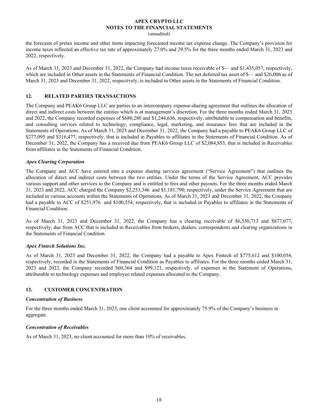 the forecasts of pretax income and other items impacting forecasted income tax expense change. The Company’s provision for income taxes reflected an effective tax rate of approximately 27.0% and 29.5% for the three months ended March 31, 2023 and 2022, respectively. As of March 31, 2023 and December 31, 2022, the Company had income taxes receivable of $— and $1,435,057, respectively, which are included in Other assets in the Statements of Financial Condition. The net deferred tax asset of $— and $26,006 as of March 31, 2023 and December 31, 2022, respectively, is included in Other assets in the Statements of Financial Condition. 12. RELATED PARTIES TRANSACTIONS The Company and PEAK6 Group LLC are parties to an intercompany expense-sharing agreement that outlines the allocation of direct and indirect costs between the entities which is at management’s discretion. For the three months ended March 31, 2023 and 2022, the Company recorded expenses of $680,280 and $1,244,636, respectively, attributable to compensation and benefits, and consulting services related to technology, compliance, legal, marketing, and insurance fees that are included in the Statements of Operations. As of March 31, 2023 and December 31, 2022, the Company had a payable to PEAK6 Group LLC of $277,095 and $316,477, respectively, that is included in Payables to affiliates in the Statements of Financial Condition. As of December 31, 2022, the Company has a received due from PEAK6 Group LLC of $2,084,853, that is included in Receivables from affiliates in the Statements of Financial Condition. Apex Clearing Corporation The Company and ACC have entered into a expense sharing services agreement (“Service Agreement”) that outlines the allocation of direct and indirect costs between the two entities. Under the terms of the Service Agreement, ACC provides various support and other services to the Company and is entitled to fees and other payouts. For the three months ended March 31, 2023 and 2022, ACC charged the Company $2,253,346 and $1,181,790, respectively, under the Service Agreement that are included in various accounts within the Statements of Operations. As of March 31, 2023 and December 31, 2022, the Company had a payable to ACC of $251,976 and $100,554, respectively, that is included in Payables to affiliates in the Statements of Financial Condition. As of March 31, 2023 and December 31, 2022, the Company has a clearing receivable of $6,530,713 and $877,077, respectively, due from ACC that is included in Receivables from brokers, dealers, correspondents and clearing organizations in the Statements of Financial Condition. Apex Fintech Solutions Inc. As of March 31, 2023 and December 31, 2022, the Company had a payable to Apex Fintech of $775,612 and $100,054, respectively, recorded in the Statements of Financial Condition as Payables to affiliates. For the three months ended March 31, 2023 and 2022, the Company recorded $60,364 and $99,121, respectively, of expenses in the Statement of Operations, attributable to technology expenses and employee related expenses allocated to the Company. 13. CUSTOMER CONCENTRATION Concentration of Business For the three months ended March 31, 2023, one client accounted for approximately 75.9% of the Company’s business in aggregate. Concentration of Receivables As of March 31, 2023, no client accounted for more than 10% of receivables. APEX CRYPTO LLC NOTES TO THE FINANCIAL STATEMENTS (unaudited) 18