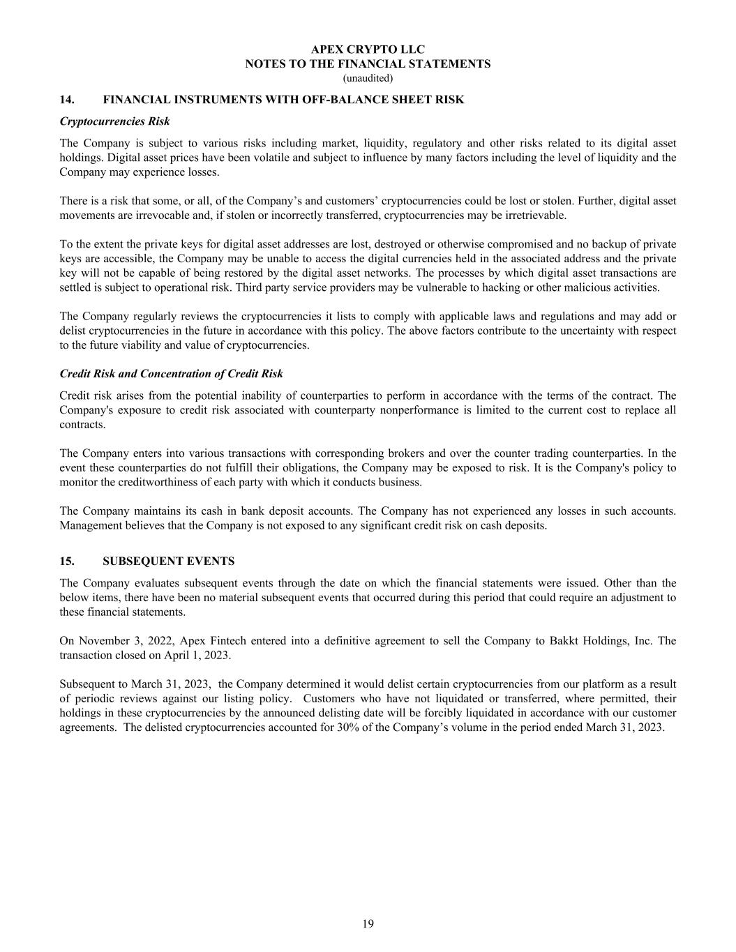 14. FINANCIAL INSTRUMENTS WITH OFF-BALANCE SHEET RISK Cryptocurrencies Risk The Company is subject to various risks including market, liquidity, regulatory and other risks related to its digital asset holdings. Digital asset prices have been volatile and subject to influence by many factors including the level of liquidity and the Company may experience losses. There is a risk that some, or all, of the Company’s and customers’ cryptocurrencies could be lost or stolen. Further, digital asset movements are irrevocable and, if stolen or incorrectly transferred, cryptocurrencies may be irretrievable. To the extent the private keys for digital asset addresses are lost, destroyed or otherwise compromised and no backup of private keys are accessible, the Company may be unable to access the digital currencies held in the associated address and the private key will not be capable of being restored by the digital asset networks. The processes by which digital asset transactions are settled is subject to operational risk. Third party service providers may be vulnerable to hacking or other malicious activities. The Company regularly reviews the cryptocurrencies it lists to comply with applicable laws and regulations and may add or delist cryptocurrencies in the future in accordance with this policy. The above factors contribute to the uncertainty with respect to the future viability and value of cryptocurrencies. Credit Risk and Concentration of Credit Risk Credit risk arises from the potential inability of counterparties to perform in accordance with the terms of the contract. The Company's exposure to credit risk associated with counterparty nonperformance is limited to the current cost to replace all contracts. The Company enters into various transactions with corresponding brokers and over the counter trading counterparties. In the event these counterparties do not fulfill their obligations, the Company may be exposed to risk. It is the Company's policy to monitor the creditworthiness of each party with which it conducts business. The Company maintains its cash in bank deposit accounts. The Company has not experienced any losses in such accounts. Management believes that the Company is not exposed to any significant credit risk on cash deposits. 15. SUBSEQUENT EVENTS The Company evaluates subsequent events through the date on which the financial statements were issued. Other than the below items, there have been no material subsequent events that occurred during this period that could require an adjustment to these financial statements. On November 3, 2022, Apex Fintech entered into a definitive agreement to sell the Company to Bakkt Holdings, Inc. The transaction closed on April 1, 2023. Subsequent to March 31, 2023, the Company determined it would delist certain cryptocurrencies from our platform as a result of periodic reviews against our listing policy. Customers who have not liquidated or transferred, where permitted, their holdings in these cryptocurrencies by the announced delisting date will be forcibly liquidated in accordance with our customer agreements. The delisted cryptocurrencies accounted for 30% of the Company’s volume in the period ended March 31, 2023. APEX CRYPTO LLC NOTES TO THE FINANCIAL STATEMENTS (unaudited) 19