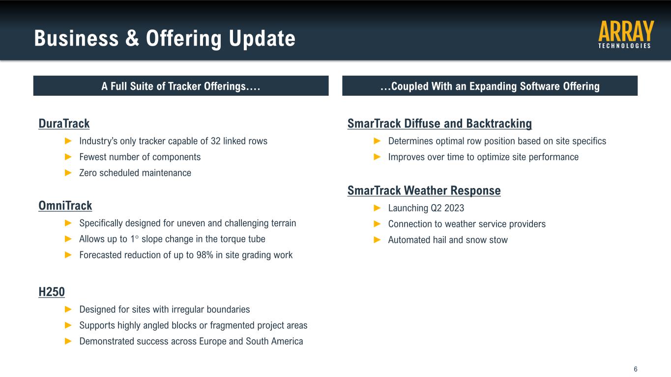 5 Industry & Market Update U.S. Outlook • Short-term outlook remains healthy despite timing uncertainty caused by module availability and IRA domestic content • IRA Manufacturing credits will represent earnings upside in the near and long-term, but its too early to estimate how much • Multi-year health of the industry remains incredibly strong on the back of the Inflation Reduction Act • Market growth will create geographic diversity in project sites requiring flexible product offerings • Strategic relationships across the value-chain will become increasingly important Rest of World Outlook • Post election, the Brazilian solar market is poised for healthy growth in 2023 • Australia expected to rebound as EPC and interconnect issues of the past improve; in-country content will be an important differentiator • Demand in Western Europe expected to be slightly tempered until regulators introduce meaningful legislation • Continue to evaluate other areas of the world as solar continues to expand