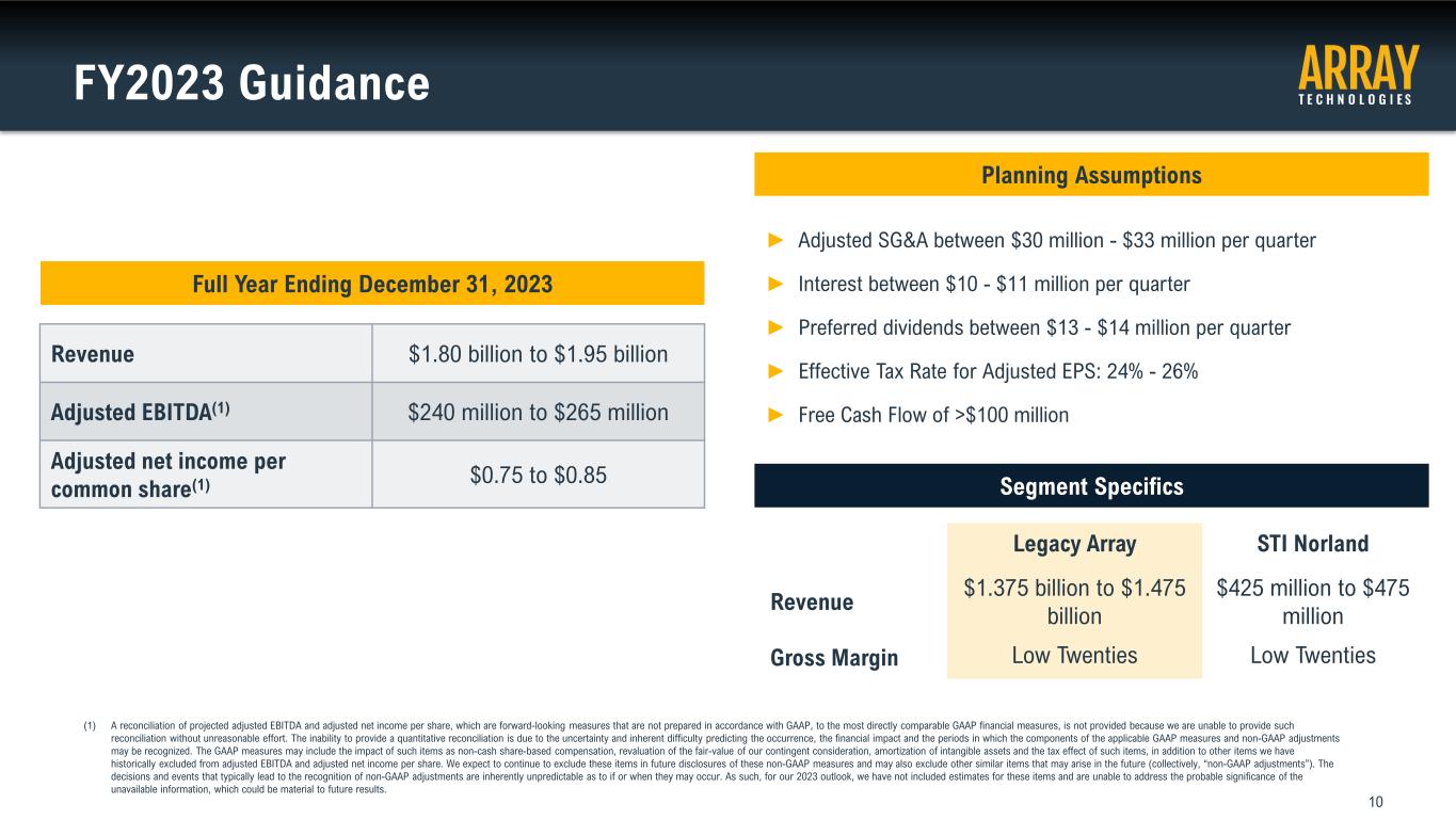 10 FY2023 Guidance (1) A reconciliation of projected adjusted EBITDA and adjusted net income per share, which are forward-looking measures that are not prepared in accordance with GAAP, to the most directly comparable GAAP financial measures, is not provided because we are unable to provide such reconciliation without unreasonable effort. The inability to provide a quantitative reconciliation is due to the uncertainty and inherent difficulty predicting the occurrence, the financial impact and the periods in which the components of the applicable GAAP measures and non-GAAP adjustments may be recognized. The GAAP measures may include the impact of such items as non-cash share-based compensation, revaluation of the fair-value of our contingent consideration, amortization of intangible assets and the tax effect of such items, in addition to other items we have historically excluded from adjusted EBITDA and adjusted net income per share. We expect to continue to exclude these items in future disclosures of these non-GAAP measures and may also exclude other similar items that may arise in the future (collectively, “non-GAAP adjustments”). The decisions and events that typically lead to the recognition of non-GAAP adjustments are inherently unpredictable as to if or when they may occur. As such, for our 2023 outlook, we have not included estimates for these items and are unable to address the probable significance of the unavailable information, which could be material to future results. Revenue $1.80 billion to $1.95 billion Adjusted EBITDA(1) $240 million to $265 million Adjusted net income per common share(1) $0.75 to $0.85 Full Year Ending December 31, 2023 ► Adjusted SG&A between $30 million - $33 million per quarter ► Interest between $10 - $11 million per quarter ► Preferred dividends between $13 - $14 million per quarter ► Effective Tax Rate for Adjusted EPS: 24% - 26% ► Free Cash Flow of >$100 million Planning Assumptions Segment Specifics Legacy Array STI Norland Revenue $1.375 billion to $1.475 billion $425 million to $475 million Gross Margin Low Twenties Low Twenties
