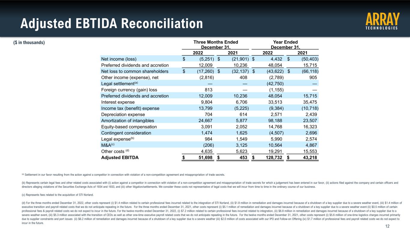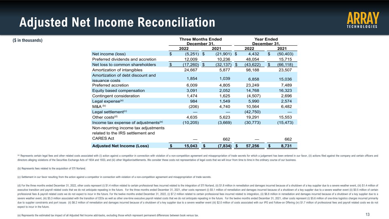 12 Three Months Ended December 31, Year Ended December 31, 2022 2021 2022 2021 Net income (loss) $ (5,251) $ (21,901) $ 4,432 $ (50,403) Preferred dividends and accretion 12,009 10,236 48,054 15,715 Net loss to common shareholders $ (17,260) $ (32,137) $ (43,622) $ (66,118) Other income (expense), net (2,816) 408 (2,789) 905 Legal settlement(a) — — (42,750) — Foreign currency (gain) loss 813 — (1,155) — Preferred dividends and accretion 12,009 10,236 48,054 15,715 Interest expense 9,804 6,706 33,513 35,475 Income tax (benefit) expense 13,799 (5,225) (9,384) (10,718) Depreciation expense 704 614 2,571 2,439 Amortization of intangibles 24,667 5,877 98,188 23,507 Equity-based compensation 3,091 2,052 14,768 16,323 Contingent consideration 1,474 1,625 (4,507) 2,696 Legal expense(b) 984 1,549 5,990 2,574 M&A(c) (206) 3,125 10,564 4,867 Other costs (d) 4,635 5,623 19,291 15,553 Adjusted EBITDA $ 51,698 $ 453 $ 128,732 $ 43,218 Adjusted EBTIDA Reconciliation ($ in thousands) (a) Settlement in our favor resulting from the action against a competitor in connection with violation of a non-competition agreement and misappropriation of trade secrets. (b) Represents certain legal fees and other related costs associated with (i) action against a competitor in connection with violation of a non-competition agreement and misappropriation of trade secrets for which a judgement has been entered in our favor, (ii) actions filed against the company and certain officers and directors alleging violations of the Securities Exchange Acts of 1934 and 1933, and (iii) other litigation/settlements. We consider these costs not representative of legal costs that we will incur from time to time in the ordinary course of our business. (c) Represents fees related to the acquisition of STI Norland. (d) For the three months ended December 31, 2022, other costs represent (i) $1.4 million related to certain professional fees incurred related to the integration of STI Norland, (ii) $1.8 million in remediation and damages incurred because of a shutdown of a key supplier due to a severe weather event, (iii) $1.4 million of executive transition and payroll related costs that we do not anticipate repeating in the future. For the three months ended December 31, 2021, other costs represent (i) $5.1 million of remediation and damages incurred because of a shutdown of a key supplier due to a severe weather event (ii) $0.5 million of certain professional fees & payroll related costs we do not expect to incur in the future. For the twelve months ended December 31, 2022, (i) $7.2 million related to certain professional fees incurred related to integration, (ii) $6.8 million in remediation and damages incurred because of a shutdown of a key supplier due to a severe weather event, (iii) $5.3 million associated with the transition of CEOs as well as other one-time executive payroll related costs that we do not anticipate repeating in the future. For the twelve months ended December 31, 2021, other costs represent (i) $5.6 million of one-time logistics charges incurred primarily due to supplier constraints and port issues (ii) $6.2 million of remediation and damages incurred because of a shutdown of a key supplier due to a severe weather (iii) $2.0 million of costs associated with our IPO and Follow-on Offering (iv) $1.7 million of professional fees and payroll related costs we do not expect to incur in the future.