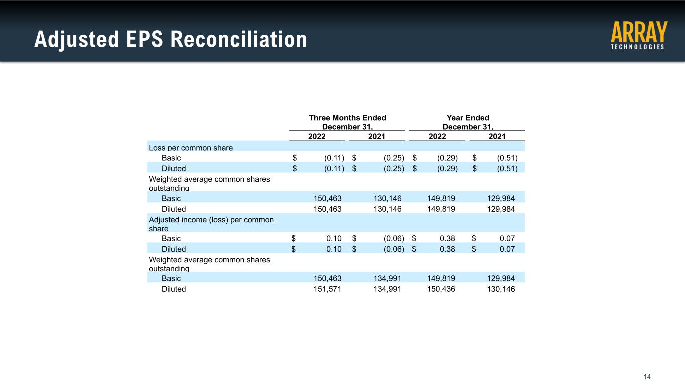 13 Adjusted Net Income Reconciliation ($ in thousands) (a) Represents certain legal fees and other related costs associated with (i) action against a competitor in connection with violation of a non-competition agreement and misappropriation of trade secrets for which a judgement has been entered in our favor, (ii) actions filed against the company and certain officers and directors alleging violations of the Securities Exchange Acts of 1934 and 1933, and (iii) other litigation/settlements. We consider these costs not representative of legal costs that we will incur from time to time in the ordinary course of our business. (b) Represents fees related to the acquisition of STI Norland. (c) Settlement in our favor resulting from the action against a competitor in connection with violation of a non-competition agreement and misappropriation of trade secrets. (d) For the three months ended December 31, 2022, other costs represent (i) $1.4 million related to certain professional fees incurred related to the integration of STI Norland, (ii) $1.8 million in remediation and damages incurred because of a shutdown of a key supplier due to a severe weather event, (iii) $1.4 million of executive transition and payroll related costs that we do not anticipate repeating in the future. For the three months ended December 31, 2021, other costs represent (i) $5.1 million of remediation and damages incurred because of a shutdown of a key supplier due to a severe weather event (ii) $0.5 million of certain professional fees & payroll related costs we do not expect to incur in the future. For the twelve months ended December 31, 2022, (i) $7.2 million related to certain professional fees incurred related to integration, (ii) $6.8 million in remediation and damages incurred because of a shutdown of a key supplier due to a severe weather event, (iii) $5.3 million associated with the transition of CEOs as well as other one-time executive payroll related costs that we do not anticipate repeating in the future. For the twelve months ended December 31, 2021, other costs represent (i) $5.6 million of one-time logistics charges incurred primarily due to supplier constraints and port issues (ii) $6.2 million of remediation and damages incurred because of a shutdown of a key supplier due to a severe weather event (iii) $2.0 million of costs associated with our IPO and Follow-on Offering (iv) $1.7 million of professional fees and payroll related costs we do not expect to incur in the future. (e) Represents the estimated tax impact of all Adjusted Net Income add-backs, excluding those which represent permanent differences between book versus tax. Three Months Ended December 31, Year Ended December 31, 2022 2021 2022 2021 Net income (loss) $ (5,251) $ (21,901) $ 4,432 $ (50,403) Preferred dividends and accretion 12,009 10,236 48,054 15,715 Net loss to common shareholders $ (17,260) $ (32,137) $ (43,622) $ (66,118) Amortization of intangibles 24,667 5,877 98,188 23,507 Amortization of debt discount and issuance costs 1,854 1,039 6,858 15,036 Preferred accretion 6,009 4,805 23,249 7,489 Equity based compensation 3,091 2,052 14,768 16,323 Contingent consideration 1,474 1,625 (4,507) 2,696 Legal expense(a) 984 1,549 5,990 2,574 M&A (b) (206) 4,740 10,564 6,482 Legal settlement(c) — — (42,750) — Other costs(d) 4,635 5,623 19,291 15,553 Income tax expense of adjustments(e) (10,205) (3,669) (30,773) (15,473) Non-recurring income tax adjustments related to the IRS settlement and CARES Act — 662 — 662 Adjusted Net Income (Loss) $ 15,043 $ (7,834) $ 57,256 $ 8,731