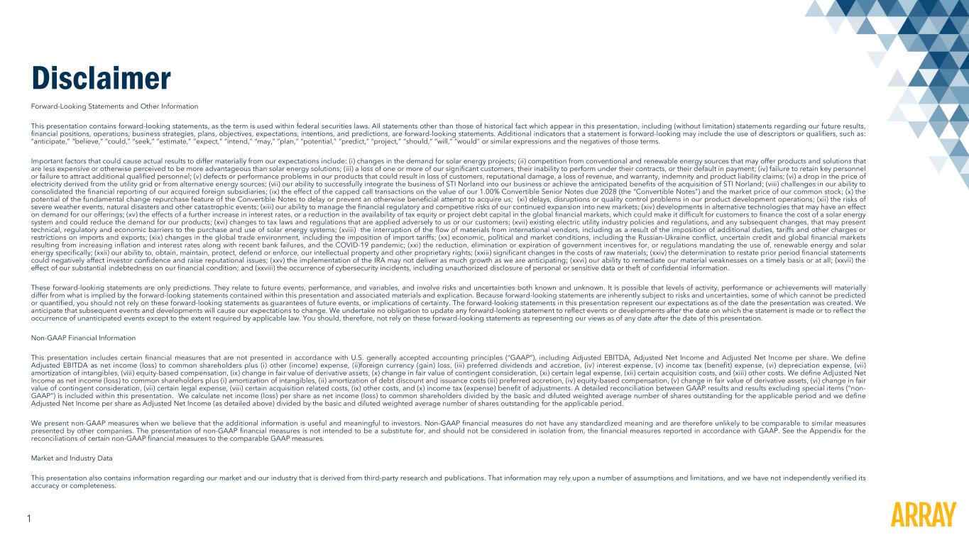 1 Disclaimer Forward-Looking Statements and Other Information This presentation contains forward-looking statements, as the term is used within federal securities laws. All statements other than those of historical fact which appear in this presentation, including (without limitation) statements regarding our future results, financial positions, operations, business strategies, plans, objectives, expectations, intentions, and predictions, are forward-looking statements. Additional indicators that a statement is forward-looking may include the use of descriptors or qualifiers, such as: “anticipate,” “believe,” “could,” “seek,” “estimate,” “expect,” “intend,” “may,” “plan,” “potential,” “predict,” “project,” “should,” “will,” “would” or similar expressions and the negatives of those terms. Important factors that could cause actual results to differ materially from our expectations include: (i) changes in the demand for solar energy projects; (ii) competition from conventional and renewable energy sources that may offer products and solutions that are less expensive or otherwise perceived to be more advantageous than solar energy solutions; (iii) a loss of one or more of our significant customers, their inability to perform under their contracts, or their default in payment; (iv) failure to retain key personnel or failure to attract additional qualified personnel; (v) defects or performance problems in our products that could result in loss of customers, reputational damage, a loss of revenue, and warranty, indemnity and product liability claims; (vi) a drop in the price of electricity derived from the utility grid or from alternative energy sources; (vii) our ability to successfully integrate the business of STI Norland into our business or achieve the anticipated benefits of the acquisition of STI Norland; (viii) challenges in our ability to consolidated the financial reporting of our acquired foreign subsidiaries; (ix) the effect of the capped call transactions on the value of our 1.00% Convertible Senior Notes due 2028 (the “Convertible Notes”) and the market price of our common stock; (x) the potential of the fundamental change repurchase feature of the Convertible Notes to delay or prevent an otherwise beneficial attempt to acquire us; (xi) delays, disruptions or quality control problems in our product development operations; (xii) the risks of severe weather events, natural disasters and other catastrophic events; (xiii) our ability to manage the financial regulatory and competitive risks of our continued expansion into new markets; (xiv) developments in alternative technologies that may have an effect on demand for our offerings; (xv) the effects of a further increase in interest rates, or a reduction in the availability of tax equity or project debt capital in the global financial markets, which could make it difficult for customers to finance the cost of a solar energy system and could reduce the demand for our products; (xvi) changes to tax laws and regulations that are applied adversely to us or our customers; (xvii) existing electric utility industry policies and regulations, and any subsequent changes, that may present technical, regulatory and economic barriers to the purchase and use of solar energy systems; (xviii) the interruption of the flow of materials from international vendors, including as a result of the imposition of additional duties, tariffs and other charges or restrictions on imports and exports; (xix) changes in the global trade environment, including the imposition of import tariffs; (xx) economic, political and market conditions, including the Russian-Ukraine conflict, uncertain credit and global financial markets resulting from increasing inflation and interest rates along with recent bank failures, and the COVID-19 pandemic; (xxi) the reduction, elimination or expiration of government incentives for, or regulations mandating the use of, renewable energy and solar energy specifically; (xxii) our ability to, obtain, maintain, protect, defend or enforce, our intellectual property and other proprietary rights; (xxiii) significant changes in the costs of raw materials; (xxiv) the determination to restate prior period financial statements could negatively affect investor confidence and raise reputational issues; (xxv) the implementation of the IRA may not deliver as much growth as we are anticipating; (xxvi) our ability to remediate our material weaknesses on a timely basis or at all; (xxvii) the effect of our substantial indebtedness on our financial condition; and (xxviii) the occurrence of cybersecurity incidents, including unauthorized disclosure of personal or sensitive data or theft of confidential information. These forward-looking statements are only predictions. They relate to future events, performance, and variables, and involve risks and uncertainties both known and unknown. It is possible that levels of activity, performance or achievements will materially differ from what is implied by the forward-looking statements contained within this presentation and associated materials and explication. Because forward-looking statements are inherently subject to risks and uncertainties, some of which cannot be predicted or quantified, you should not rely on these forward-looking statements as guarantees of future events, or implications of certainty. The forward-looking statements in this presentation represent our expectations as of the date the presentation was created. We anticipate that subsequent events and developments will cause our expectations to change. We undertake no obligation to update any forward-looking statement to reflect events or developments after the date on which the statement is made or to reflect the occurrence of unanticipated events except to the extent required by applicable law. You should, therefore, not rely on these forward-looking statements as representing our vi