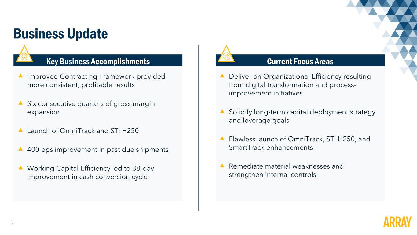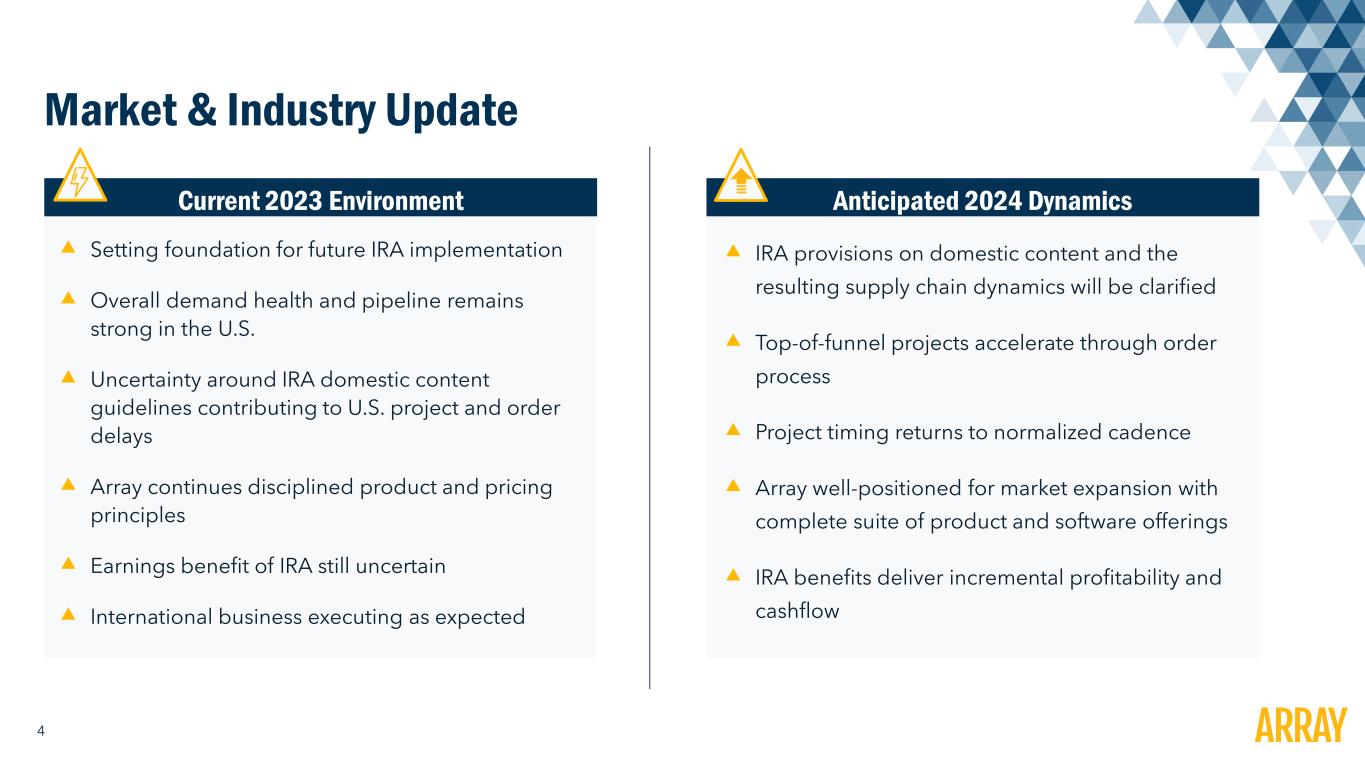 4 Current 2023 Environment Market & Industry Update Anticipated 2024 Dynamics  IRA provisions on domestic content and the resulting supply chain dynamics will be clarified  Top-of-funnel projects accelerate through order process  Project timing returns to normalized cadence  Array well-positioned for market expansion with complete suite of product and software offerings  IRA benefits deliver incremental profitability and cashflow  Setting foundation for future IRA implementation  Overall demand health and pipeline remains strong in the U.S.  Uncertainty around IRA domestic content guidelines contributing to U.S. project and order delays  Array continues disciplined product and pricing principles  Earnings benefit of IRA still uncertain  International business executing as expected