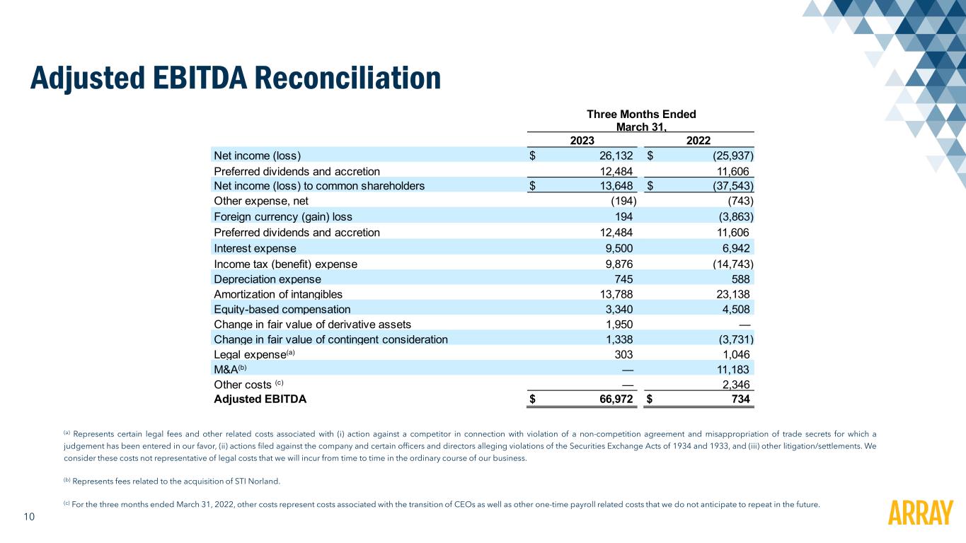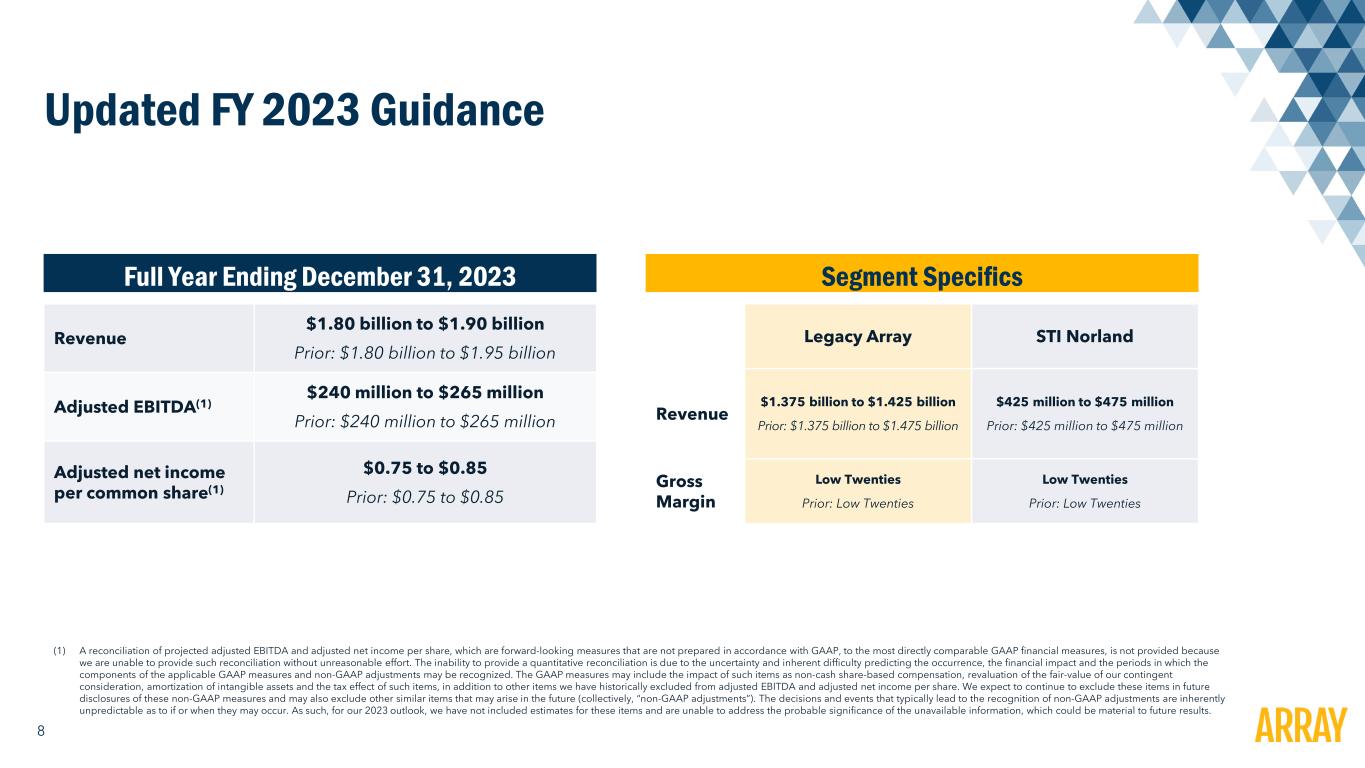 8 Updated FY 2023 Guidance Full Year Ending December 31, 2023 Revenue $1.80 billion to $1.90 billion Prior: $1.80 billion to $1.95 billion Adjusted EBITDA(1) $240 million to $265 million Prior: $240 million to $265 million Adjusted net income per common share(1) $0.75 to $0.85 Prior: $0.75 to $0.85 (1) A reconciliation of projected adjusted EBITDA and adjusted net income per share, which are forward-looking measures that are not prepared in accordance with GAAP, to the most directly comparable GAAP financial measures, is not provided because we are unable to provide such reconciliation without unreasonable effort. The inability to provide a quantitative reconciliation is due to the uncertainty and inherent difficulty predicting the occurrence, the financial impact and the periods in which the components of the applicable GAAP measures and non-GAAP adjustments may be recognized. The GAAP measures may include the impact of such items as non-cash share-based compensation, revaluation of the fair-value of our contingent consideration, amortization of intangible assets and the tax effect of such items, in addition to other items we have historically excluded from adjusted EBITDA and adjusted net income per share. We expect to continue to exclude these items in future disclosures of these non-GAAP measures and may also exclude other similar items that may arise in the future (collectively, “non-GAAP adjustments”). The decisions and events that typically lead to the recognition of non-GAAP adjustments are inherently unpredictable as to if or when they may occur. As such, for our 2023 outlook, we have not included estimates for these items and are unable to address the probable significance of the unavailable information, which could be material to future results. Segment Specifics Legacy Array STI Norland Revenue $1.375 billion to $1.425 billion Prior: $1.375 billion to $1.475 billion $425 million to $475 million Prior: $425 million to $475 million Gross Margin Low Twenties Prior: Low Twenties Low Twenties Prior: Low Twenties