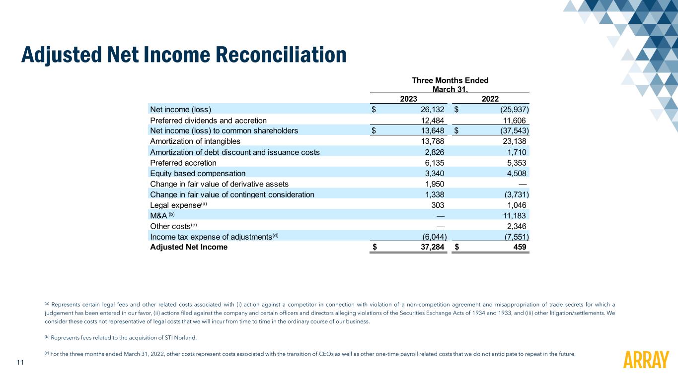 10 Adjusted EBITDA Reconciliation Three Months Ended March 31, 2023 2022 Net income (loss) $ 26,132 $ (25,937) Preferred dividends and accretion 12,484 11,606 Net income (loss) to common shareholders $ 13,648 $ (37,543) Other expense, net (194) (743) Foreign currency (gain) loss 194 (3,863) Preferred dividends and accretion 12,484 11,606 Interest expense 9,500 6,942 Income tax (benefit) expense 9,876 (14,743) Depreciation expense 745 588 Amortization of intangibles 13,788 23,138 Equity-based compensation 3,340 4,508 Change in fair value of derivative assets 1,950 — Change in fair value of contingent consideration 1,338 (3,731) Legal expense(a) 303 1,046 M&A(b) — 11,183 Other costs (c) — 2,346 Adjusted EBITDA $ 66,972 $ 734 (a) Represents certain legal fees and other related costs associated with (i) action against a competitor in connection with violation of a non-competition agreement and misappropriation of trade secrets for which a judgement has been entered in our favor, (ii) actions filed against the company and certain officers and directors alleging violations of the Securities Exchange Acts of 1934 and 1933, and (iii) other litigation/settlements. We consider these costs not representative of legal costs that we will incur from time to time in the ordinary course of our business. (b) Represents fees related to the acquisition of STI Norland. (c) For the three months ended March 31, 2022, other costs represent costs associated with the transition of CEOs as well as other one-time payroll related costs that we do not anticipate to repeat in the future.