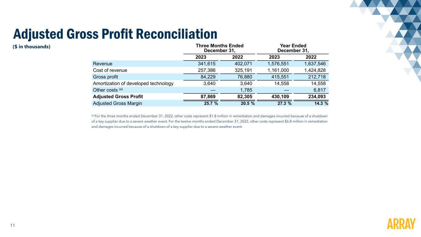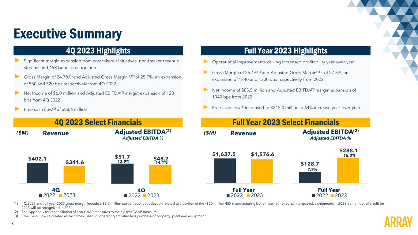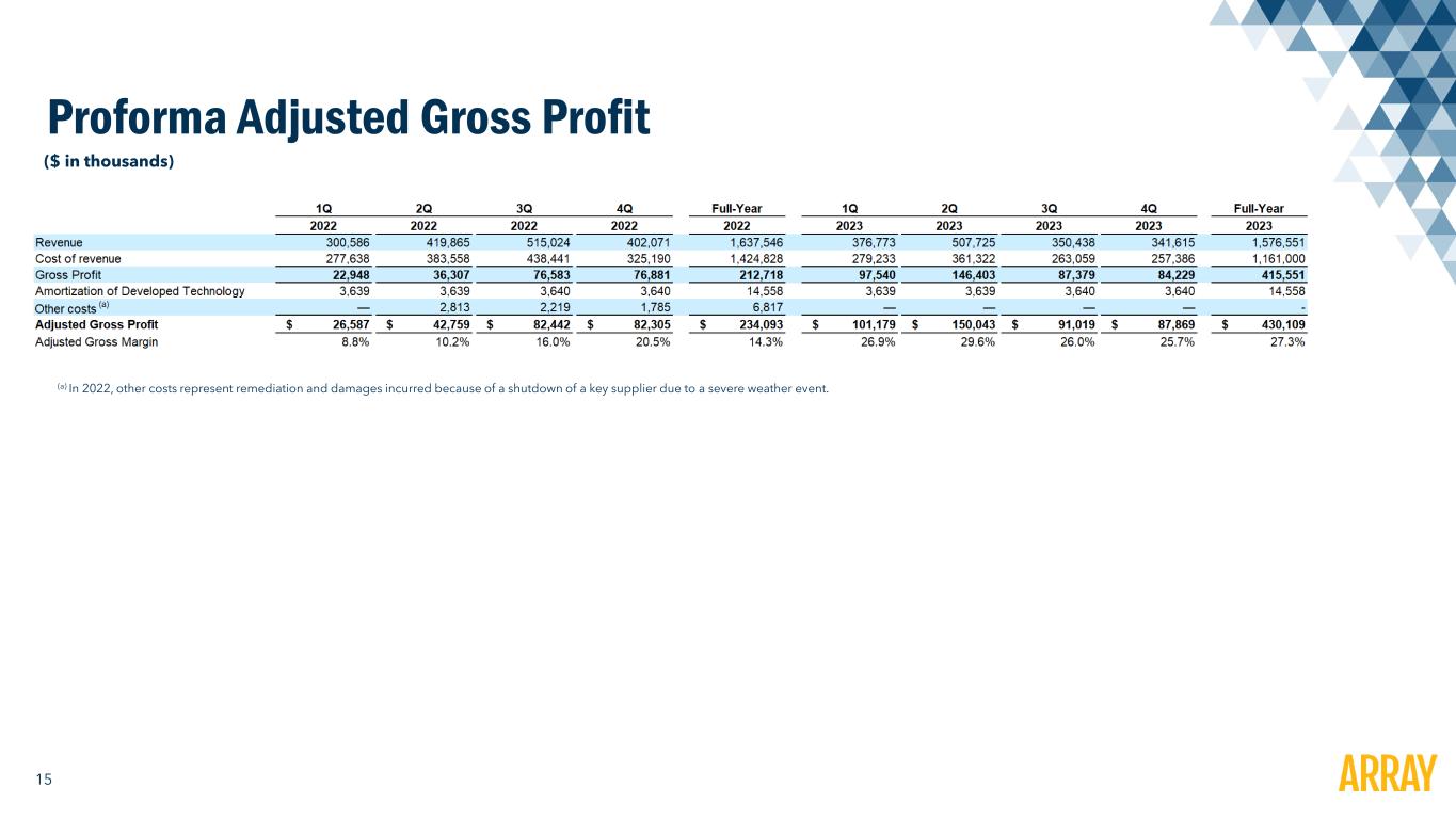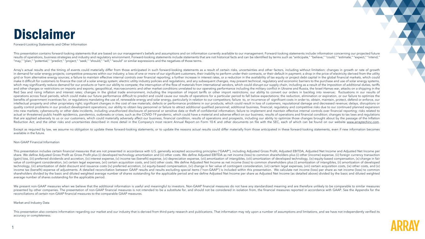 1 Disclaimer Forward-Looking Statements and Other Information This presentation contains forward-looking statements that are based on our management’s beliefs and assumptions and on information currently available to our management. Forward-looking statements include information concerning our projected future results of operations, business strategies and industry and regulatory environment. Forward-looking statements include statements that are not historical facts and can be identified by terms such as “anticipate,” “believe,” “could,” “estimate,” “expect,” “intend,” “may,” “plan,” “potential,” “predict,” “project,” "seek," “should,” “will,” “would” or similar expressions and the negatives of those terms. Array’s actual results and the timing of events could materially differ from those anticipated in such forward-looking statements as a result of certain risks, uncertainties and other factors, including without limitation: changes in growth or rate of growth in demand for solar energy projects; competitive pressures within our industry; a loss of one or more of our significant customers, their inability to perform under their contracts, or their default in payment; a drop in the price of electricity derived from the utility grid or from alternative energy sources; a failure to maintain effective internal controls over financial reporting; a further increase in interest rates, or a reduction in the availability of tax equity or project debt capital in the global financial markets, which could make it difficult for customers to finance the cost of a solar energy system; electric utility industry policies and regulations, and any subsequent changes, may present technical, regulatory and economic barriers to the purchase and use of solar energy systems, which may significantly reduce demand for our products or harm our ability to compete; the interruption of the flow of materials from international vendors, which could disrupt our supply chain, including as a result of the imposition of additional duties, tariffs and other charges or restrictions on imports and exports; geopolitical, macroeconomic and other market conditions unrelated to our operating performance including the military conflict in Ukraine and Russia, the Israel-Hamas war, attacks on a shipping in the Red Sea and rising inflation and interest rates; changes in the global trade environment, including the imposition of import tariffs or other import restrictions; our ability to convert our orders in backlog into revenue; fluctuations in our results of operations across fiscal periods, which could make our future performance difficult to predict and could cause our results of operations for a particular period to fall below expectations; the reduction, elimination or expiration, or our failure to optimize the benefits of government incentives for, or regulations mandating the use of, renewable energy and solar energy, particularly in relation to our competitors; failure to, or incurrence of significant costs in order to, obtain, maintain, protect, defend or enforce, our intellectual property and other proprietary right; significant changes in the cost of raw materials; defects or performance problems in our products, which could result in loss of customers, reputational damage and decreased revenue; delays, disruptions or quality control problems in our product development operations; our ability to obtain key personnel or failure to attract additional qualified personnel; additional business, financial, regulatory and competitive risks due to our continued planned expansion into new markets; cybersecurity or other data incidents, including unauthorized disclosure of personal or sensitive data or theft of confidential information; failure to implement and maintain effective internal controls over financial reporting; risks related to actual or threatened public health epidemics, pandemics, outbreaks or crises, such as the COVID-19 pandemic, which could have a material and adverse effect on our business, results of operations and financial condition; changes to tax laws and regulations that are applied adversely to us or our customers, which could materially adversely affect our business, financial condition, results of operations and prospects, including our ability to optimize those changes brought about by the passage of the Inflation Reduction Act; and the other risks and uncertainties described in more detail in the Company’s most recent Annual Report on Form 10-K and other documents on file with the SEC, each of which can be found on our website www.arraytechinc.com. Except as required by law, we assume no obligation to update these forward-looking statements, or to update the reasons actual results could differ materially from those anticipated in these forward-looking statements, even if new information becomes available in the future. Non-GAAP Financial Information This presentation includes certain financial measures that are not presented in accordance with U.S. generally accepted accounting principles (“GAAP”), including Adjusted Gross Profit, Adjusted EBITDA, Adjusted Net Income and Adjusted Net Income per share. We define Adjusted Gross Profit as Gross Profit plus (i) developed technology amortization and (ii) other costs. We define Adjusted EBITDA as net income (loss) to common shareholders plus (i) other (income) expense, (ii) foreign currency transaction (gain) loss, (iii) preferred dividends and accretion, (iv) interest expense, (v) income tax (benefit) expense, (vi) depreciation expense, (vii) amortization of intangibles, (viii) amortization of developed technology, (ix) equity-based compensation, (x) change in fair value of contingent consideration, (xi) certain legal expenses, (xii) certain acquisition costs, and (xiii) other costs. We define Adjusted Net Income as net income (loss) to common shareholders plus (i) amortization of intangible