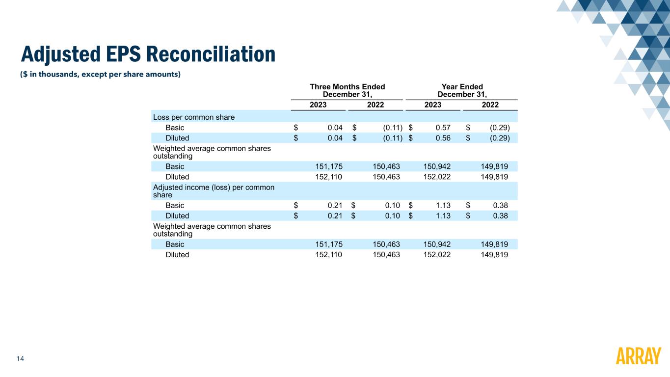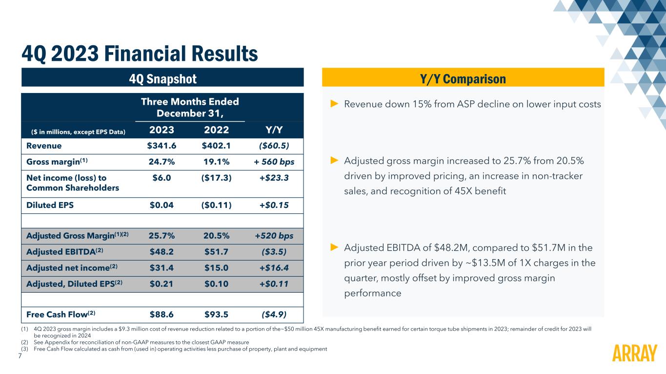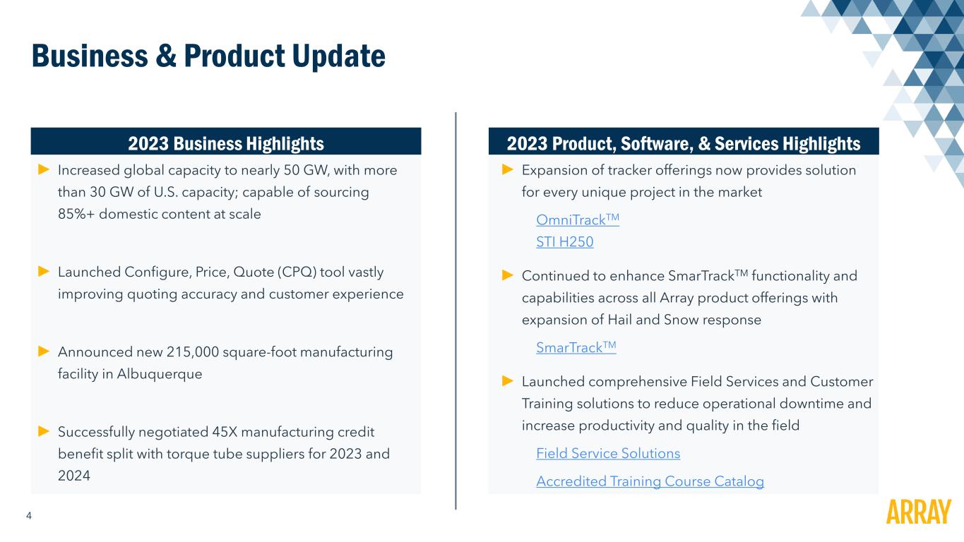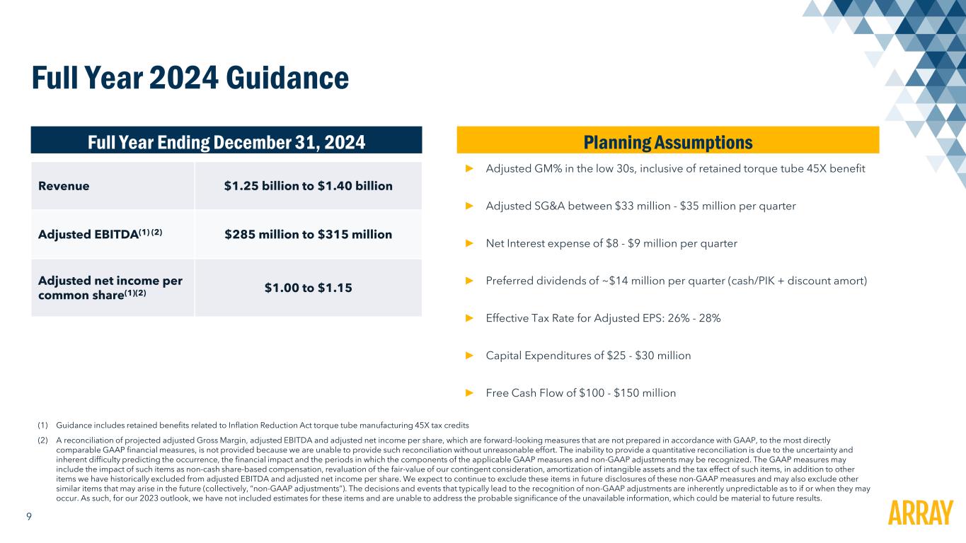 1 Disclaimer Forward-Looking Statements and Other Information This presentation contains forward-looking statements that are based on our management’s beliefs and assumptions and on information currently available to our management. Forward-looking statements include information concerning our projected future results of operations, business strategies and industry and regulatory environment. Forward-looking statements include statements that are not historical facts and can be identified by terms such as “anticipate,” “believe,” “could,” “estimate,” “expect,” “intend,” “may,” “plan,” “potential,” “predict,” “project,” "seek," “should,” “will,” “would” or similar expressions and the negatives of those terms. Array’s actual results and the timing of events could materially differ from those anticipated in such forward-looking statements as a result of certain risks, uncertainties and other factors, including without limitation: changes in growth or rate of growth in demand for solar energy projects; competitive pressures within our industry; a loss of one or more of our significant customers, their inability to perform under their contracts, or their default in payment; a drop in the price of electricity derived from the utility grid or from alternative energy sources; a failure to maintain effective internal controls over financial reporting; a further increase in interest rates, or a reduction in the availability of tax equity or project debt capital in the global financial markets, which could make it difficult for customers to finance the cost of a solar energy system; electric utility industry policies and regulations, and any subsequent changes, may present technical, regulatory and economic barriers to the purchase and use of solar energy systems, which may significantly reduce demand for our products or harm our ability to compete; the interruption of the flow of materials from international vendors, which could disrupt our supply chain, including as a result of the imposition of additional duties, tariffs and other charges or restrictions on imports and exports; geopolitical, macroeconomic and other market conditions unrelated to our operating performance including the military conflict in Ukraine and Russia, the Israel-Hamas war, attacks on a shipping in the Red Sea and rising inflation and interest rates; changes in the global trade environment, including the imposition of import tariffs or other import restrictions; our ability to convert our orders in backlog into revenue; fluctuations in our results of operations across fiscal periods, which could make our future performance difficult to predict and could cause our results of operations for a particular period to fall below expectations; the reduction, elimination or expiration, or our failure to optimize the benefits of government incentives for, or regulations mandating the use of, renewable energy and solar energy, particularly in relation to our competitors; failure to, or incurrence of significant costs in order to, obtain, maintain, protect, defend or enforce, our intellectual property and other proprietary right; significant changes in the cost of raw materials; defects or performance problems in our products, which could result in loss of customers, reputational damage and decreased revenue; delays, disruptions or quality control problems in our product development operations; our ability to obtain key personnel or failure to attract additional qualified personnel; additional business, financial, regulatory and competitive risks due to our continued planned expansion into new markets; cybersecurity or other data incidents, including unauthorized disclosure of personal or sensitive data or theft of confidential information; failure to implement and maintain effective internal controls over financial reporting; risks related to actual or threatened public health epidemics, pandemics, outbreaks or crises, such as the COVID-19 pandemic, which could have a material and adverse effect on our business, results of operations and financial condition; changes to tax laws and regulations that are applied adversely to us or our customers, which could materially adversely affect our business, financial condition, results of operations and prospects, including our ability to optimize those changes brought about by the passage of the Inflation Reduction Act; and the other risks and uncertainties described in more detail in the Company’s most recent Annual Report on Form 10-K and other documents on file with the SEC, each of which can be found on our website www.arraytechinc.com. Except as required by law, we assume no obligation to update these forward-looking statements, or to update the reasons actual results could differ materially from those anticipated in these forward-looking statements, even if new information becomes available in the future. Non-GAAP Financial Information This presentation includes certain financial measures that are not presented in accordance with U.S. generally accepted accounting principles (“GAAP”), including Adjusted Gross Profit, Adjusted EBITDA, Adjusted Net Income and Adjusted Net Income per share. We define Adjusted Gross Profit as Gross Profit plus (i) developed technology amortization and (ii) other costs. We define Adjusted EBITDA as net income (loss) to common shareholders plus (i) other (income) expense, (ii) foreign currency transaction (gain) loss, (iii) preferred dividends and accretion, (iv) interest expense, (v) income tax (benefit) expense, (vi) depreciation expense, (vii) amortization of intangibles, (viii) amortization of developed technology, (ix) equity-based compensation, (x) change in fair value of contingent consideration, (xi) certain legal expenses, (xii) certain acquisition costs, and (xiii) other costs. We define Adjusted Net Income as net income (loss) to common shareholders plus (i) amortization of intangible