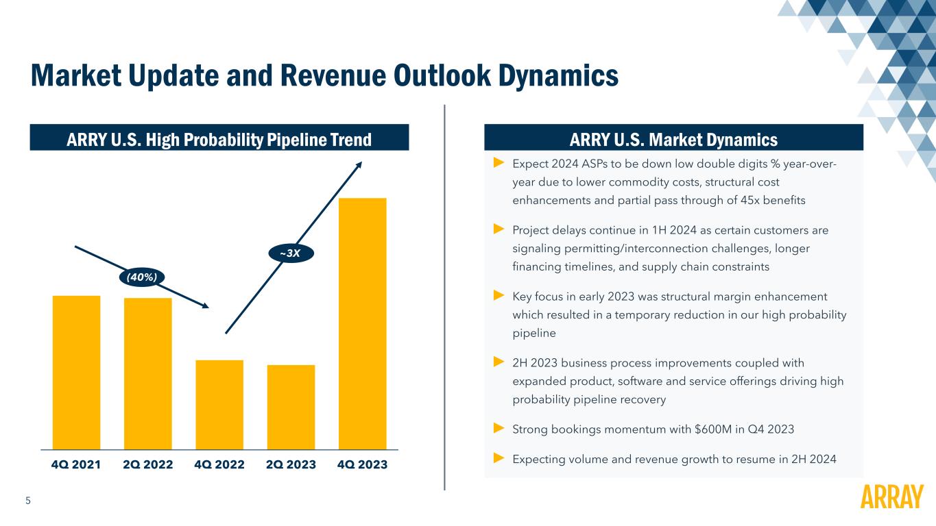 4 Business & Product Update 2023 Business Highlights 2023 Product, Software, & Services Highlights ► Increased global capacity to nearly 50 GW, with more than 30 GW of U.S. capacity; capable of sourcing 85%+ domestic content at scale ► Launched Configure, Price, Quote (CPQ) tool vastly improving quoting accuracy and customer experience ► Announced new 215,000 square-foot manufacturing facility in Albuquerque ► Successfully negotiated 45X manufacturing credit benefit split with torque tube suppliers for 2023 and 2024 ► Expansion of tracker offerings now provides solution for every unique project in the market OmniTrackTM STI H250 ► Continued to enhance SmarTrackTM functionality and capabilities across all Array product offerings with expansion of Hail and Snow response SmarTrackTM ► Launched comprehensive Field Services and Customer Training solutions to reduce operational downtime and increase productivity and quality in the field Field Service Solutions Accredited Training Course Catalog