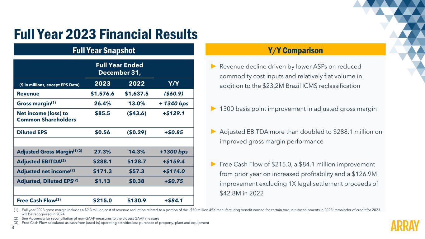 7 Three Months Ended December 31, ($ in millions, except EPS Data) 2023 2022 Y/Y Revenue $341.6 $402.1 ($60.5) Gross margin(1) 24.7% 19.1% + 560 bps Net income (loss) to Common Shareholders $6.0 ($17.3) +$23.3 Diluted EPS $0.04 ($0.11) +$0.15 Adjusted Gross Margin(1)(2) 25.7% 20.5% +520 bps Adjusted EBITDA(2) $48.2 $51.7 ($3.5) Adjusted net income(2) $31.4 $15.0 +$16.4 Adjusted, Diluted EPS(2) $0.21 $0.10 +$0.11 Free Cash Flow(2) $88.6 $93.5 ($4.9) 4Q 2023 Financial Results 4Q Snapshot Y/Y Comparison (1) 4Q 2023 gross margin includes a $9.3 million cost of revenue reduction related to a portion of the~$50 million 45X manufacturing benefit earned for certain torque tube shipments in 2023; remainder of credit for 2023 will be recognized in 2024 (2) See Appendix for reconciliation of non-GAAP measures to the closest GAAP measure (3) Free Cash Flow calculated as cash from (used in) operating activities less purchase of property, plant and equipment ► Revenue down 15% from ASP decline on lower input costs ► Adjusted gross margin increased to 25.7% from 20.5% driven by improved pricing, an increase in non-tracker sales, and recognition of 45X benefit ► Adjusted EBITDA of $48.2M, compared to $51.7M in the prior year period driven by ~$13.5M of 1X charges in the quarter, mostly offset by improved gross margin performance