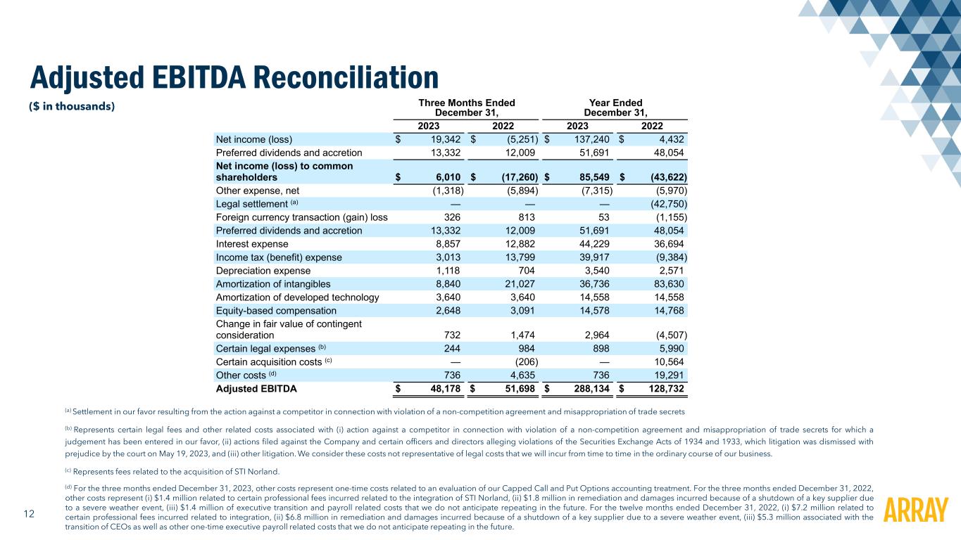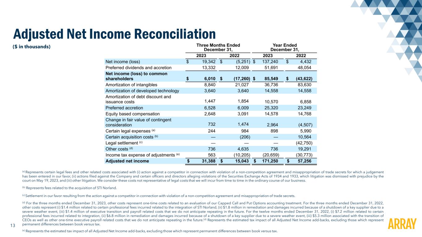 12 Adjusted EBITDA Reconciliation (a) Settlement in our favor resulting from the action against a competitor in connection with violation of a non-competition agreement and misappropriation of trade secrets (b) Represents certain legal fees and other related costs associated with (i) action against a competitor in connection with violation of a non-competition agreement and misappropriation of trade secrets for which a judgement has been entered in our favor, (ii) actions filed against the Company and certain officers and directors alleging violations of the Securities Exchange Acts of 1934 and 1933, which litigation was dismissed with prejudice by the court on May 19, 2023, and (iii) other litigation. We consider these costs not representative of legal costs that we will incur from time to time in the ordinary course of our business. (c) Represents fees related to the acquisition of STI Norland. (d) For the three months ended December 31, 2023, other costs represent one-time costs related to an evaluation of our Capped Call and Put Options accounting treatment. For the three months ended December 31, 2022, other costs represent (i) $1.4 million related to certain professional fees incurred related to the integration of STI Norland, (ii) $1.8 million in remediation and damages incurred because of a shutdown of a key supplier due to a severe weather event, (iii) $1.4 million of executive transition and payroll related costs that we do not anticipate repeating in the future. For the twelve months ended December 31, 2022, (i) $7.2 million related to certain professional fees incurred related to integration, (ii) $6.8 million in remediation and damages incurred because of a shutdown of a key supplier due to a severe weather event, (iii) $5.3 million associated with the transition of CEOs as well as other one-time executive payroll related costs that we do not anticipate repeating in the future. ($ in thousands) Three Months Ended December 31, Year Ended December 31, 2023 2022 2023 2022 Net income (loss) $ 19,342 $ (5,251) $ 137,240 $ 4,432 Preferred dividends and accretion 13,332 12,009 51,691 48,054 Net income (loss) to common shareholders $ 6,010 $ (17,260) $ 85,549 $ (43,622) Other expense, net (1,318) (5,894) (7,315) (5,970) Legal settlement (a) — — — (42,750) Foreign currency transaction (gain) loss 326 813 53 (1,155) Preferred dividends and accretion 13,332 12,009 51,691 48,054 Interest expense 8,857 12,882 44,229 36,694 Income tax (benefit) expense 3,013 13,799 39,917 (9,384) Depreciation expense 1,118 704 3,540 2,571 Amortization of intangibles 8,840 21,027 36,736 83,630 Amortization of developed technology 3,640 3,640 14,558 14,558 Equity-based compensation 2,648 3,091 14,578 14,768 Change in fair value of contingent consideration 732 1,474 2,964 (4,507) Certain legal expenses (b) 244 984 898 5,990 Certain acquisition costs (c) — (206) — 10,564 Other costs (d) 736 4,635 736 19,291 Adjusted EBITDA $ 48,178 $ 51,698 $ 288,134 $ 128,732