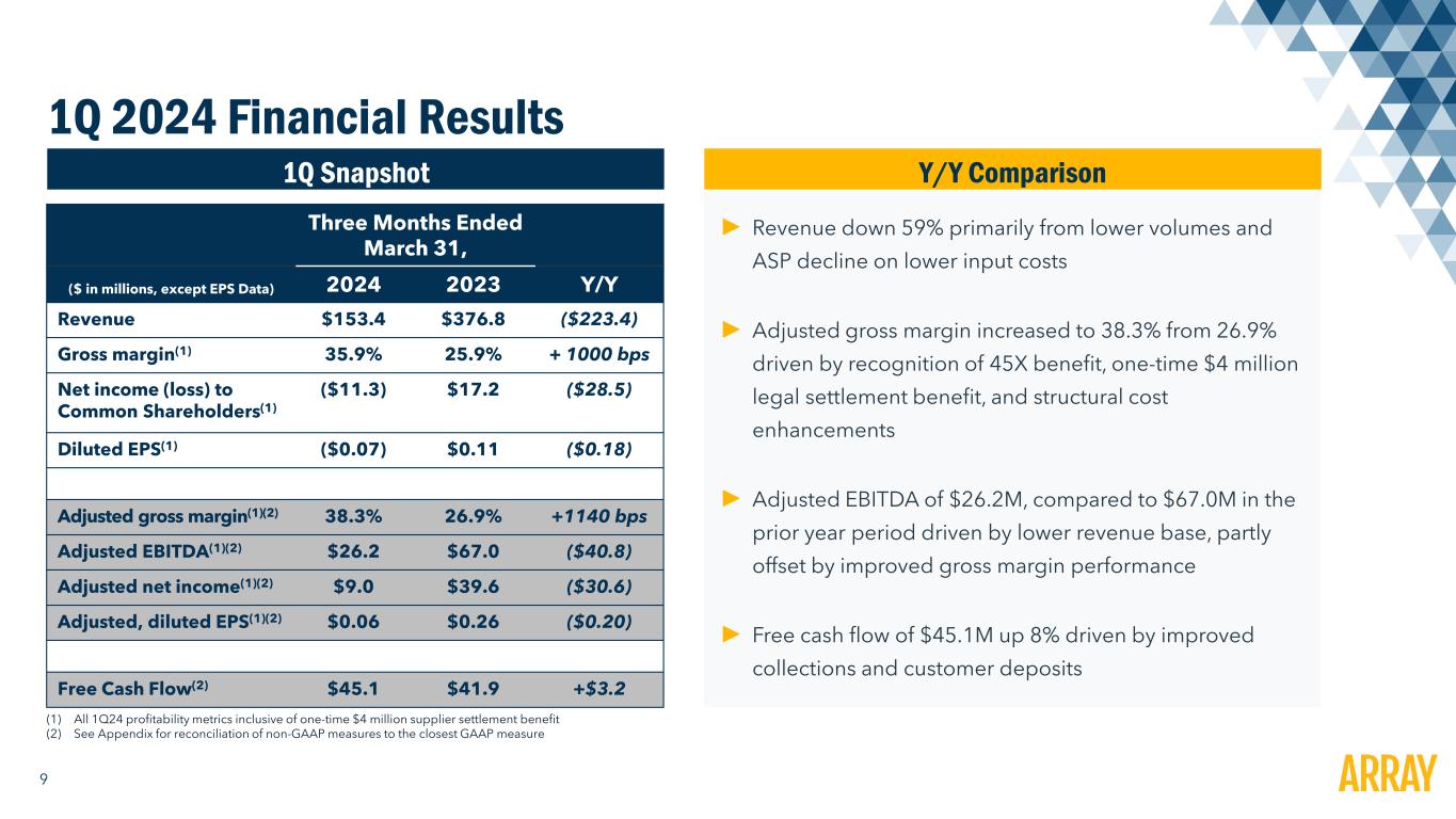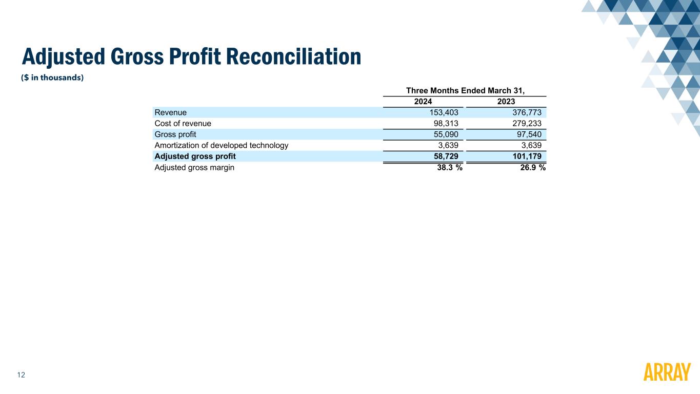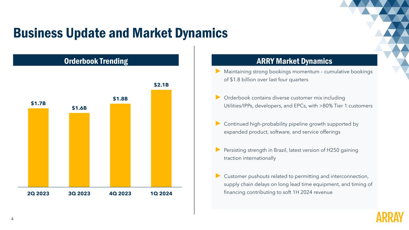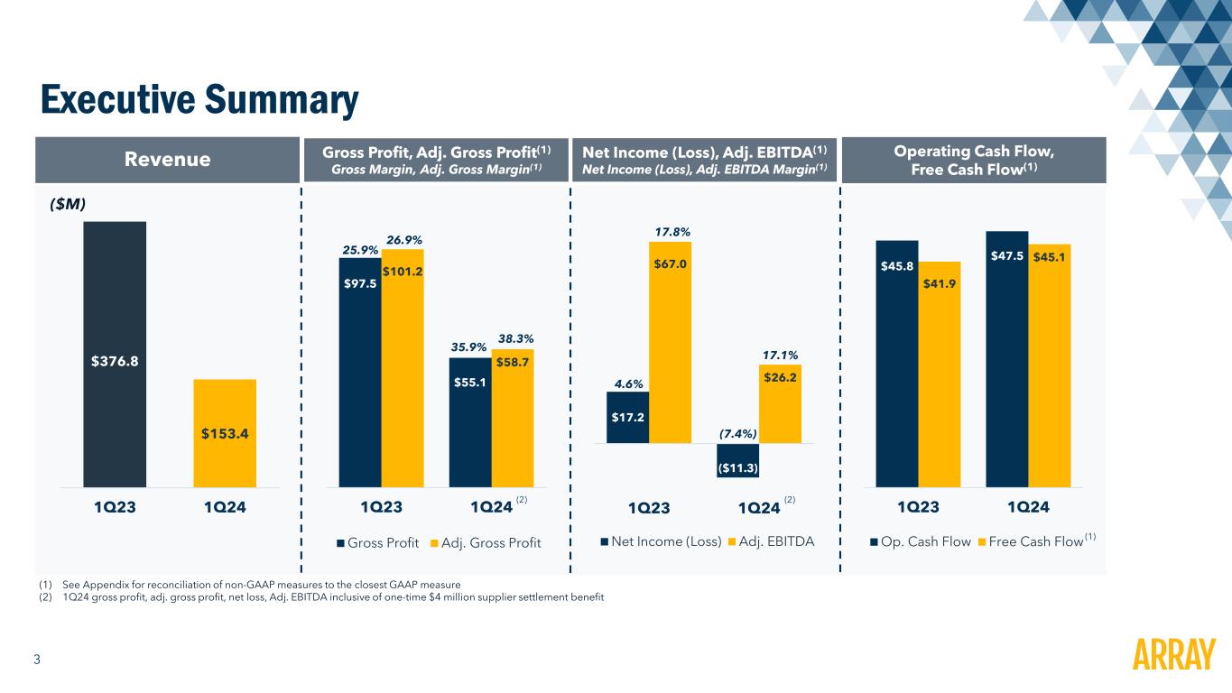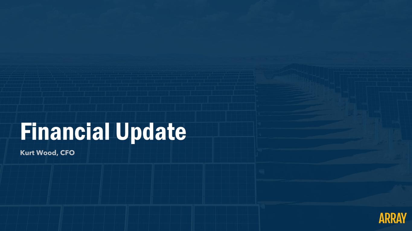 1 Disclaimer Forward-Looking Statements and Other Information This presentation contains forward-looking statements that are based on our management’s beliefs and assumptions and on information currently available to our management. Forward-looking statements include information concerning our projected future results of operations, sales volume, and industry and regulatory environment. Forward-looking statements include statements that are not historical facts and can be identified by terms such as “anticipate,” “believe,” “could,” “estimate,” “expect,” “intend,” “may,” “plan,” “potential,” “predict,” “project,” "seek," “should,” “will,” “would” or similar expressions and the negatives of those terms. Array’s actual results and the timing of events could materially differ from those anticipated in such forward-looking statements as a result of certain risks, uncertainties and other factors, including without limitation: changes in growth or rate of growth in demand for solar energy projects; competitive pressures within our industry; a loss of one or more of our significant customers, their inability to perform under their contracts, or their default in payment; a drop in the price of electricity derived from the utility grid or from alternative energy sources; a failure to maintain effective internal controls over financial reporting; a further increase in interest rates, or a reduction in the availability of tax equity or project debt capital in the global financial markets, which could make it difficult for customers to finance the cost of a solar energy system; electric utility industry policies and regulations, and any subsequent changes, may present technical, regulatory and economic barriers to the purchase and use of solar energy systems, which may significantly reduce demand for our products or harm our ability to compete; the interruption of the flow of materials from international vendors, which could disrupt our supply chain, including as a result of the imposition of additional duties, tariffs and other charges or restrictions on imports and exports; geopolitical, macroeconomic and other market conditions unrelated to our operating performance including the military conflict in Ukraine and Russia, the Israel-Hamas war, attacks on shipping in the Red Sea and rising inflation and interest rates; changes in the global trade environment, including the imposition of import tariffs or other import restrictions; our ability to convert our orders in backlog into revenue; fluctuations in our results of operations across fiscal periods, which could make our future performance difficult to predict and could cause our results of operations for a particular period to fall below expectations; the reduction, elimination or expiration, or our failure to optimize the benefits of government incentives for, or regulations mandating the use of, renewable energy and solar energy, particularly in relation to our competitors; failure to, or incurrence of significant costs in order to, obtain, maintain, protect, defend or enforce, our intellectual property and other proprietary right; significant changes in the cost of raw materials; defects or performance problems in our products, which could result in loss of customers, reputational damage and decreased revenue; delays, disruptions or quality control problems in our product development operations; our ability to obtain key personnel or failure to attract additional qualified personnel; additional business, financial, regulatory and competitive risks due to our continued planned expansion into new markets; cybersecurity or other data incidents, including unauthorized disclosure of personal or sensitive data or theft of confidential information; failure to implement and maintain effective internal controls over financial reporting; risks related to actual or threatened public health epidemics, pandemics, outbreaks or crises, such as the COVID-19 pandemic, which could have a material and adverse effect on our business, results of operations and financial condition; changes to tax laws and regulations that are applied adversely to us or our customers, which could materially adversely affect our business, financial condition, results of operations and prospects, including our ability to optimize those changes brought about by the passage of the Inflation Reduction Act; and the other risks and uncertainties described in more detail in the Company’s most recent Annual Report on Form 10-K and other documents on file with the SEC, each of which can be found on our website www.arraytechinc.com. Except as required by law, we assume no obligation to update these forward-looking statements, or to update the reasons actual results could differ materially from those anticipated in these forward-looking statements, even if new information becomes available in the future. Non-GAAP Financial Information This presentation includes certain financial measures that are not presented in accordance with U.S. generally accepted accounting principles (“GAAP”), including Adjusted Gross Profit, Adjusted EBITDA, Adjusted Net Income, Adjusted Net Income per share, and Free Cash Flow. We define Adjusted Gross Profit as Gross Profit plus (i) developed technology amortization and (ii) other costs. We define Adjusted EBITDA as net income (loss) to common shareholders plus (i) other (income) expense, (ii) foreign currency transaction (gain) loss, (iii) preferred dividends and accretion, (iv) interest expense, (v) income tax (benefit) expense, (vi) depreciation expense, (vii) amortization of intangibles, (viii) amortization of developed technology, (ix) equity-based compensation, (x) change in fair value of contingent consideration, (xi) certain legal expenses, (xii) certain acquisition costs, and (xiii) other costs. We define Adjusted Net Income as net income (loss) to common shareholders plus (i) amortization of i