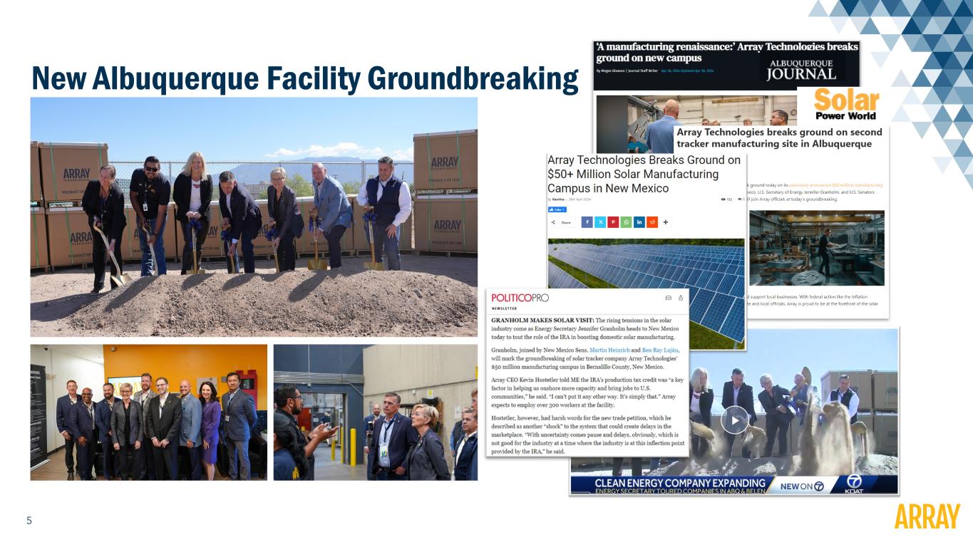 4 Orderbook Trending Business Update and Market Dynamics ARRY Market Dynamics ► Maintaining strong bookings momentum – cumulative bookings of $1.8 billion over last four quarters ► Orderbook contains diverse customer mix including Utilities/IPPs, developers, and EPCs, with >80% Tier 1 customers ► Continued high-probability pipeline growth supported by expanded product, software, and service offerings ► Persisting strength in Brazil, latest version of H250 gaining traction internationally ► Customer pushouts related to permitting and interconnection, supply chain delays on long lead time equipment, and timing of financing contributing to soft 1H 2024 revenue $1.7B $1.6B $1.8B $2.1B 2Q 2023 3Q 2023 4Q 2023 1Q 2024