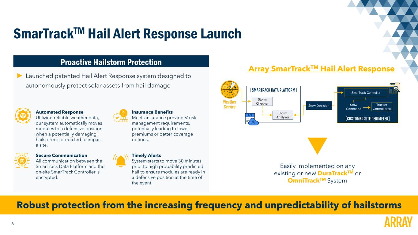 6 Proactive Hailstorm Protection ► Launched patented Hail Alert Response system designed to autonomously protect solar assets from hail damage SmarTrackTM Hail Alert Response Launch Automated Response Utilizing reliable weather data, our system automatically moves modules to a defensive position when a potentially damaging hailstorm is predicted to impact a site. Secure Communication All communication between the SmarTrack Data Platform and the on-site SmarTrack Controller is encrypted. Insurance Benefits Meets insurance providers’ risk management requirements, potentially leading to lower premiums or better coverage options. Timely Alerts System starts to move 30 minutes prior to high probability predicted hail to ensure modules are ready in a defensive position at the time of the event. Array SmarTrackTM Hail Alert Response Robust protection from the increasing frequency and unpredictability of hailstorms Easily implemented on any existing or new DuraTrackTM or OmniTrackTM System