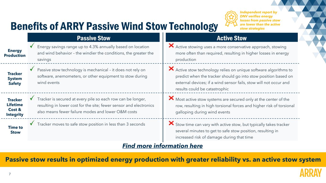 7 Benefits of ARRY Passive Wind Stow Technology Energy savings range up to 4.3% annually based on location and wind behavior – the windier the conditions, the greater the savings Passive stow technology is mechanical – it does not rely on software, anemometers, or other equipment to stow during wind events Tracker is secured at every pile so each row can be longer, resulting in lower cost for the site; fewer sensor and electronics also means fewer failure modes and lower O&M costs Tracker moves to safe stow position in less than 3 seconds Passive Stow Active stowing uses a more conservative approach, stowing more often than required, resulting in higher losses in energy production Active stow technology relies on unique software algorithms to predict when the tracker should go into stow position based on external devices; if a wind sensor fails, stow will not occur and results could be catastrophic Most active stow systems are secured only at the center of the row, resulting in high torsional forces and higher risk of torsional galloping during wind events Stow time can vary with active stow, but typically takes tracker several minutes to get to safe stow position, resulting in increased risk of damage during that time Active Stow Passive stow results in optimized energy production with greater reliability vs. an active stow system Independent report by DNV verifies energy losses from passive stow are lower than the active stow strategies Energy Production Tracker System Safety Tracker Lifetime Cost & Integrity Time to Stow Find more information here