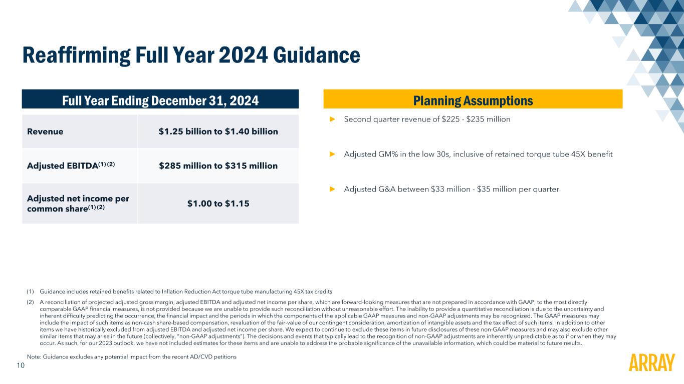 9 Three Months Ended March 31, ($ in millions, except EPS Data) 2024 2023 Y/Y Revenue $153.4 $376.8 ($223.4) Gross margin(1) 35.9% 25.9% + 1000 bps Net income (loss) to Common Shareholders(1) ($11.3) $17.2 ($28.5) Diluted EPS(1) ($0.07) $0.11 ($0.18) Adjusted gross margin(1)(2) 38.3% 26.9% +1140 bps Adjusted EBITDA(1)(2) $26.2 $67.0 ($40.8) Adjusted net income(1)(2) $9.0 $39.6 ($30.6) Adjusted, diluted EPS(1)(2) $0.06 $0.26 ($0.20) Free Cash Flow(2) $45.1 $41.9 +$3.2 1Q 2024 Financial Results 1Q Snapshot Y/Y Comparison (1) All 1Q24 profitability metrics inclusive of one-time $4 million supplier settlement benefit (2) See Appendix for reconciliation of non-GAAP measures to the closest GAAP measure ► Revenue down 59% primarily from lower volumes and ASP decline on lower input costs ► Adjusted gross margin increased to 38.3% from 26.9% driven by recognition of 45X benefit, one-time $4 million legal settlement benefit, and structural cost enhancements ► Adjusted EBITDA of $26.2M, compared to $67.0M in the prior year period driven by lower revenue base, partly offset by improved gross margin performance ► Free cash flow of $45.1M up 8% driven by improved collections and customer deposits