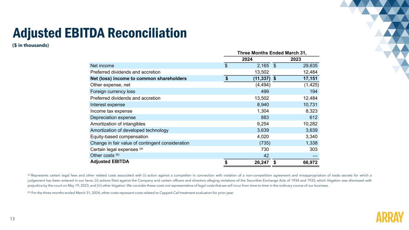 12 Adjusted Gross Profit Reconciliation ($ in thousands) Three Months Ended March 31, 2024 2023 Revenue 153,403 376,773 Cost of revenue 98,313 279,233 Gross profit 55,090 97,540 Amortization of developed technology 3,639 3,639 Adjusted gross profit 58,729 101,179 Adjusted gross margin 38.3 % 26.9 %