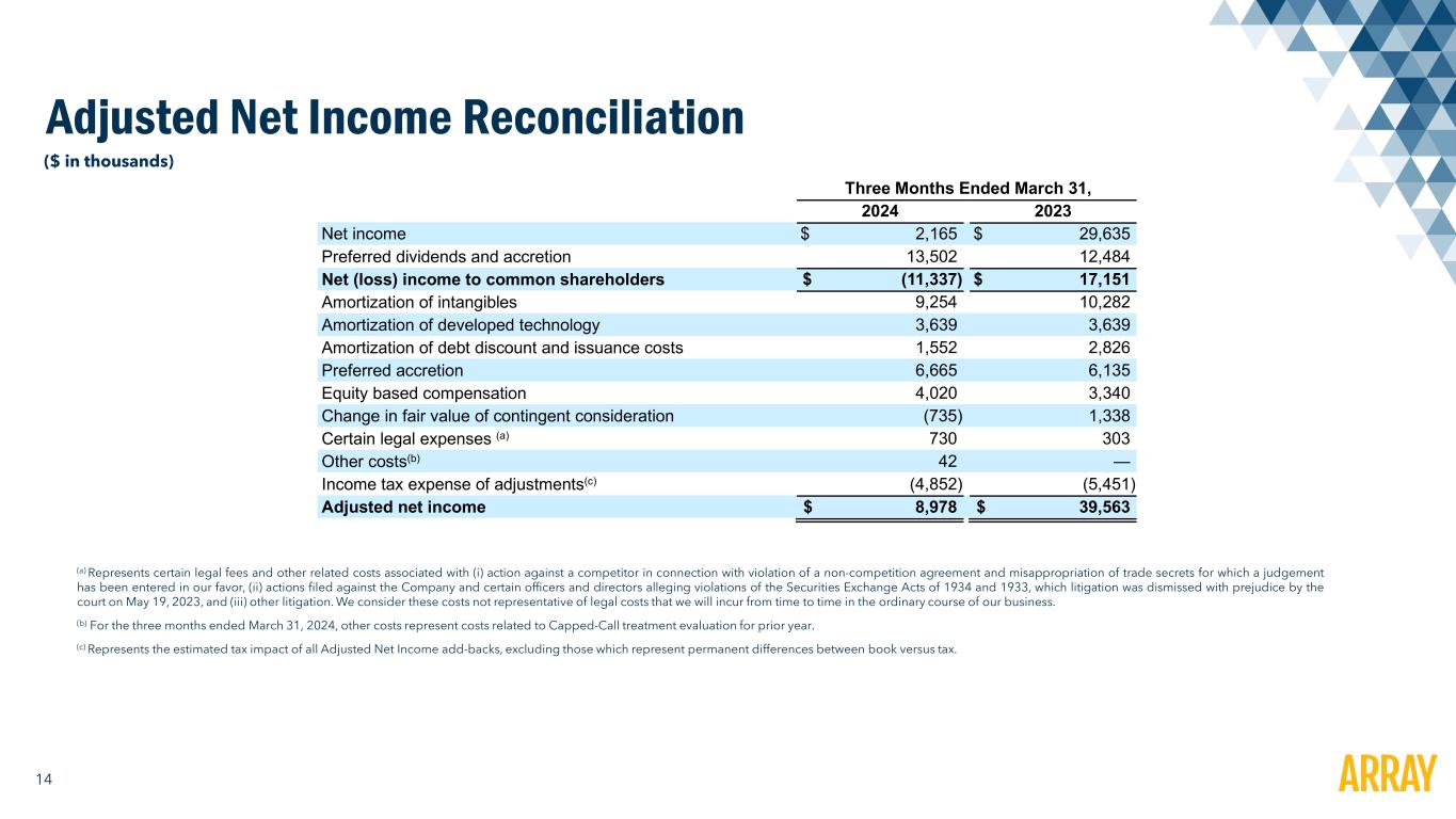 13 Adjusted EBITDA Reconciliation (a) Represents certain legal fees and other related costs associated with (i) action against a competitor in connection with violation of a non-competition agreement and misappropriation of trade secrets for which a judgement has been entered in our favor, (ii) actions filed against the Company and certain officers and directors alleging violations of the Securities Exchange Acts of 1934 and 1933, which litigation was dismissed with prejudice by the court on May 19, 2023, and (iii) other litigation. We consider these costs not representative of legal costs that we will incur from time to time in the ordinary course of our business. (b) For the three months ended March 31, 2024, other costs represent costs related to Capped-Call treatment evaluation for prior year. ($ in thousands) Three Months Ended March 31, 2024 2023 Net income $ 2,165 $ 29,635 Preferred dividends and accretion 13,502 12,484 Net (loss) income to common shareholders $ (11,337) $ 17,151 Other expense, net (4,494) (1,425) Foreign currency loss 499 194 Preferred dividends and accretion 13,502 12,484 Interest expense 8,940 10,731 Income tax expense 1,304 8,323 Depreciation expense 883 612 Amortization of intangibles 9,254 10,282 Amortization of developed technology 3,639 3,639 Equity-based compensation 4,020 3,340 Change in fair value of contingent consideration (735) 1,338 Certain legal expenses (a) 730 303 Other costs (b) 42 — Adjusted EBITDA $ 26,247 $ 66,972