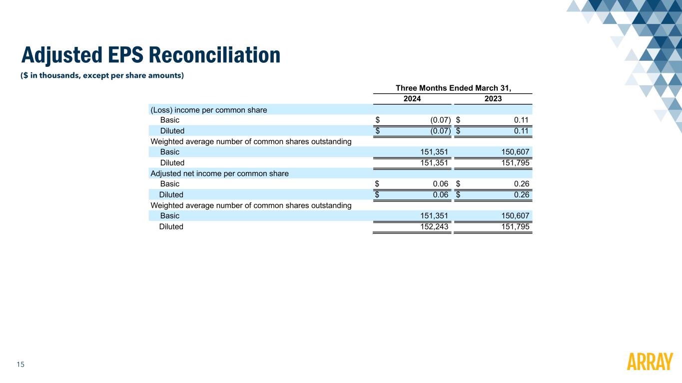 14 Adjusted Net Income Reconciliation (a) Represents certain legal fees and other related costs associated with (i) action against a competitor in connection with violation of a non-competition agreement and misappropriation of trade secrets for which a judgement has been entered in our favor, (ii) actions filed against the Company and certain officers and directors alleging violations of the Securities Exchange Acts of 1934 and 1933, which litigation was dismissed with prejudice by the court on May 19, 2023, and (iii) other litigation. We consider these costs not representative of legal costs that we will incur from time to time in the ordinary course of our business. (b) For the three months ended March 31, 2024, other costs represent costs related to Capped-Call treatment evaluation for prior year. (c) Represents the estimated tax impact of all Adjusted Net Income add-backs, excluding those which represent permanent differences between book versus tax. ($ in thousands) Three Months Ended March 31, 2024 2023 Net income $ 2,165 $ 29,635 Preferred dividends and accretion 13,502 12,484 Net (loss) income to common shareholders $ (11,337) $ 17,151 Amortization of intangibles 9,254 10,282 Amortization of developed technology 3,639 3,639 Amortization of debt discount and issuance costs 1,552 2,826 Preferred accretion 6,665 6,135 Equity based compensation 4,020 3,340 Change in fair value of contingent consideration (735) 1,338 Certain legal expenses (a) 730 303 Other costs(b) 42 — Income tax expense of adjustments(c) (4,852) (5,451) Adjusted net income $ 8,978 $ 39,563