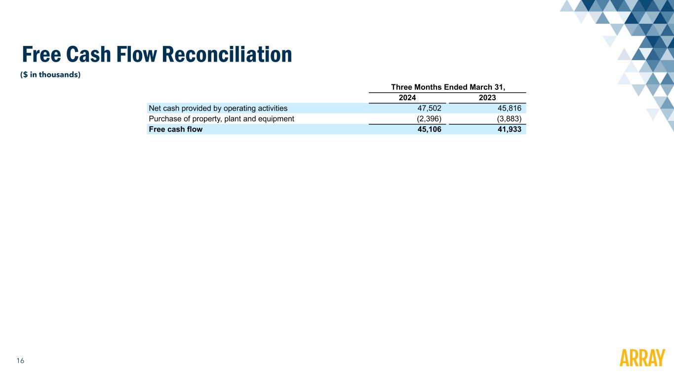 15 Adjusted EPS Reconciliation ($ in thousands, except per share amounts) Three Months Ended March 31, 2024 2023 (Loss) income per common share Basic $ (0.07) $ 0.11 Diluted $ (0.07) $ 0.11 Weighted average number of common shares outstanding Basic 151,351 150,607 Diluted 151,351 151,795 Adjusted net income per common share Basic $ 0.06 $ 0.26 Diluted $ 0.06 $ 0.26 Weighted average number of common shares outstanding Basic 151,351 150,607 Diluted 152,243 151,795