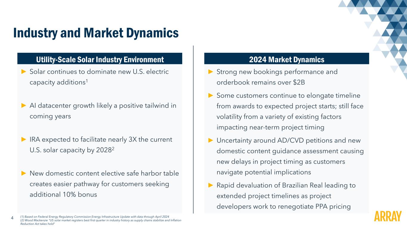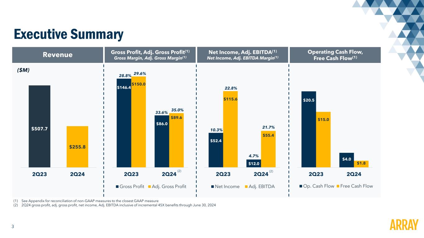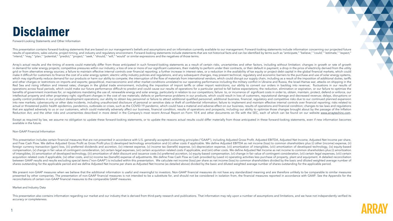 1 Disclaimer Forward-Looking Statements and Other Information This presentation contains forward-looking statements that are based on our management’s beliefs and assumptions and on information currently available to our management. Forward-looking statements include information concerning our projected future results of operations, sales volume, project timing, and industry and regulatory environment. Forward-looking statements include statements that are not historical facts and can be identified by terms such as “anticipate,” “believe,” “could,” “estimate,” “expect,” “intend,” “may,” “plan,” “potential,” “predict,” “project,” "seek," “should,” “will,” “would” or similar expressions and the negatives of those terms. Array’s actual results and the timing of events could materially differ from those anticipated in such forward-looking statements as a result of certain risks, uncertainties and other factors, including without limitation: changes in growth or rate of growth in demand for solar energy projects; competitive pressures within our industry; a loss of one or more of our significant customers, their inability to perform under their contracts, or their default in payment; a drop in the price of electricity derived from the utility grid or from alternative energy sources; a failure to maintain effective internal controls over financial reporting; a further increase in interest rates, or a reduction in the availability of tax equity or project debt capital in the global financial markets, which could make it difficult for customers to finance the cost of a solar energy system; electric utility industry policies and regulations, and any subsequent changes, may present technical, regulatory and economic barriers to the purchase and use of solar energy systems, which may significantly reduce demand for our products or harm our ability to compete; the interruption of the flow of materials from international vendors, which could disrupt our supply chain, including as a result of the imposition of additional duties, tariffs and other charges or restrictions on imports and exports; geopolitical, macroeconomic and other market conditions unrelated to our operating performance including the military conflict in Ukraine and Russia, the Israel-Hamas war, attacks on shipping in the Red Sea and rising inflation and interest rates; changes in the global trade environment, including the imposition of import tariffs or other import restrictions; our ability to convert our orders in backlog into revenue; fluctuations in our results of operations across fiscal periods, which could make our future performance difficult to predict and could cause our results of operations for a particular period to fall below expectations; the reduction, elimination or expiration, or our failure to optimize the benefits of government incentives for, or regulations mandating the use of, renewable energy and solar energy, particularly in relation to our competitors; failure to, or incurrence of significant costs in order to, obtain, maintain, protect, defend or enforce, our intellectual property and other proprietary right; significant changes in the cost of raw materials; defects or performance problems in our products, which could result in loss of customers, reputational damage and decreased revenue; delays, disruptions or quality control problems in our product development operations; our ability to obtain key personnel or failure to attract additional qualified personnel; additional business, financial, regulatory and competitive risks due to our continued planned expansion into new markets; cybersecurity or other data incidents, including unauthorized disclosure of personal or sensitive data or theft of confidential information; failure to implement and maintain effective internal controls over financial reporting; risks related to actual or threatened public health epidemics, pandemics, outbreaks or crises, such as the COVID-19 pandemic, which could have a material and adverse effect on our business, results of operations and financial condition; changes to tax laws and regulations that are applied adversely to us or our customers, which could materially adversely affect our business, financial condition, results of operations and prospects, including our ability to optimize those changes brought about by the passage of the Inflation Reduction Act; and the other risks and uncertainties described in more detail in the Company’s most recent Annual Report on Form 10-K and other documents on file with the SEC, each of which can be found on our website www.arraytechinc.com. Except as required by law, we assume no obligation to update these forward-looking statements, or to update the reasons actual results could differ materially from those anticipated in these forward-looking statements, even if new information becomes available in the future. Non-GAAP Financial Information This presentation includes certain financial measures that are not presented in accordance with U.S. generally accepted accounting principles (“GAAP”), including Adjusted Gross Profit, Adjusted EBITDA, Adjusted Net Income, Adjusted Net Income per share, and Free Cash Flow. We define Adjusted Gross Profit as Gross Profit plus (i) developed technology amortization and (ii) other costs if applicable. We define Adjusted EBITDA as net income (loss) to common shareholders plus (i) other (income) expense, (ii) foreign currency transaction (gain) loss, (iii) preferred dividends and accretion, (iv) interest expense, (v) income tax (benefit) expense, (vi) depreciation expense, (vii) amortization of intangibles, (viii) amortization of developed technology, (ix) equity-based compensation, (x) change in fair value of contingent consideration, (xi) certain legal expenses, (xii) certain acquisition related costs if applicable, and (xiii) other costs. We define Adjusted Net Income as net income to c