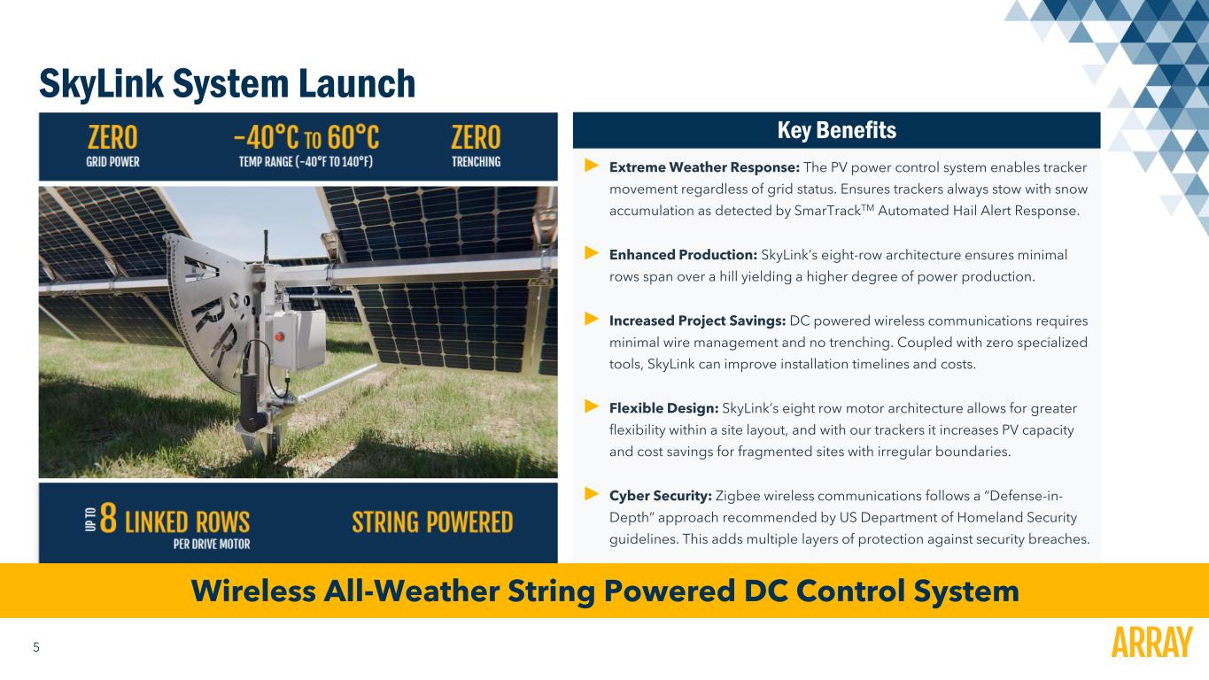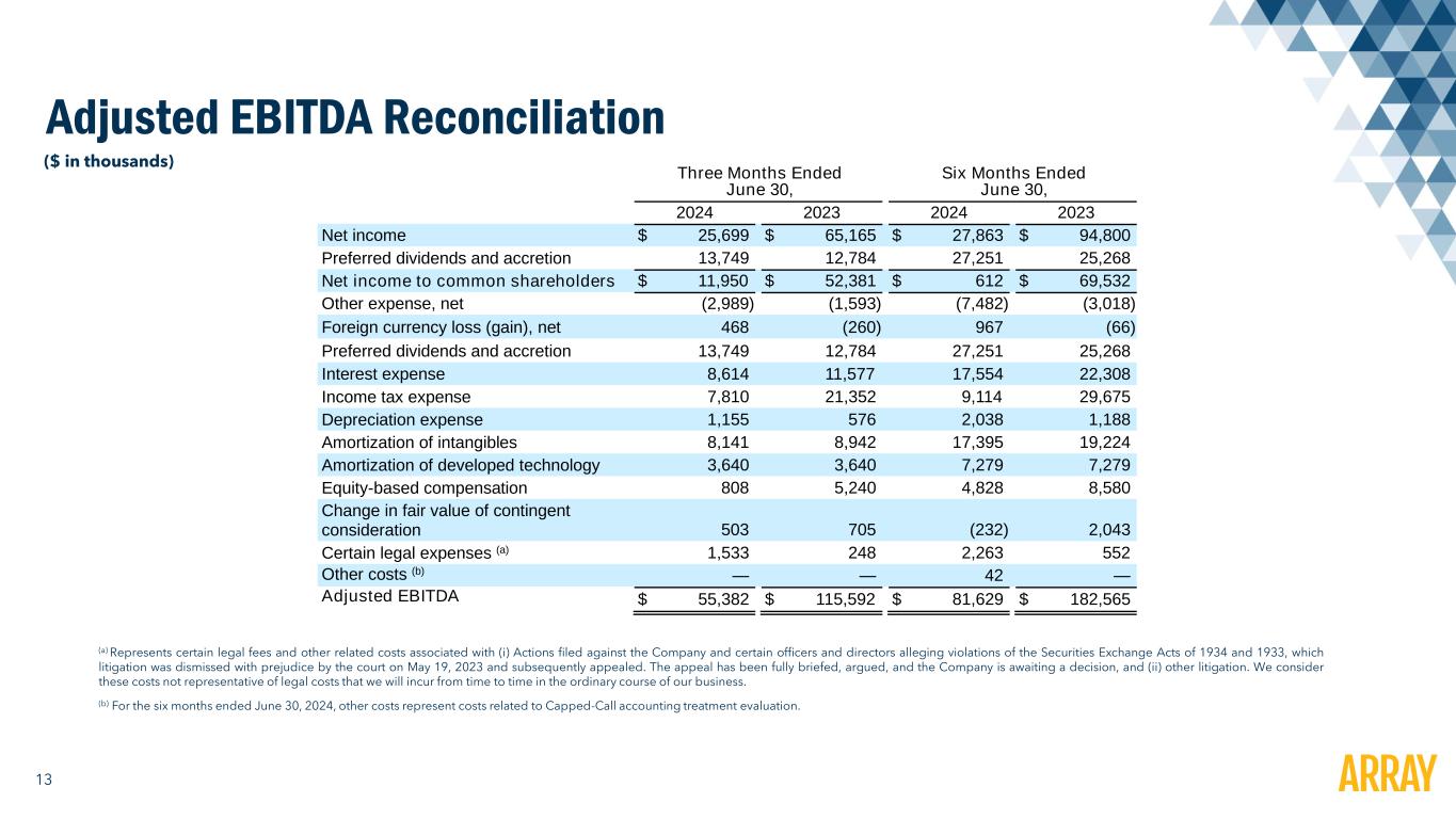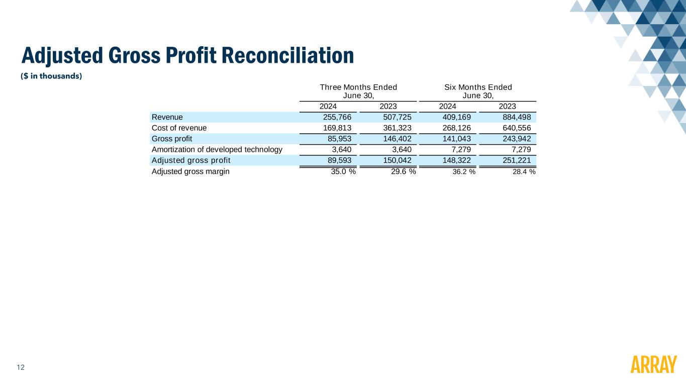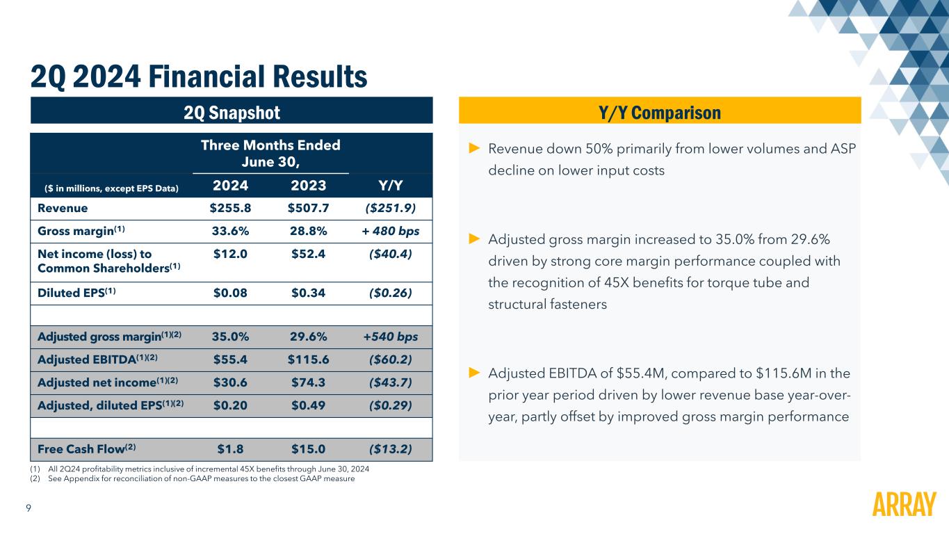 1 Disclaimer Forward-Looking Statements and Other Information This presentation contains forward-looking statements that are based on our management’s beliefs and assumptions and on information currently available to our management. Forward-looking statements include information concerning our projected future results of operations, sales volume, project timing, and industry and regulatory environment. Forward-looking statements include statements that are not historical facts and can be identified by terms such as “anticipate,” “believe,” “could,” “estimate,” “expect,” “intend,” “may,” “plan,” “potential,” “predict,” “project,” "seek," “should,” “will,” “would” or similar expressions and the negatives of those terms. Array’s actual results and the timing of events could materially differ from those anticipated in such forward-looking statements as a result of certain risks, uncertainties and other factors, including without limitation: changes in growth or rate of growth in demand for solar energy projects; competitive pressures within our industry; a loss of one or more of our significant customers, their inability to perform under their contracts, or their default in payment; a drop in the price of electricity derived from the utility grid or from alternative energy sources; a failure to maintain effective internal controls over financial reporting; a further increase in interest rates, or a reduction in the availability of tax equity or project debt capital in the global financial markets, which could make it difficult for customers to finance the cost of a solar energy system; electric utility industry policies and regulations, and any subsequent changes, may present technical, regulatory and economic barriers to the purchase and use of solar energy systems, which may significantly reduce demand for our products or harm our ability to compete; the interruption of the flow of materials from international vendors, which could disrupt our supply chain, including as a result of the imposition of additional duties, tariffs and other charges or restrictions on imports and exports; geopolitical, macroeconomic and other market conditions unrelated to our operating performance including the military conflict in Ukraine and Russia, the Israel-Hamas war, attacks on shipping in the Red Sea and rising inflation and interest rates; changes in the global trade environment, including the imposition of import tariffs or other import restrictions; our ability to convert our orders in backlog into revenue; fluctuations in our results of operations across fiscal periods, which could make our future performance difficult to predict and could cause our results of operations for a particular period to fall below expectations; the reduction, elimination or expiration, or our failure to optimize the benefits of government incentives for, or regulations mandating the use of, renewable energy and solar energy, particularly in relation to our competitors; failure to, or incurrence of significant costs in order to, obtain, maintain, protect, defend or enforce, our intellectual property and other proprietary right; significant changes in the cost of raw materials; defects or performance problems in our products, which could result in loss of customers, reputational damage and decreased revenue; delays, disruptions or quality control problems in our product development operations; our ability to obtain key personnel or failure to attract additional qualified personnel; additional business, financial, regulatory and competitive risks due to our continued planned expansion into new markets; cybersecurity or other data incidents, including unauthorized disclosure of personal or sensitive data or theft of confidential information; failure to implement and maintain effective internal controls over financial reporting; risks related to actual or threatened public health epidemics, pandemics, outbreaks or crises, such as the COVID-19 pandemic, which could have a material and adverse effect on our business, results of operations and financial condition; changes to tax laws and regulations that are applied adversely to us or our customers, which could materially adversely affect our business, financial condition, results of operations and prospects, including our ability to optimize those changes brought about by the passage of the Inflation Reduction Act; and the other risks and uncertainties described in more detail in the Company’s most recent Annual Report on Form 10-K and other documents on file with the SEC, each of which can be found on our website www.arraytechinc.com. Except as required by law, we assume no obligation to update these forward-looking statements, or to update the reasons actual results could differ materially from those anticipated in these forward-looking statements, even if new information becomes available in the future. Non-GAAP Financial Information This presentation includes certain financial measures that are not presented in accordance with U.S. generally accepted accounting principles (“GAAP”), including Adjusted Gross Profit, Adjusted EBITDA, Adjusted Net Income, Adjusted Net Income per share, and Free Cash Flow. We define Adjusted Gross Profit as Gross Profit plus (i) developed technology amortization and (ii) other costs if applicable. We define Adjusted EBITDA as net income (loss) to common shareholders plus (i) other (income) expense, (ii) foreign currency transaction (gain) loss, (iii) preferred dividends and accretion, (iv) interest expense, (v) income tax (benefit) expense, (vi) depreciation expense, (vii) amortization of intangibles, (viii) amortization of developed technology, (ix) equity-based compensation, (x) change in fair value of contingent consideration, (xi) certain legal expenses, (xii) certain acquisition related costs if applicable, and (xiii) other costs. We define Adjusted Net Income as net income to c